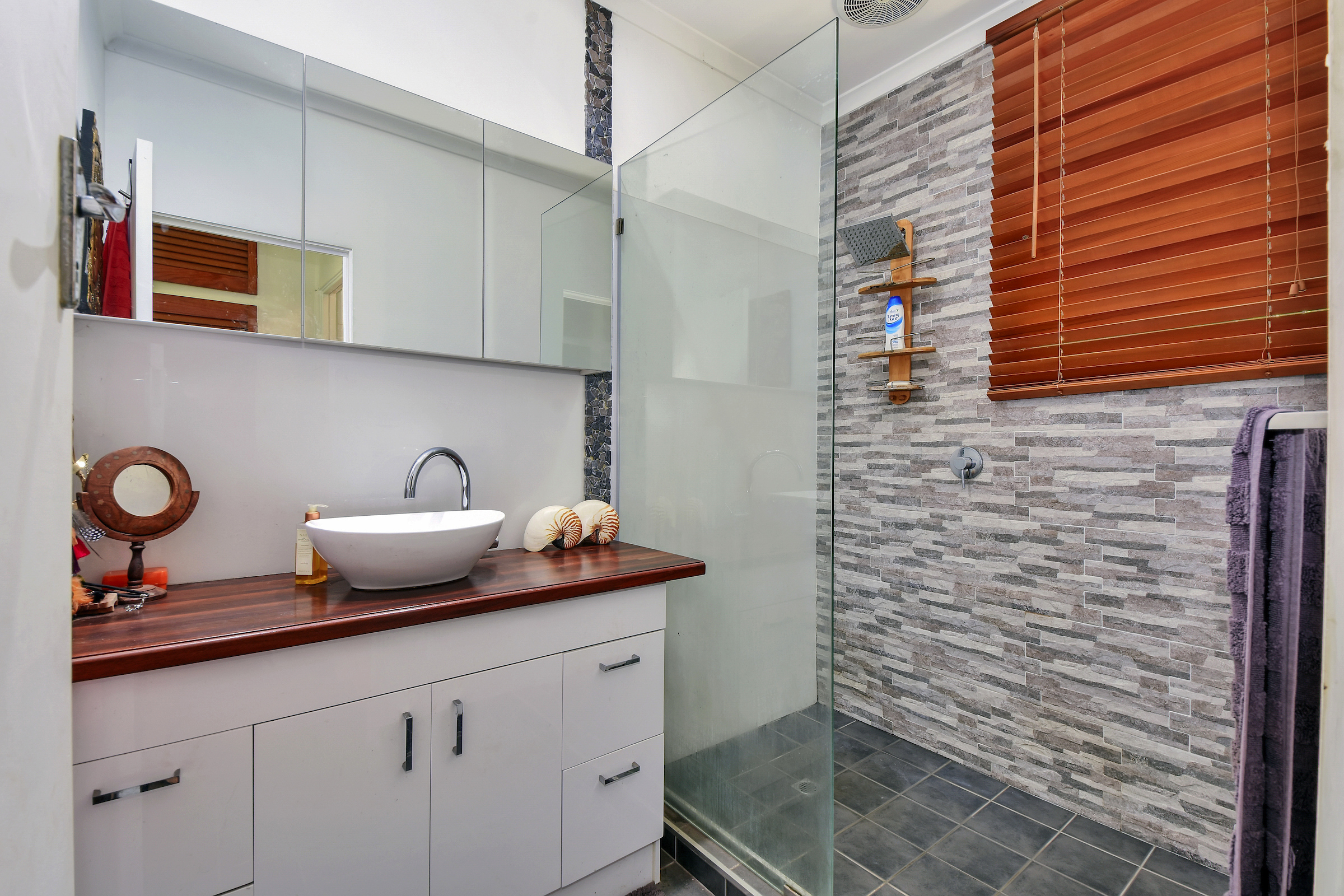 -Modernised main bathroom includes feature tiles and timber topped vanity