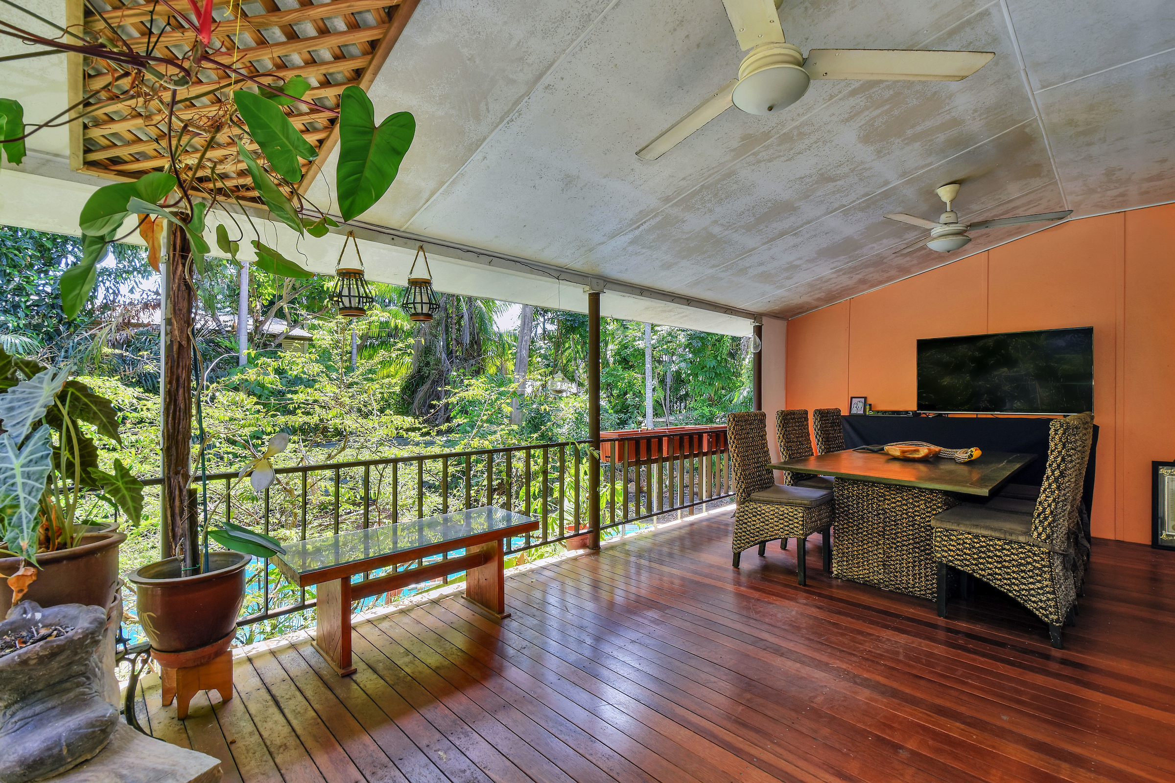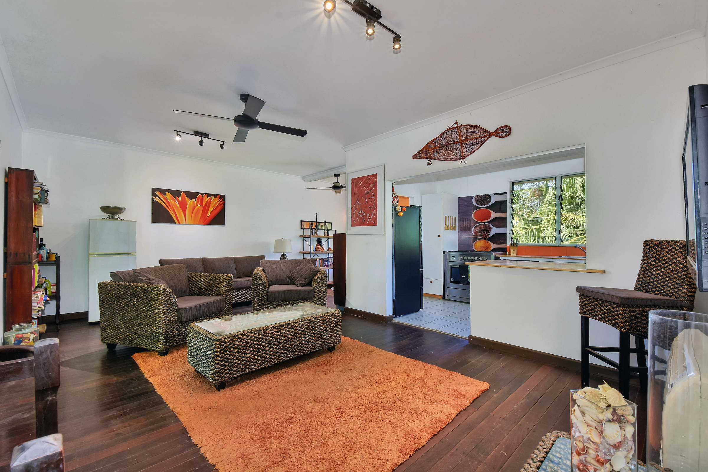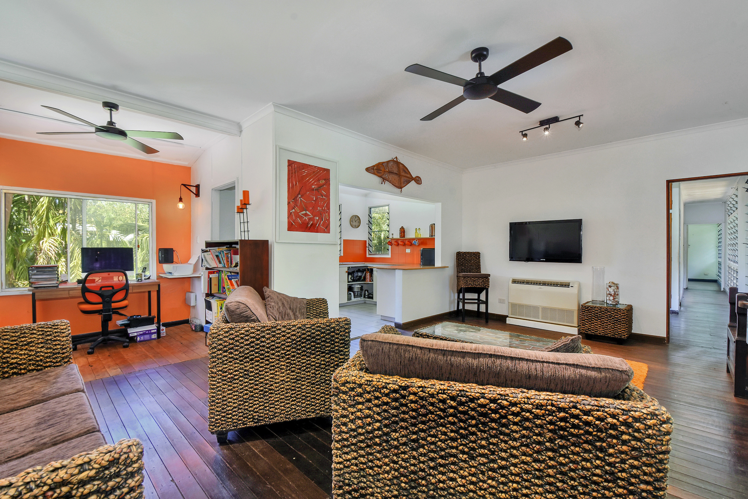 The home is an elevated property with 3 large bedrooms upstairs along with a modernised main bathroom with feature tiles and a timber topped vanity with storage within. The living areas are sweeping and open plan with timber flooring underfoot and bays of louvered windows to capture the cool breezes.