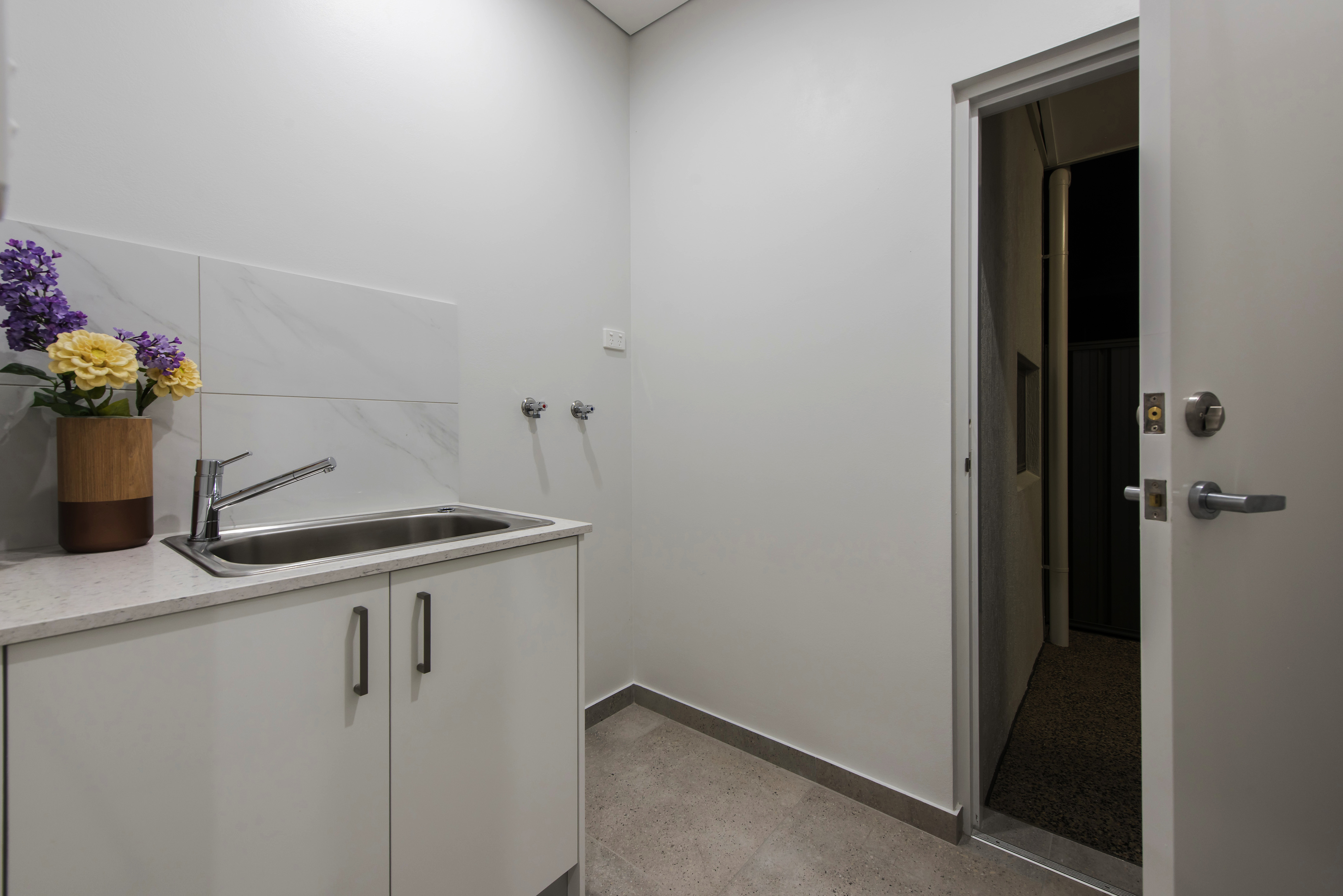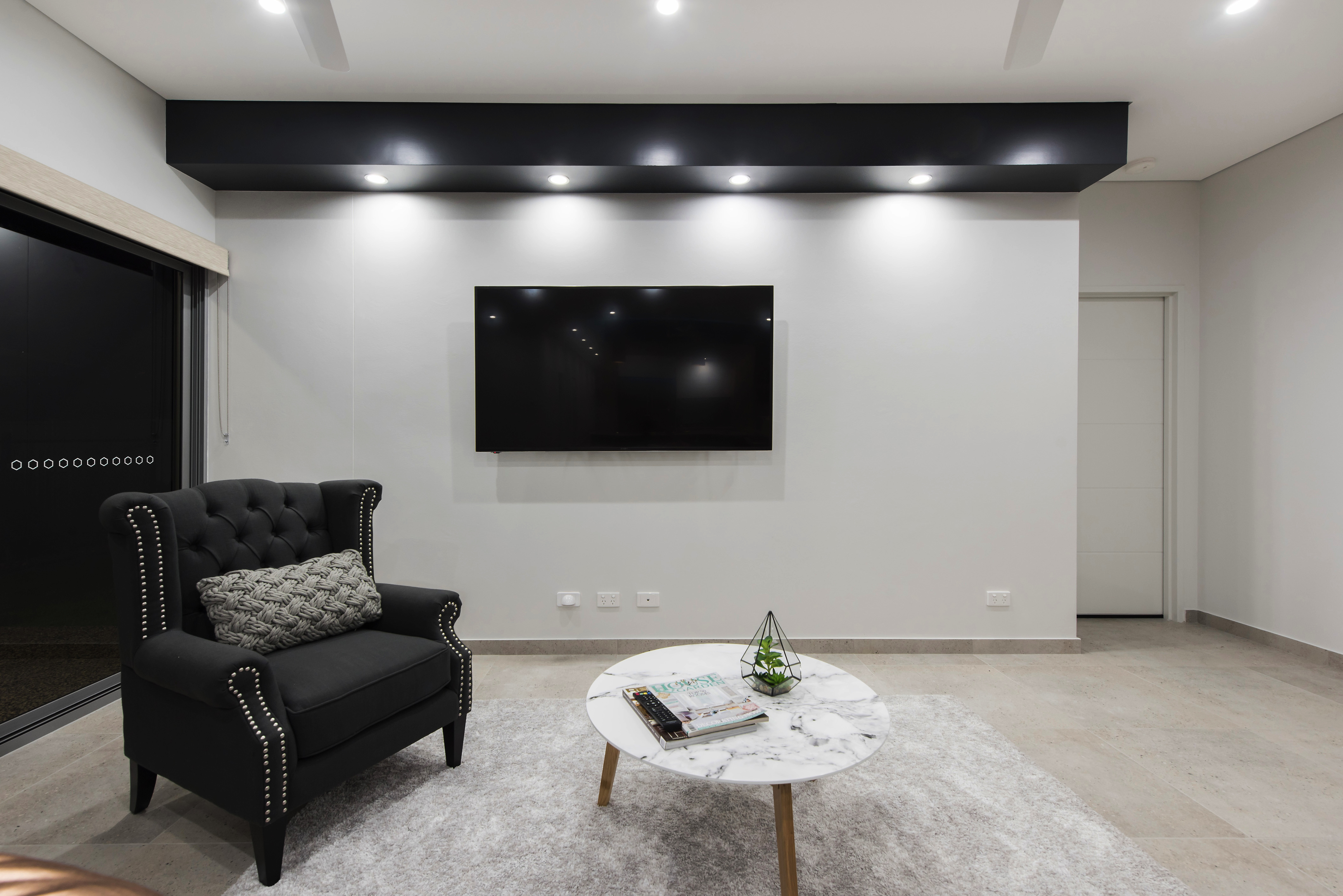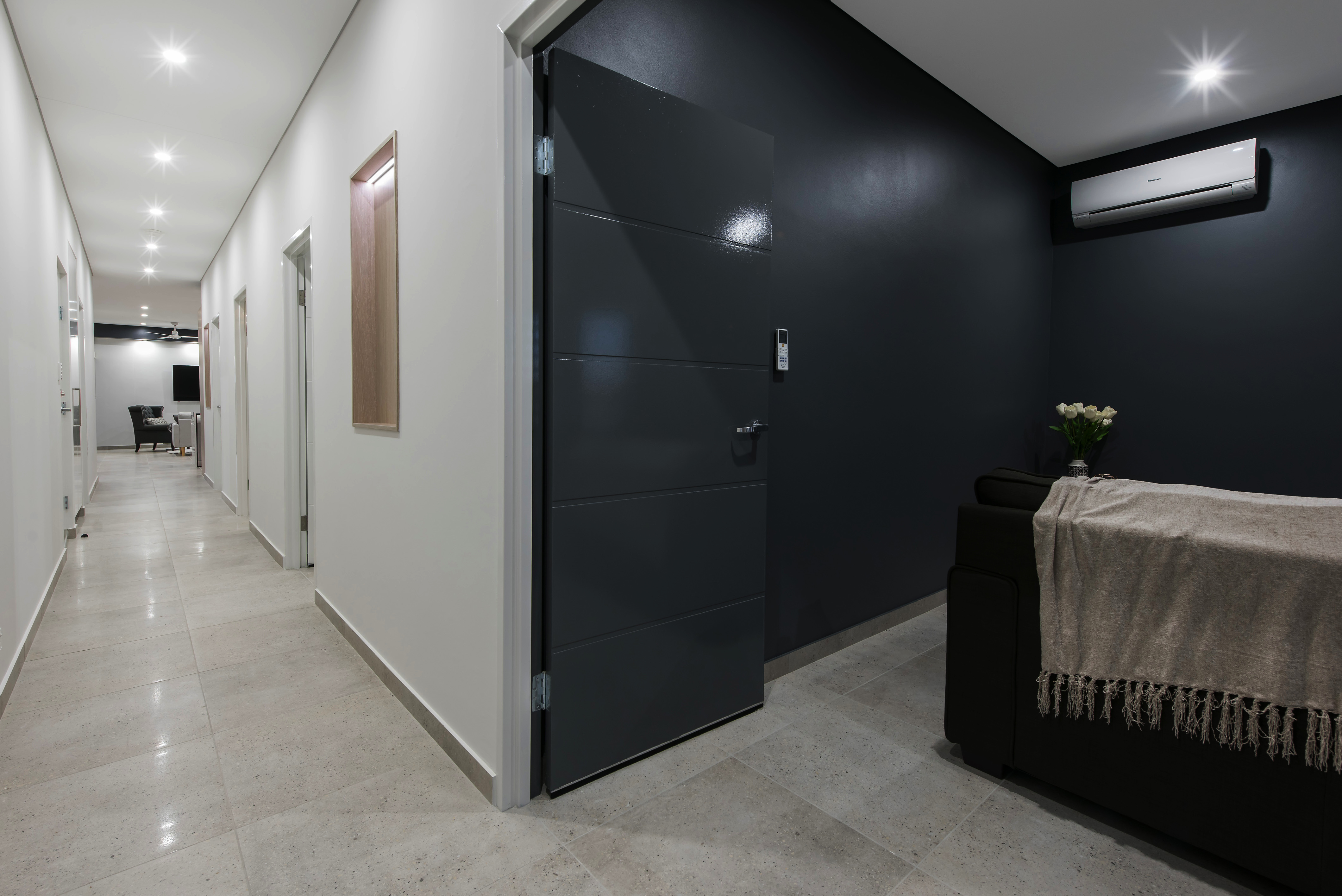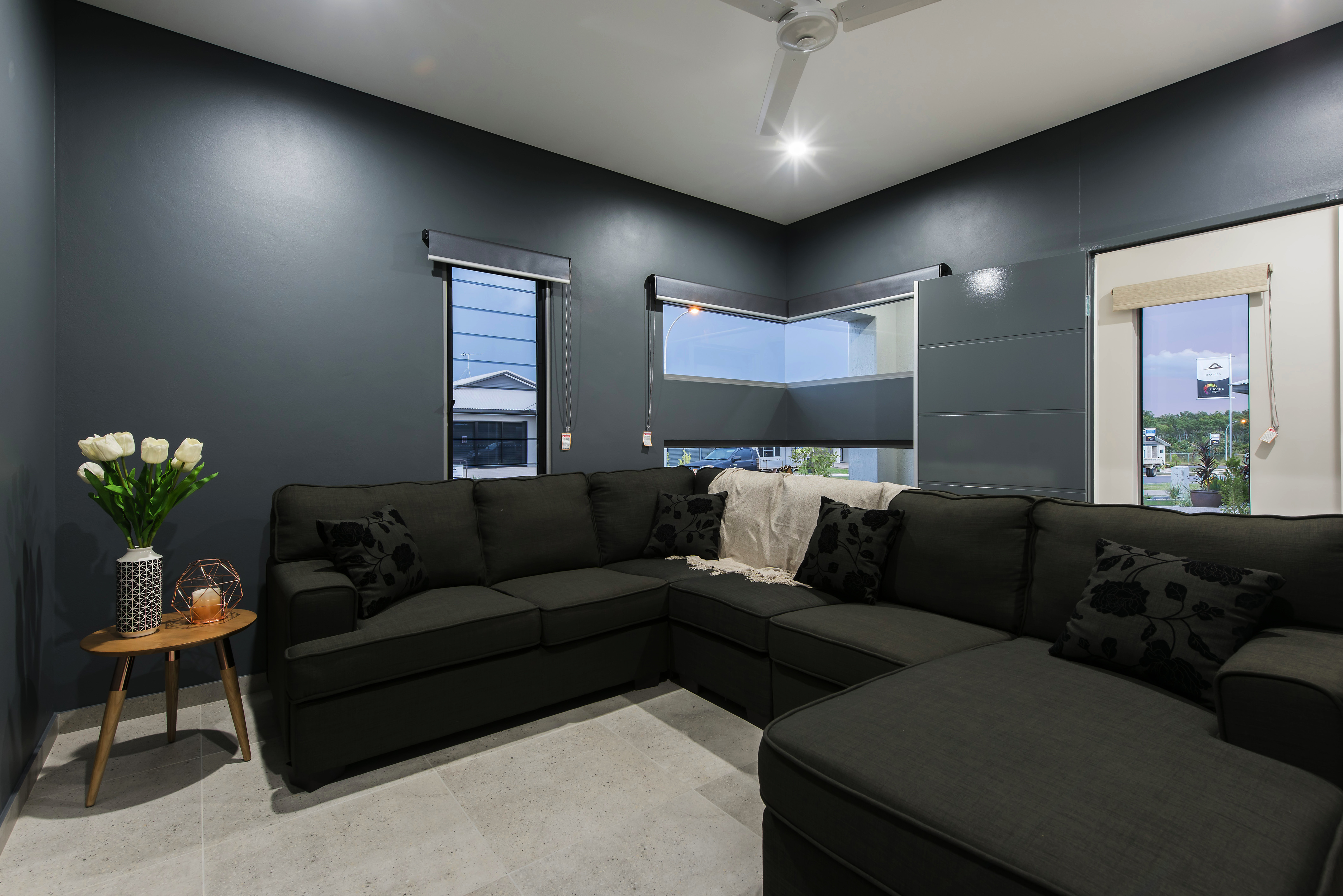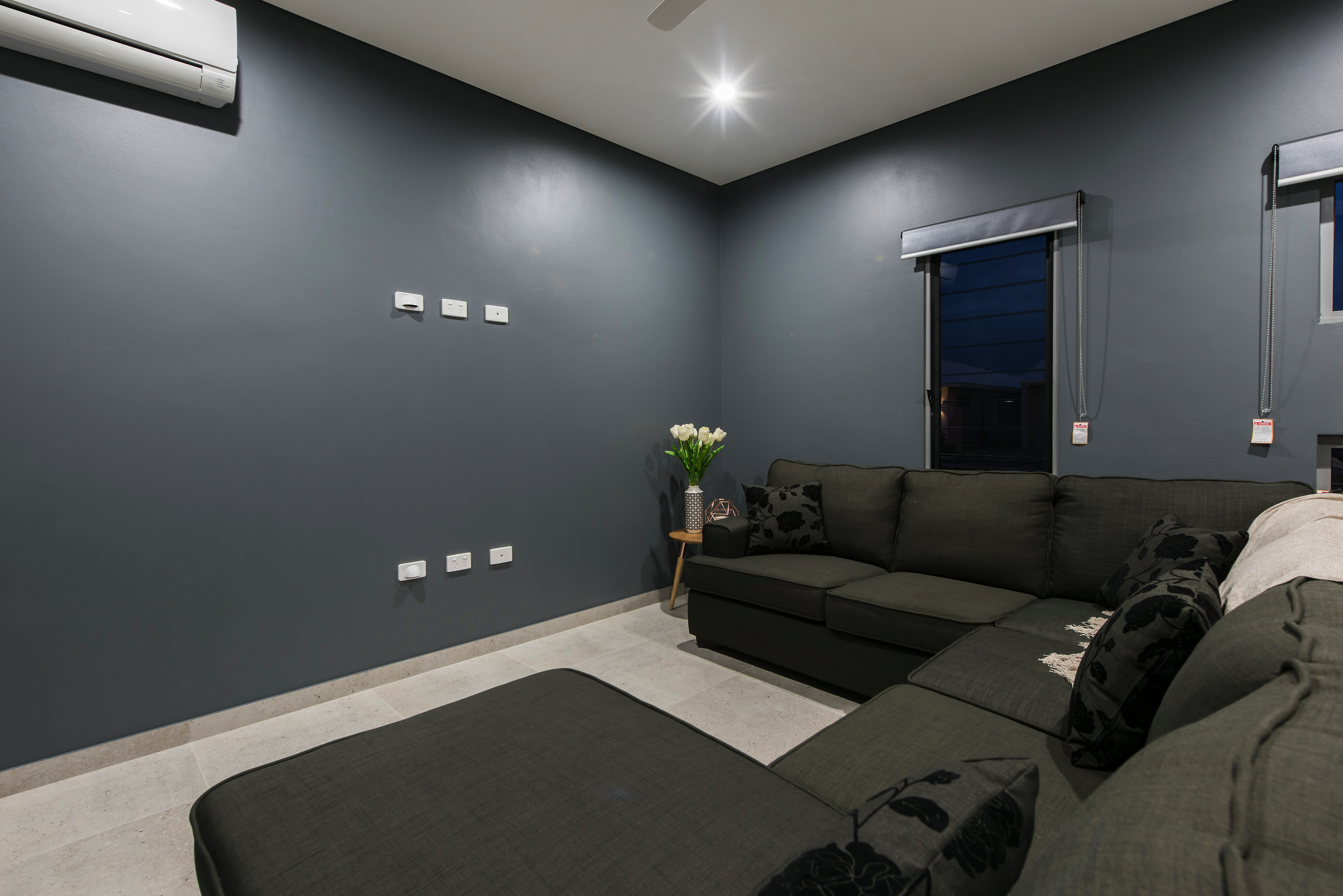 As you would expect, the home is a show stopper! At the front is garage parking for two with a manicured garden and stepping stones that lead through to the formal front entry. Inside the home is a formal living room or media room with dark walls and A/C.