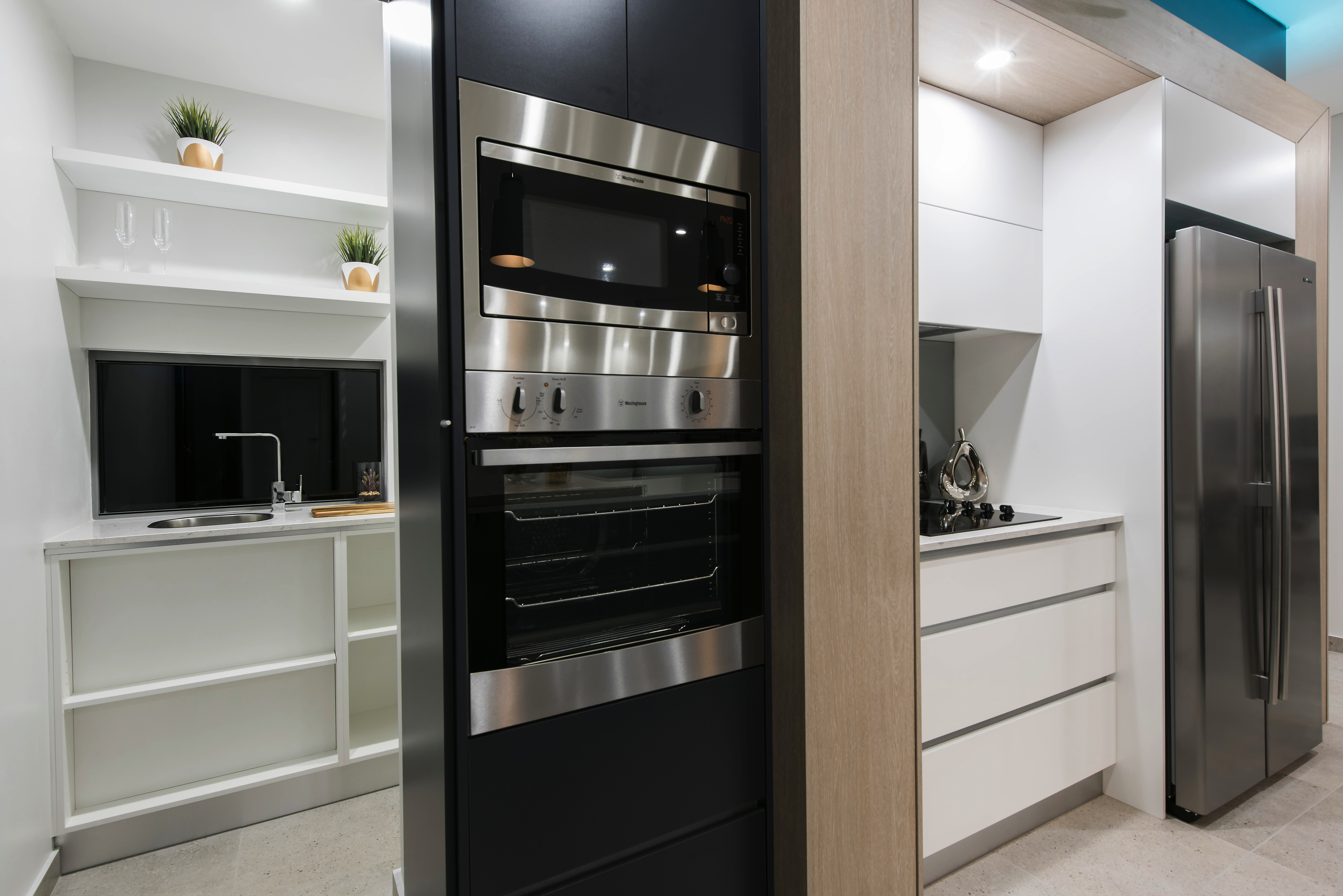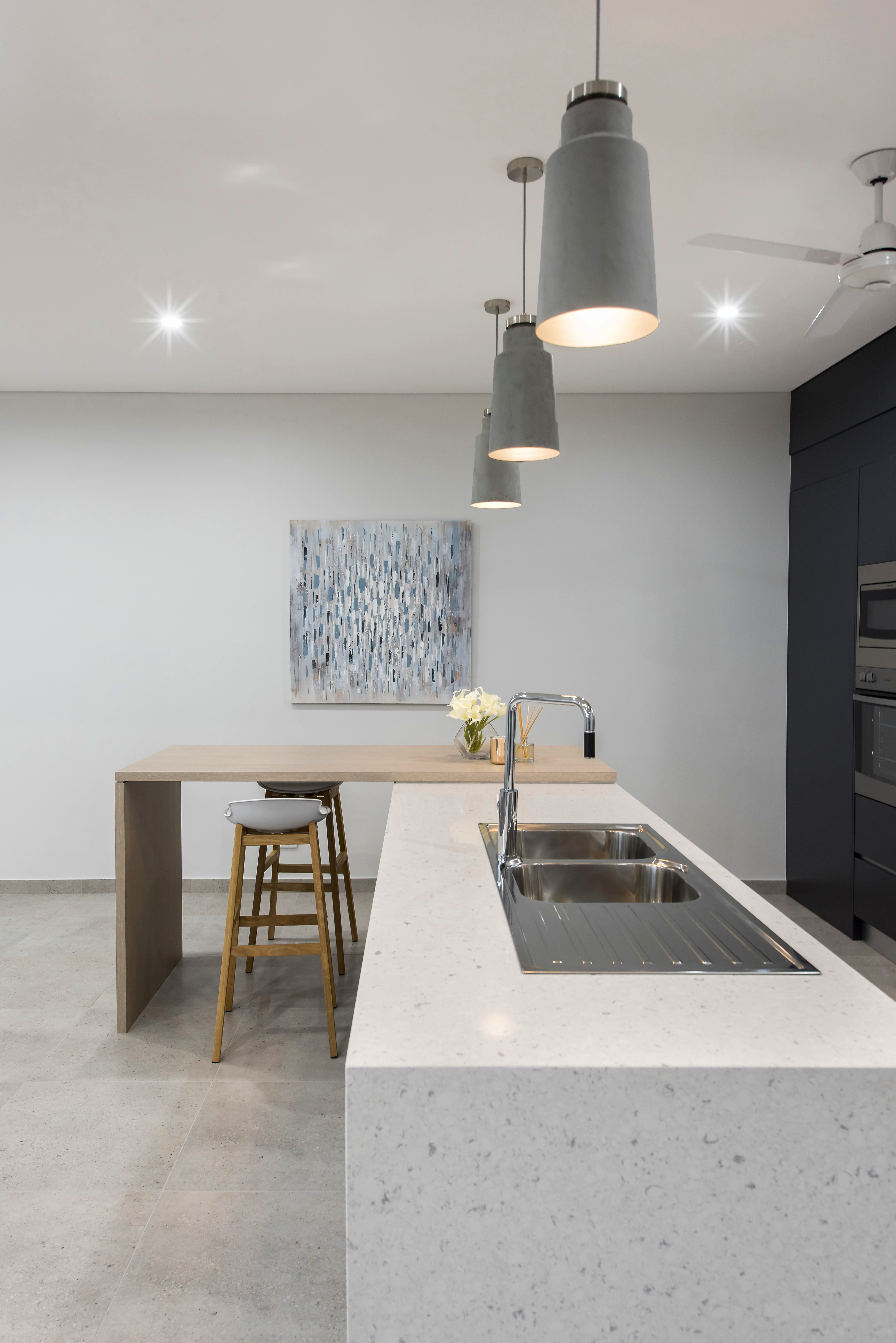 At the back of the home is a large scale open plan living, dining and kitchen area with tiled flooring underfoot and a wall of sliding doors that open onto the large rear entertaining area. The kitchen is gorgeous and boasts a butler’s pantry along with overhead storage, mounted appliances and a feature built in breakfast bar that is designed to impress.