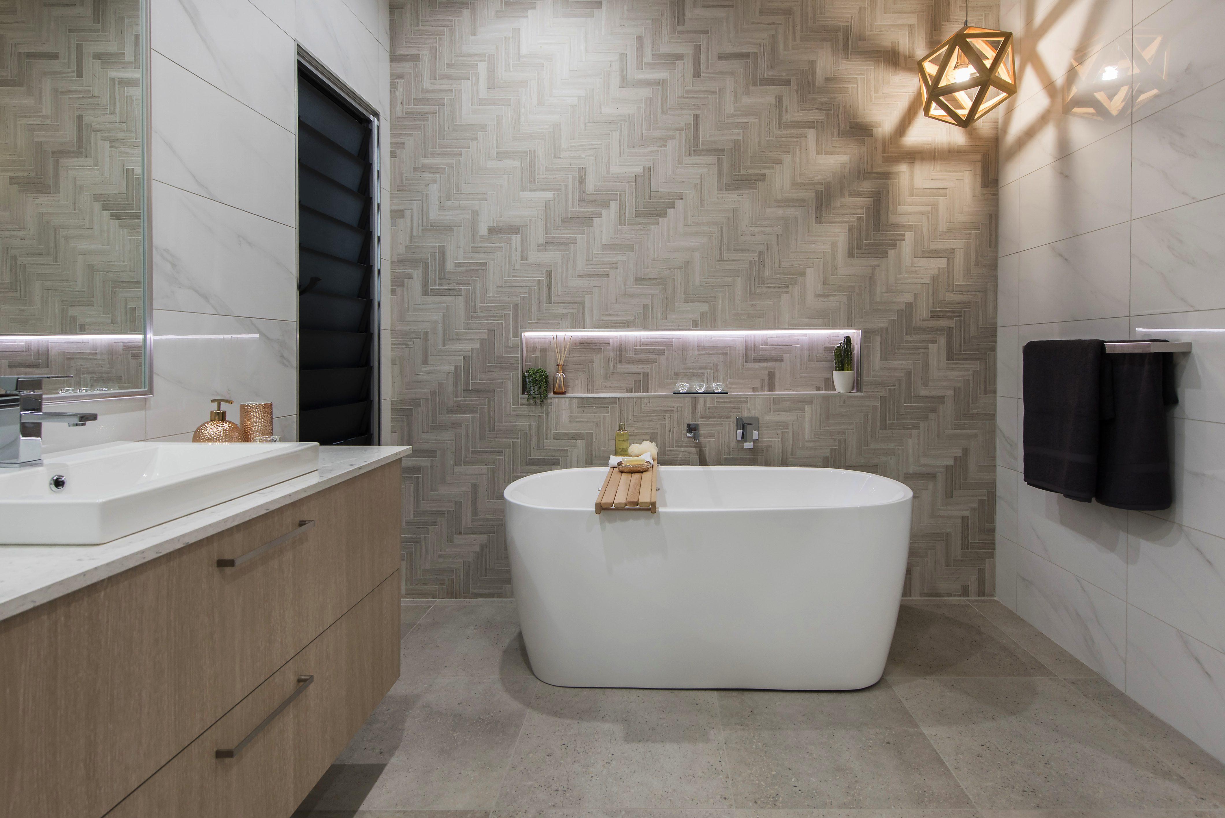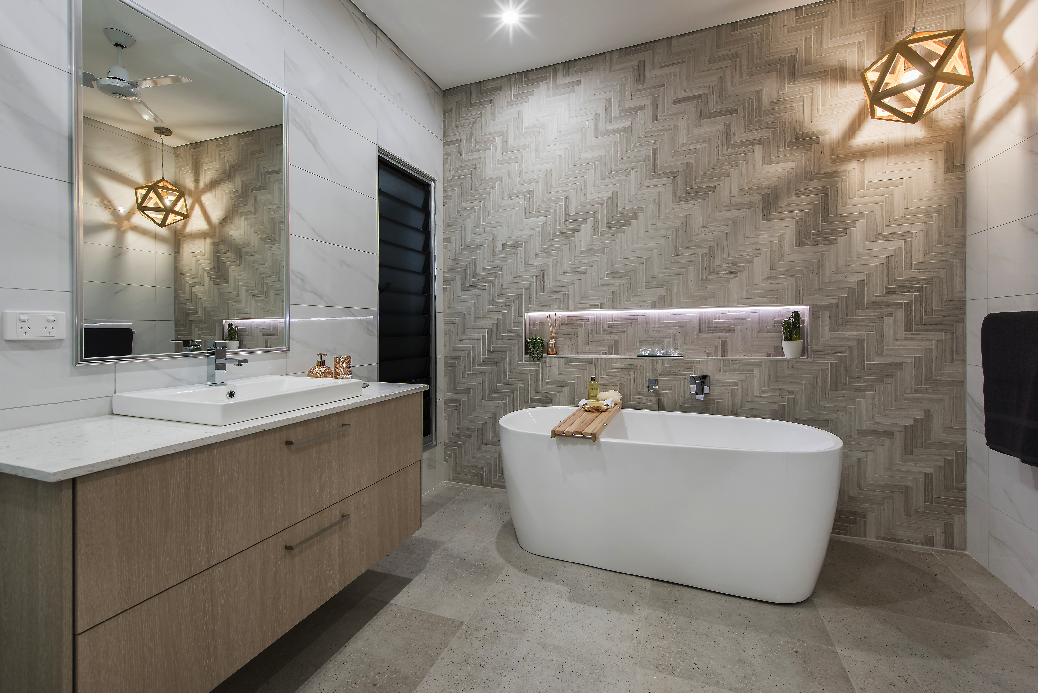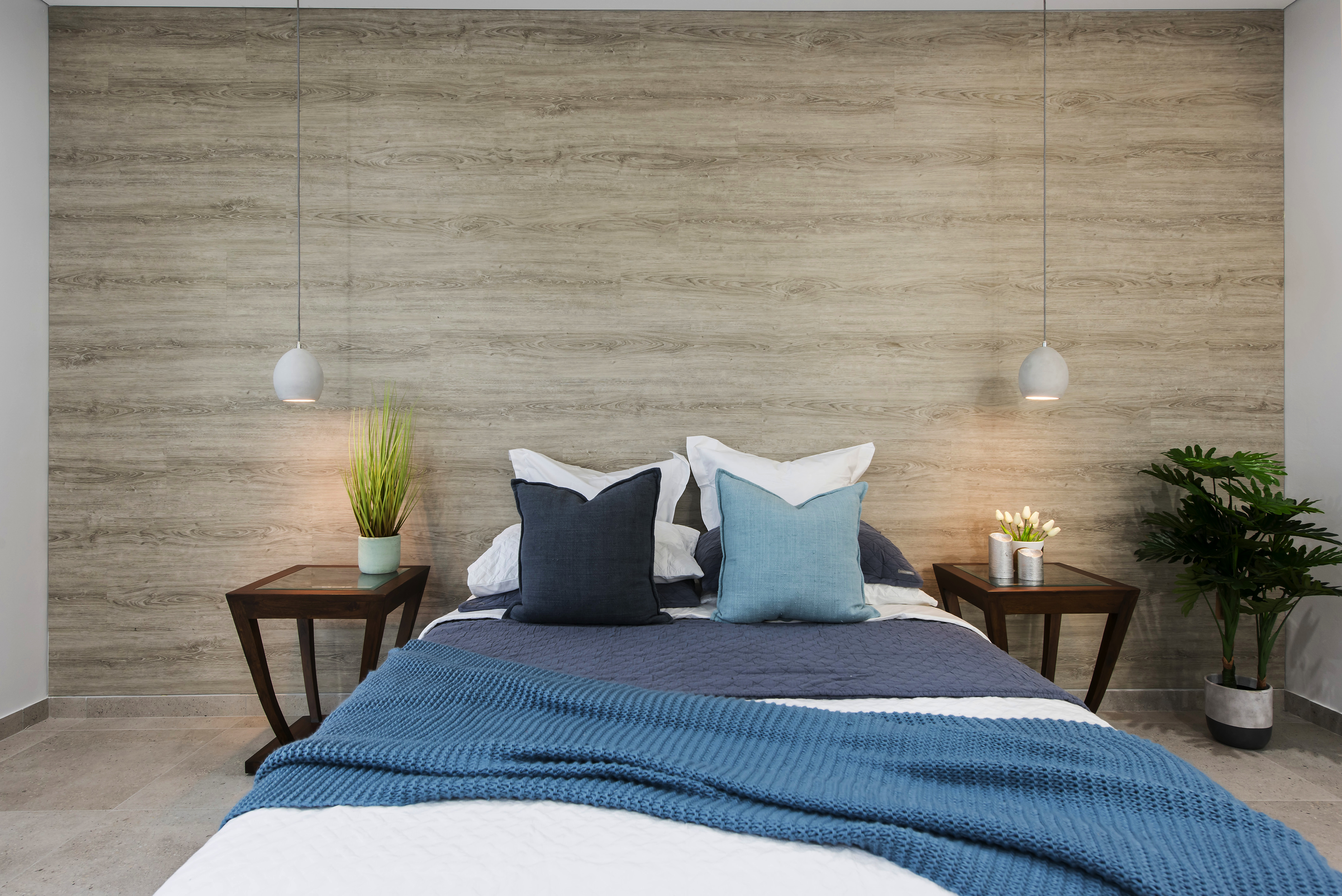 The master bedroom is located at the rear of the home and includes a feature wall behind the bedhead for a dramatic statement piece. On either side of the bed, low pendant lights add another element of style. The ensuite bathroom is sleek and modern with feature herringbone tilework, large vanity and shower.
