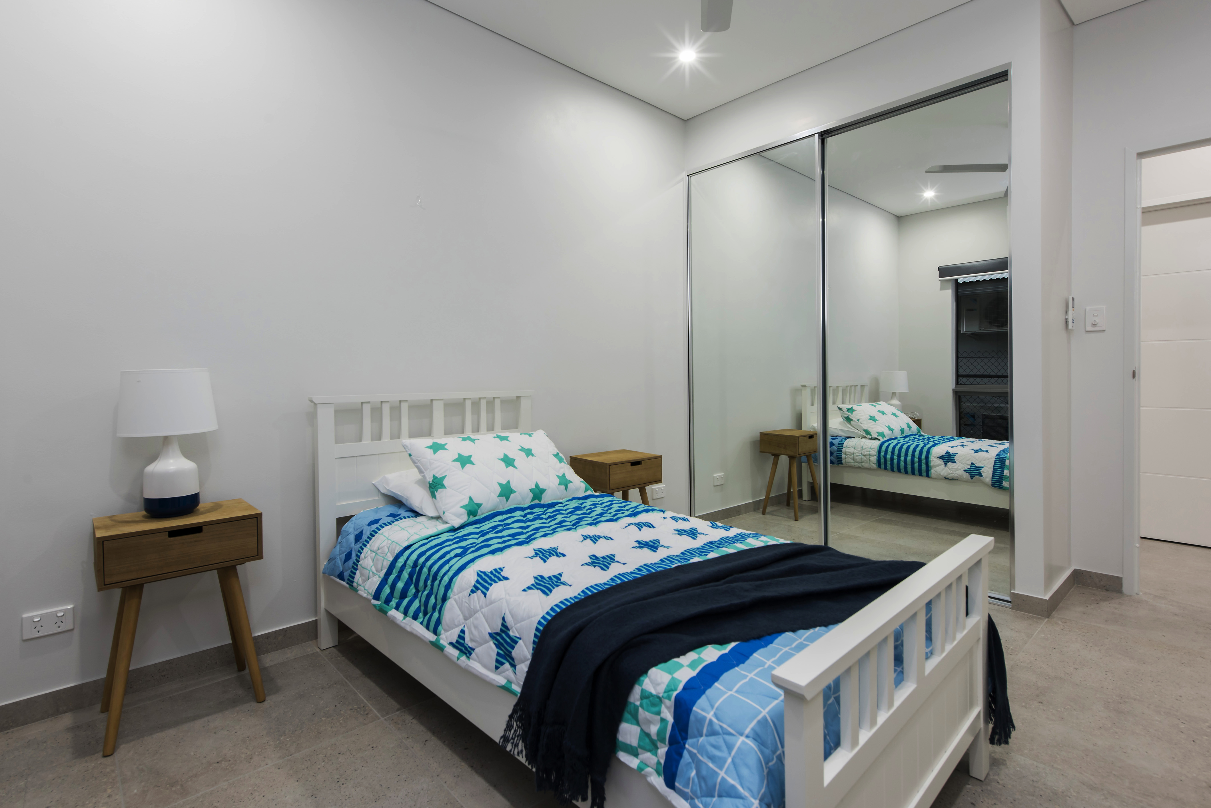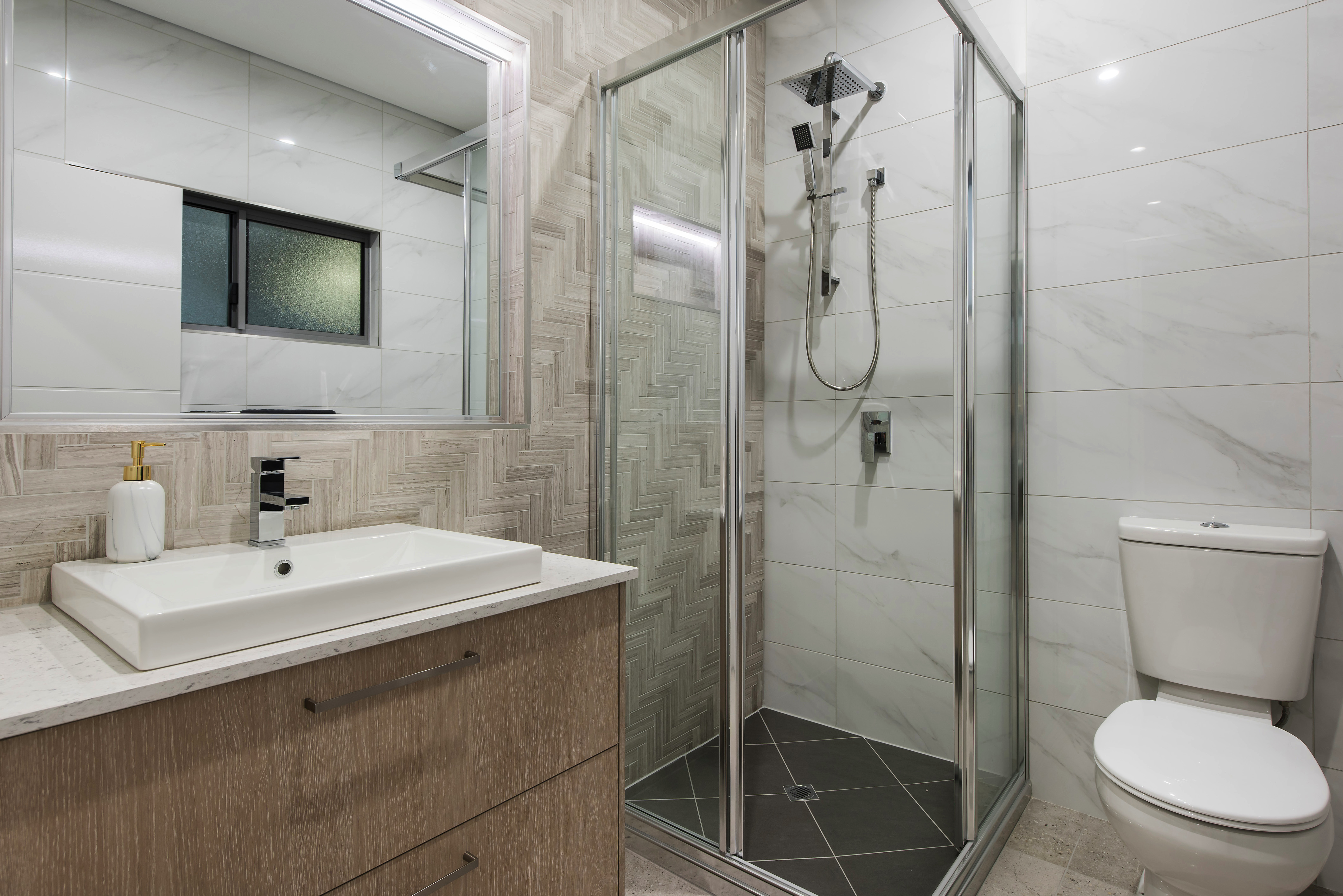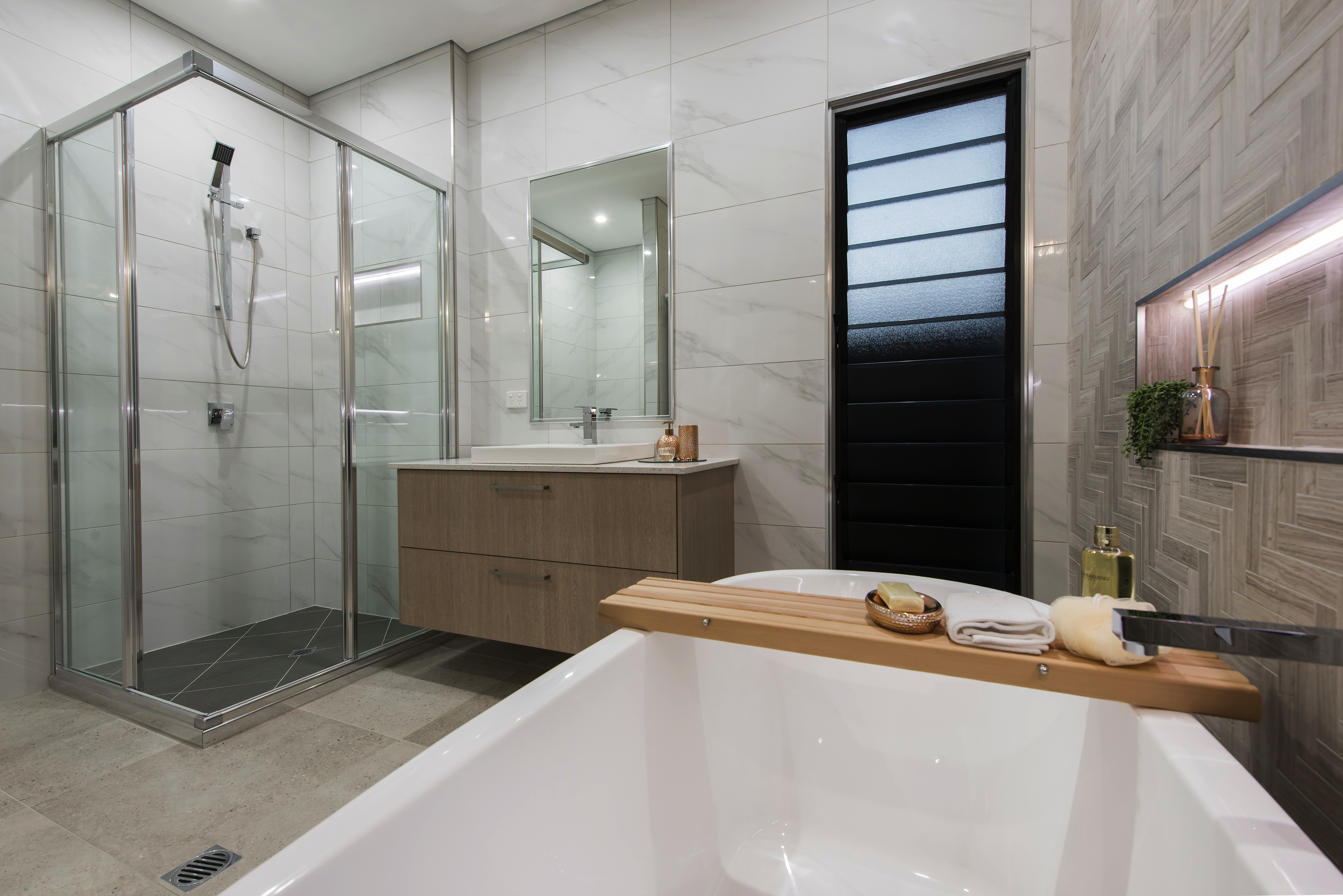 The master bedroom is located at the rear of the home and includes a feature wall behind the bedhead for a dramatic statement piece. On either side of the bed, low pendant lights add another element of style. The ensuite bathroom is sleek and modern with feature herringbone tilework, large vanity and shower.