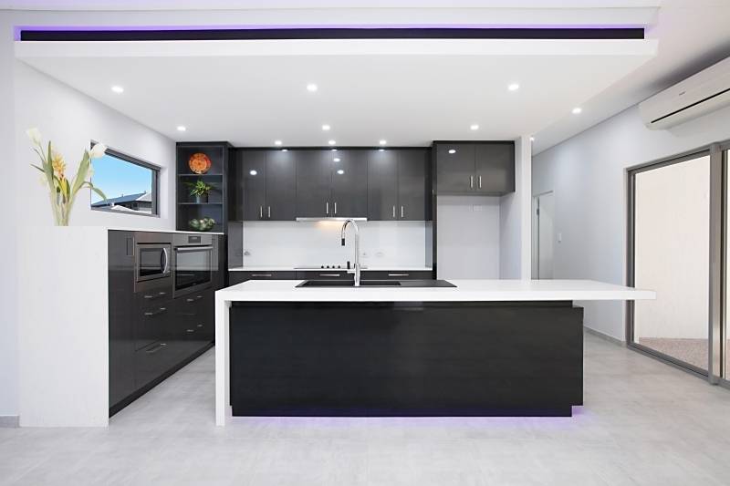 Inside is a grand open plan living, dining and kitchen area with tiled flooring and split A/C throughout this light filled space. The kitchen is sleek and offers wrap around counters with overhead storage, central island work bench with breakfast bar and feature LED coloured lighting over the dropped ceiling above.