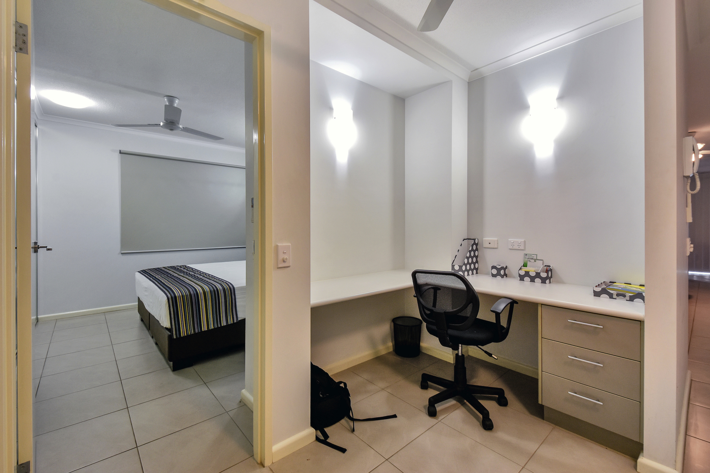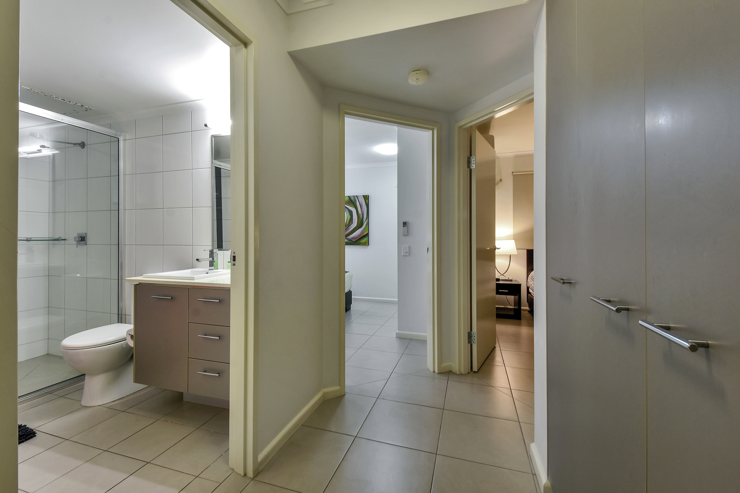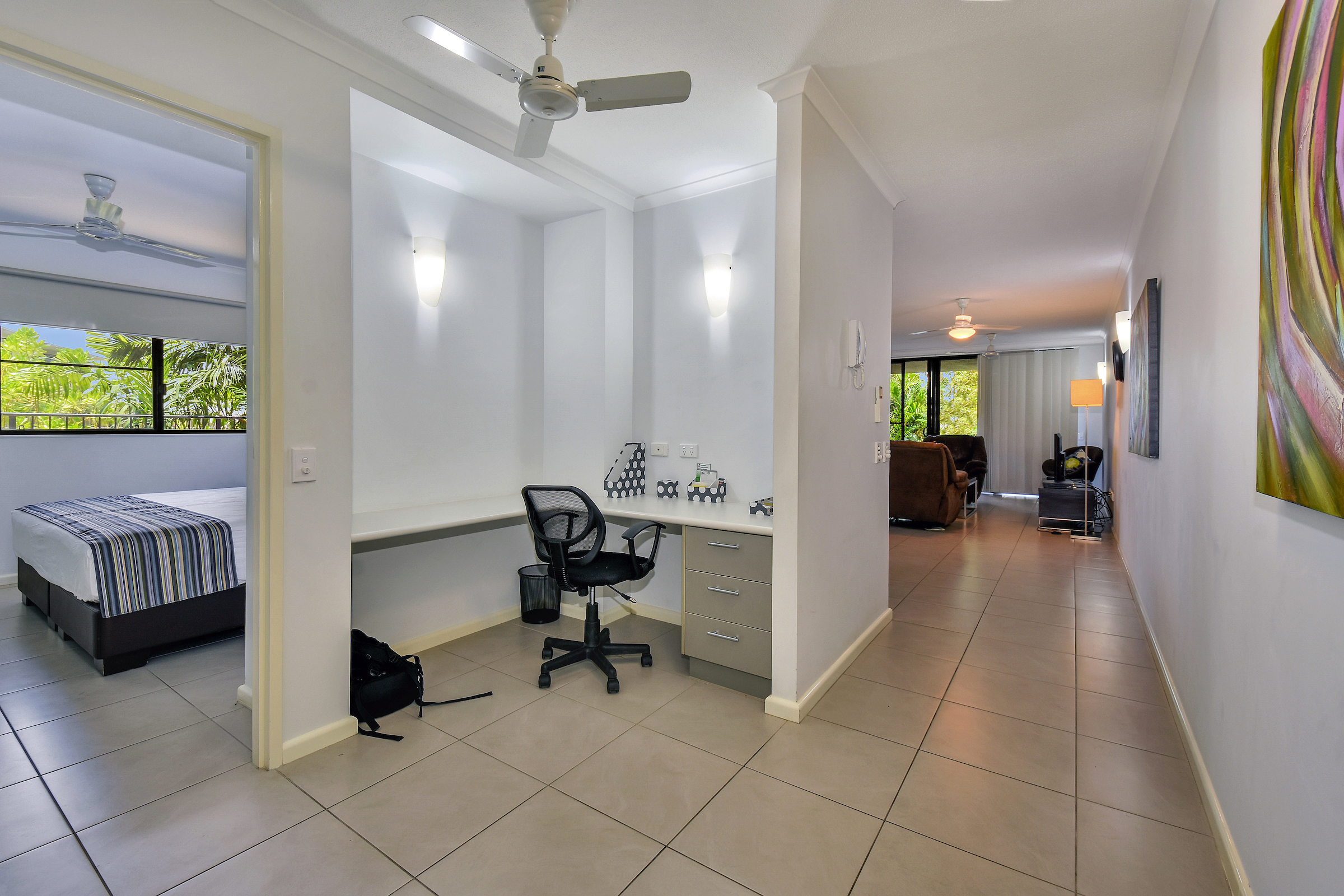 This ground level apartment is tucked away in the rear of the complex affording it unrivalled privacy. Inside is a long hallway that leads right through to the open plan living, dining and kitchen areas at the back of the home that open via double opening doors onto the back private courtyard. These areas are tiled throughout with A/C and the kitchen is gourmet with stone counters and a functional galley design with overhead storage and island prep bench.
