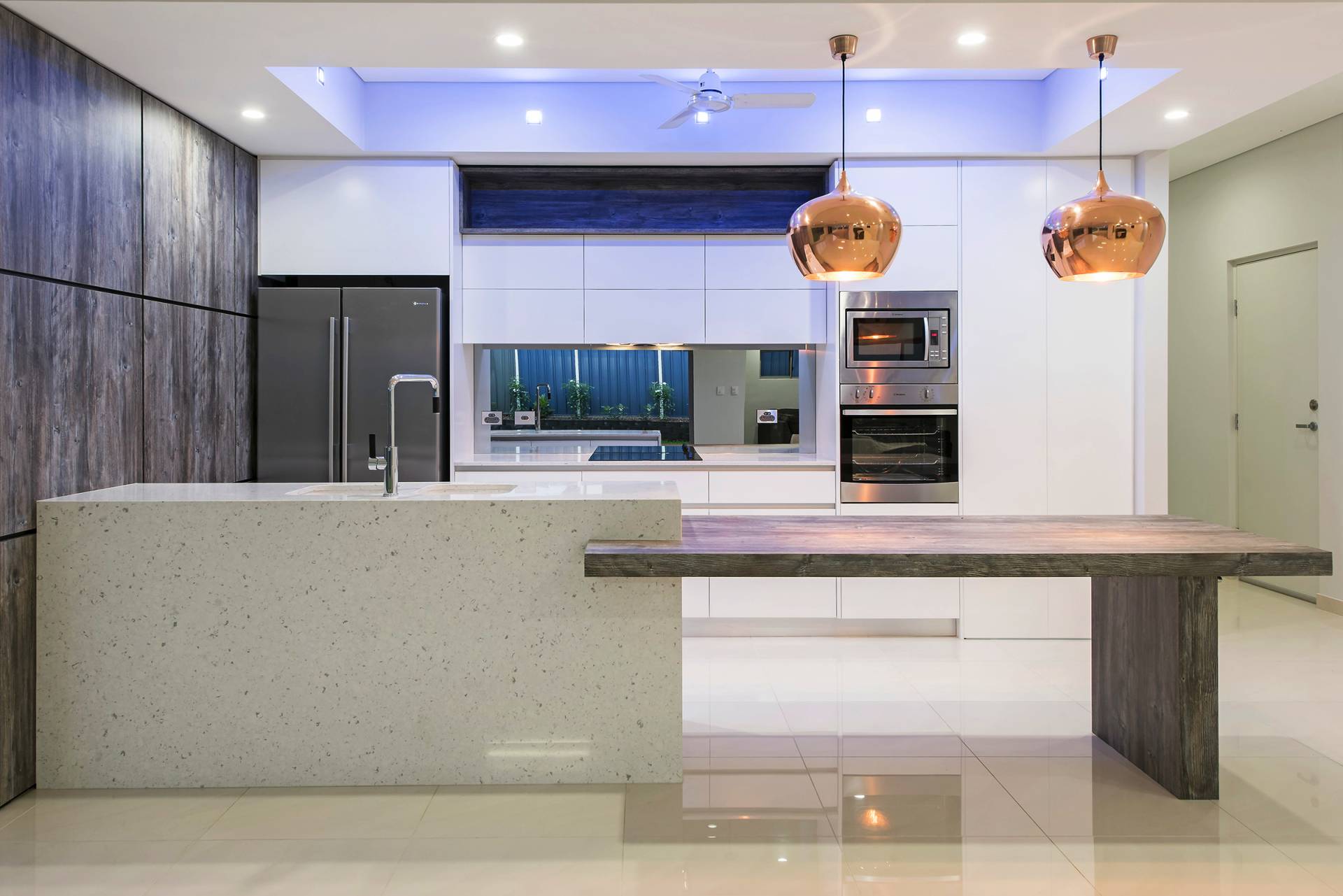 Inside is a sweeping open plan living, dining and gourmet kitchen area with glossy tiled flooring underfoot. The kitchen includes a feature wall and gorgeous pendant lighting strung low over the built in breakfast bar.