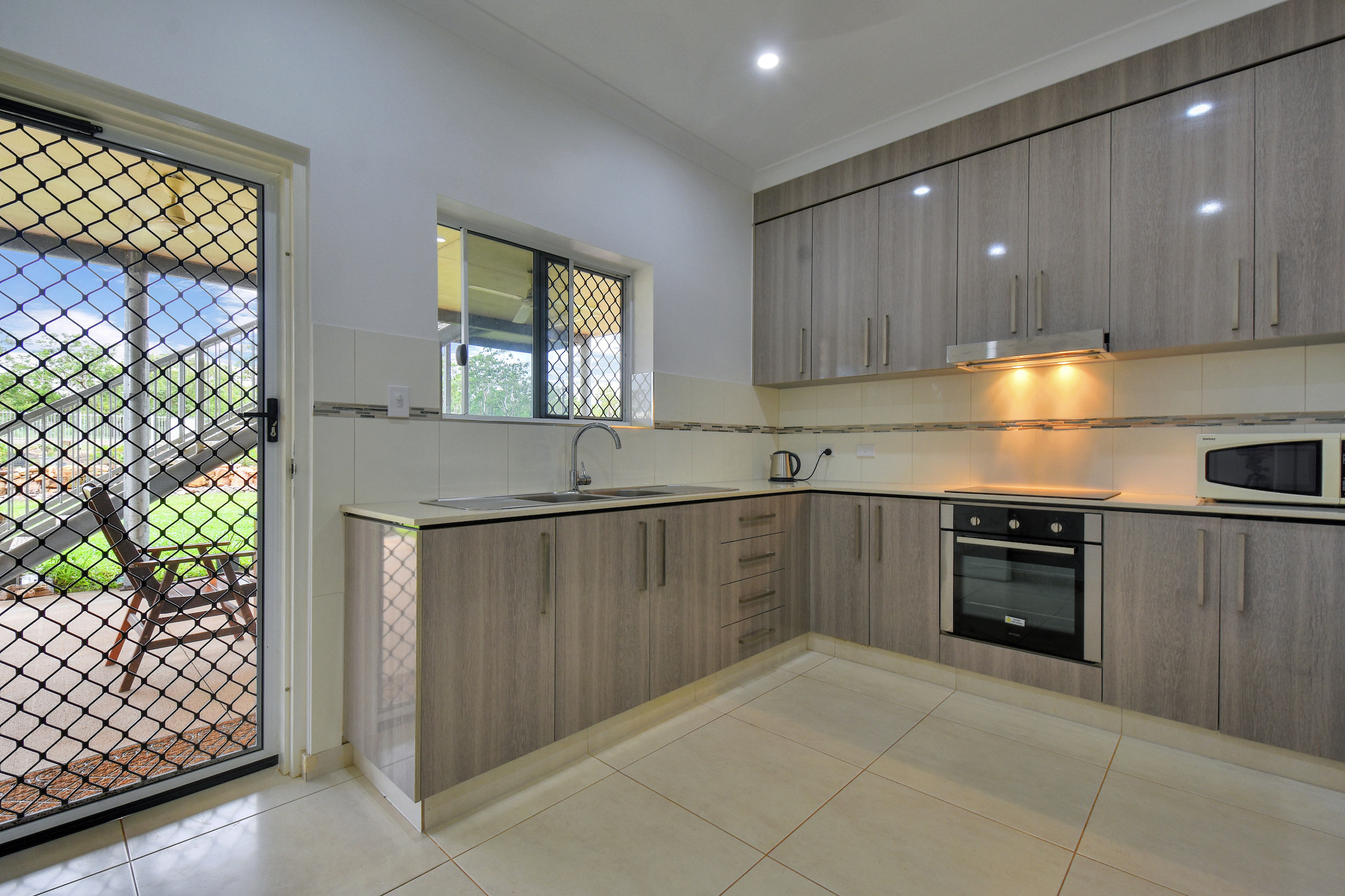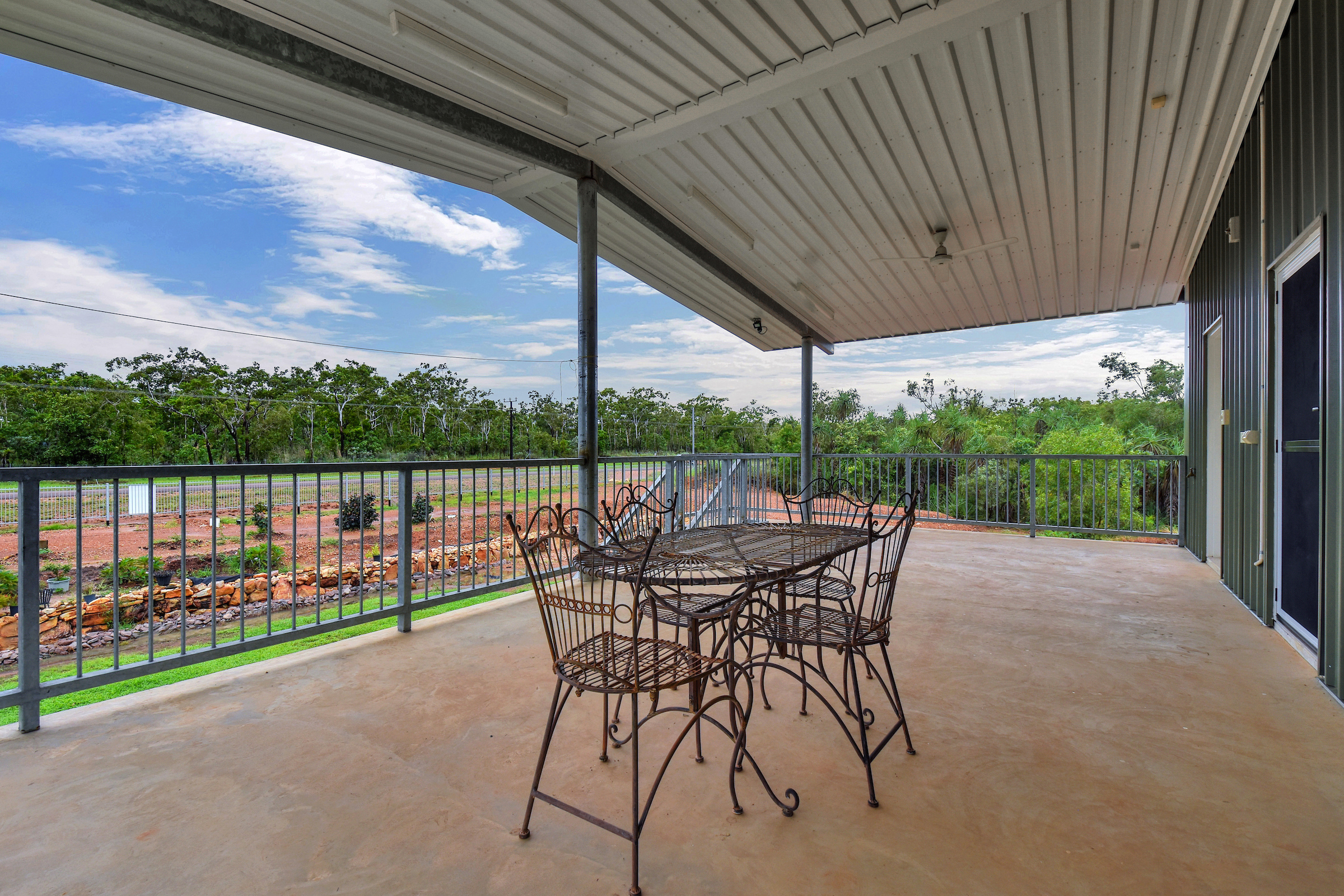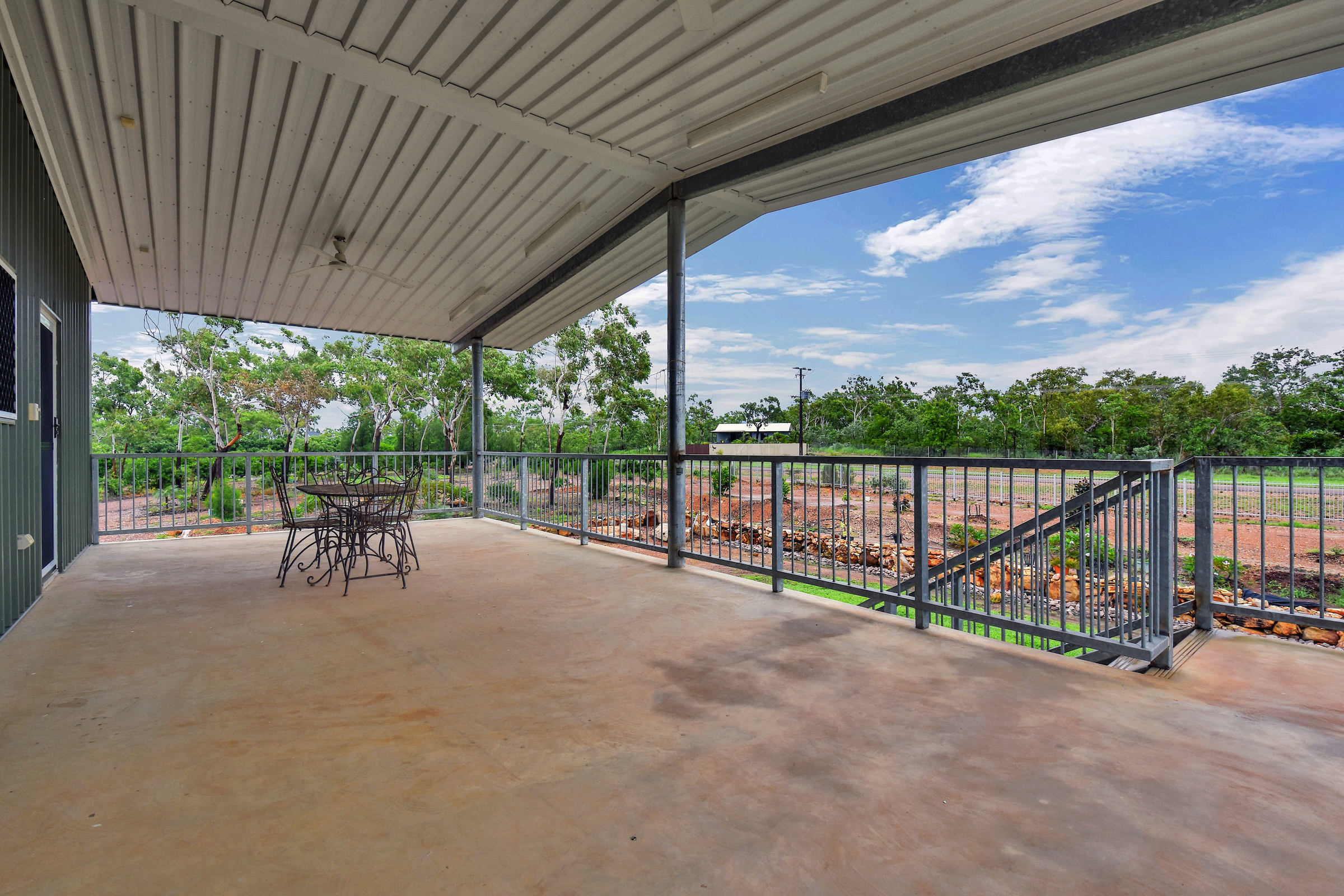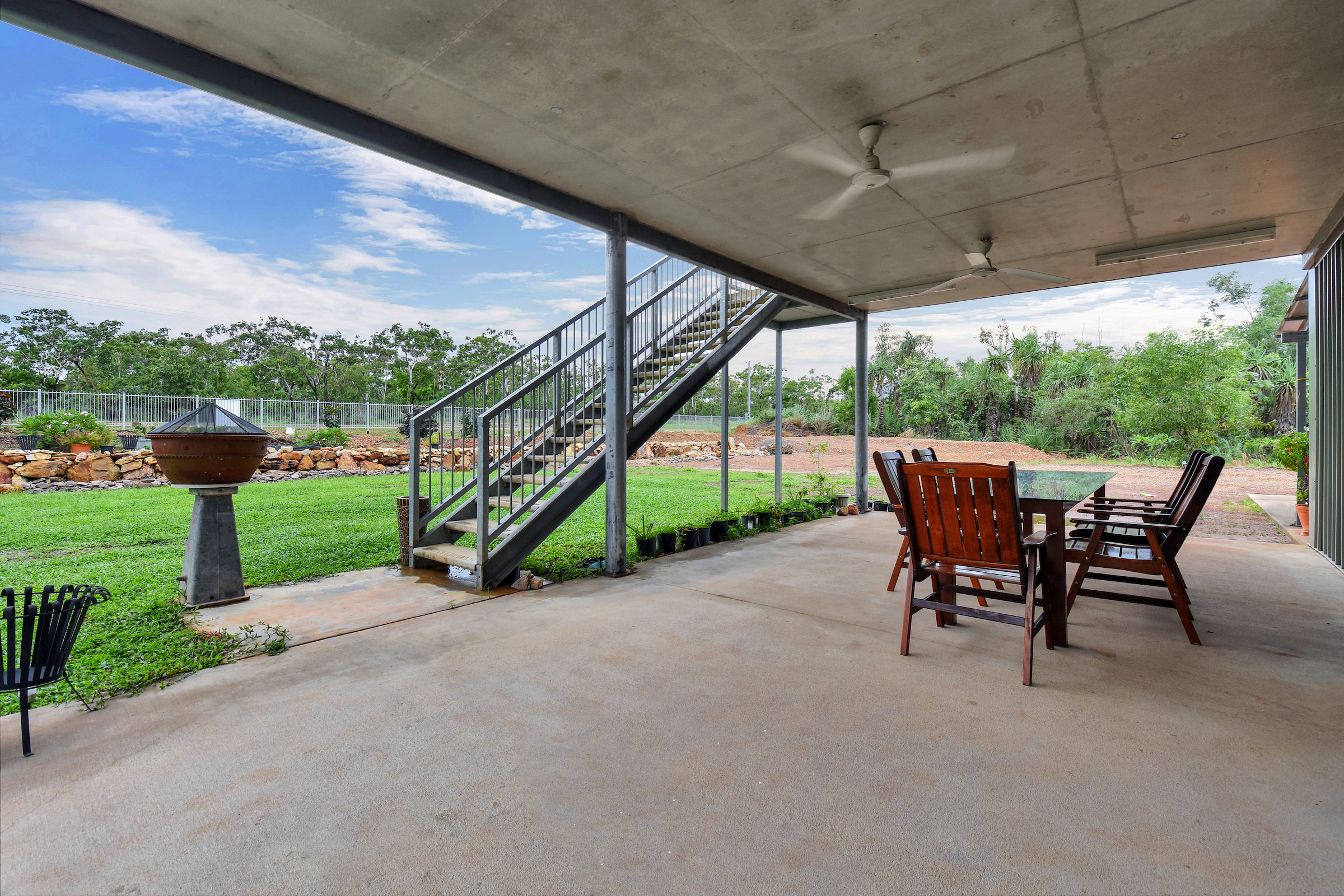 Down stairs a kitchen, one bedroom, laundry, bathroom and another huge outside entertaining area.