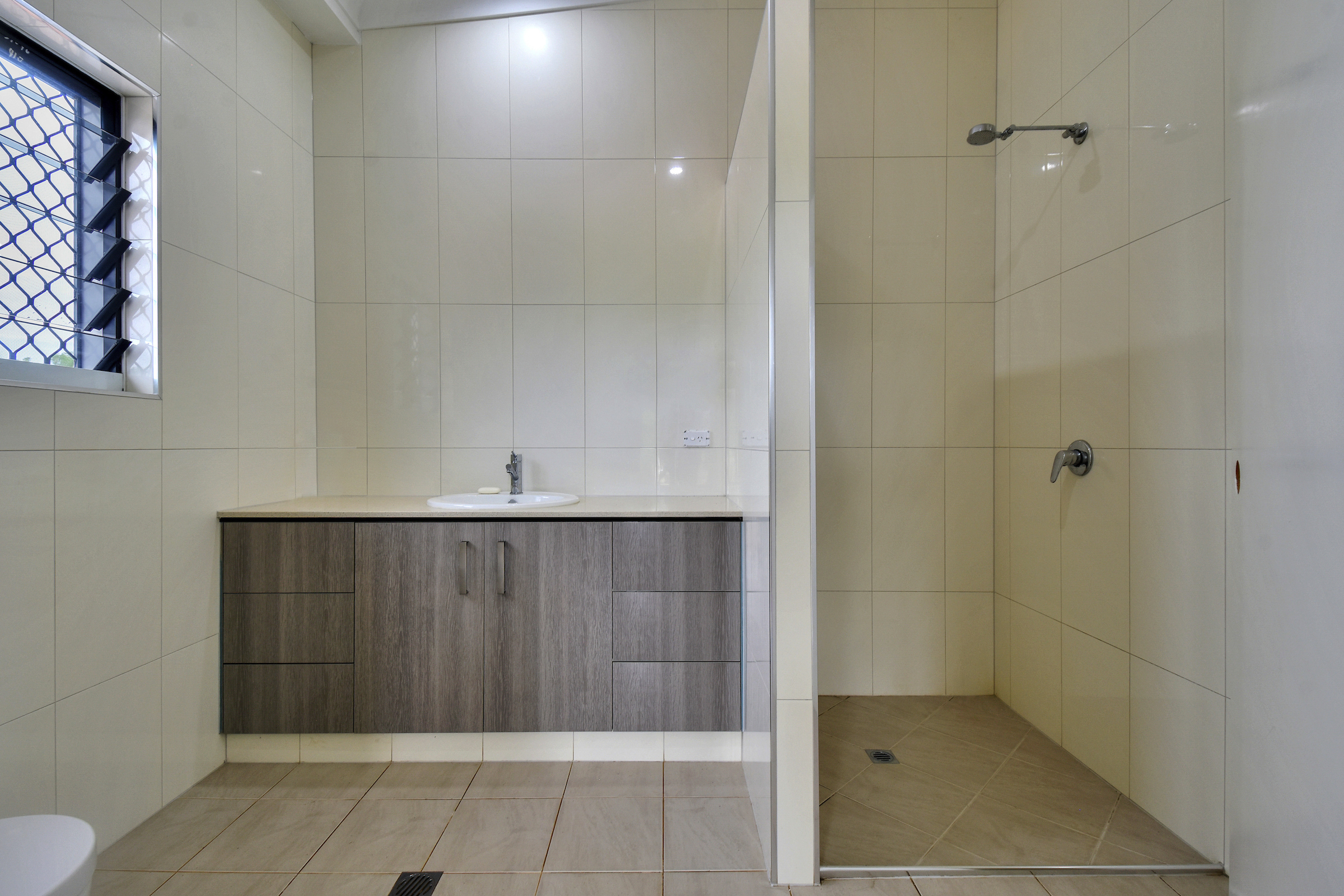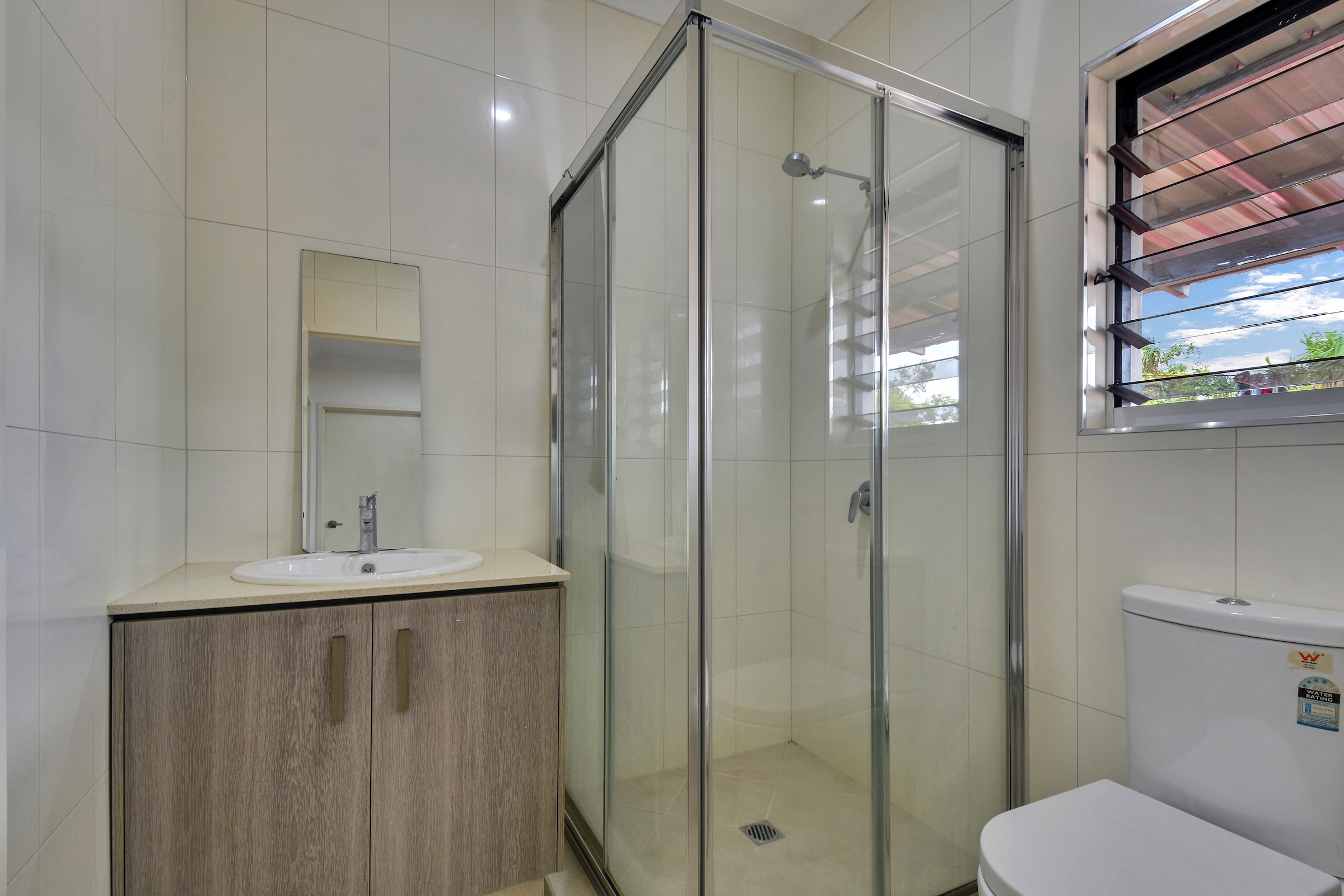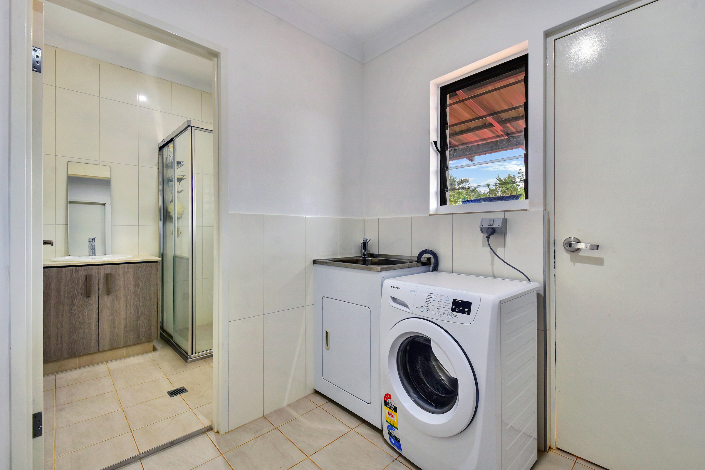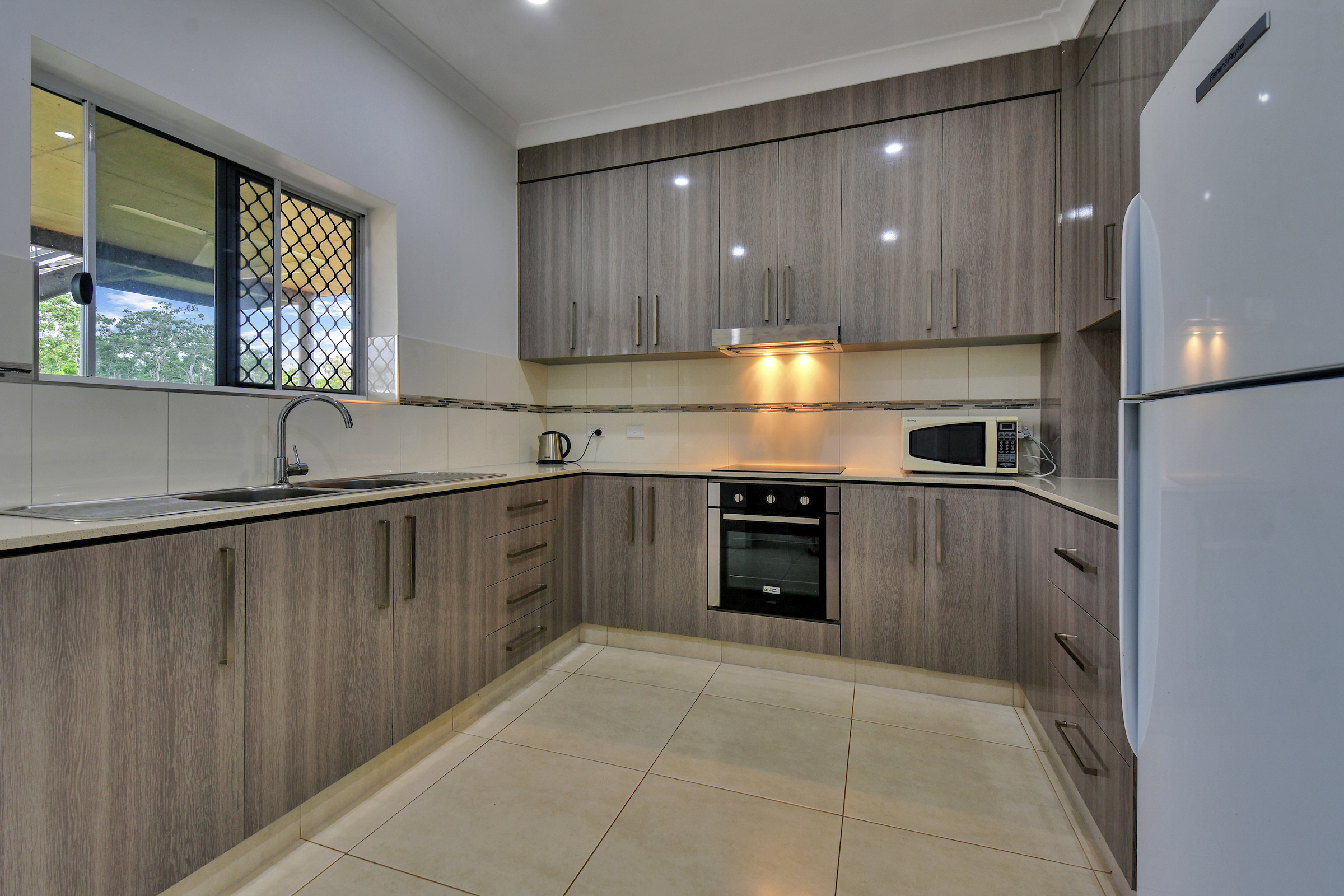 Down stairs a kitchen, one bedroom, laundry, bathroom and another huge outside entertaining area.