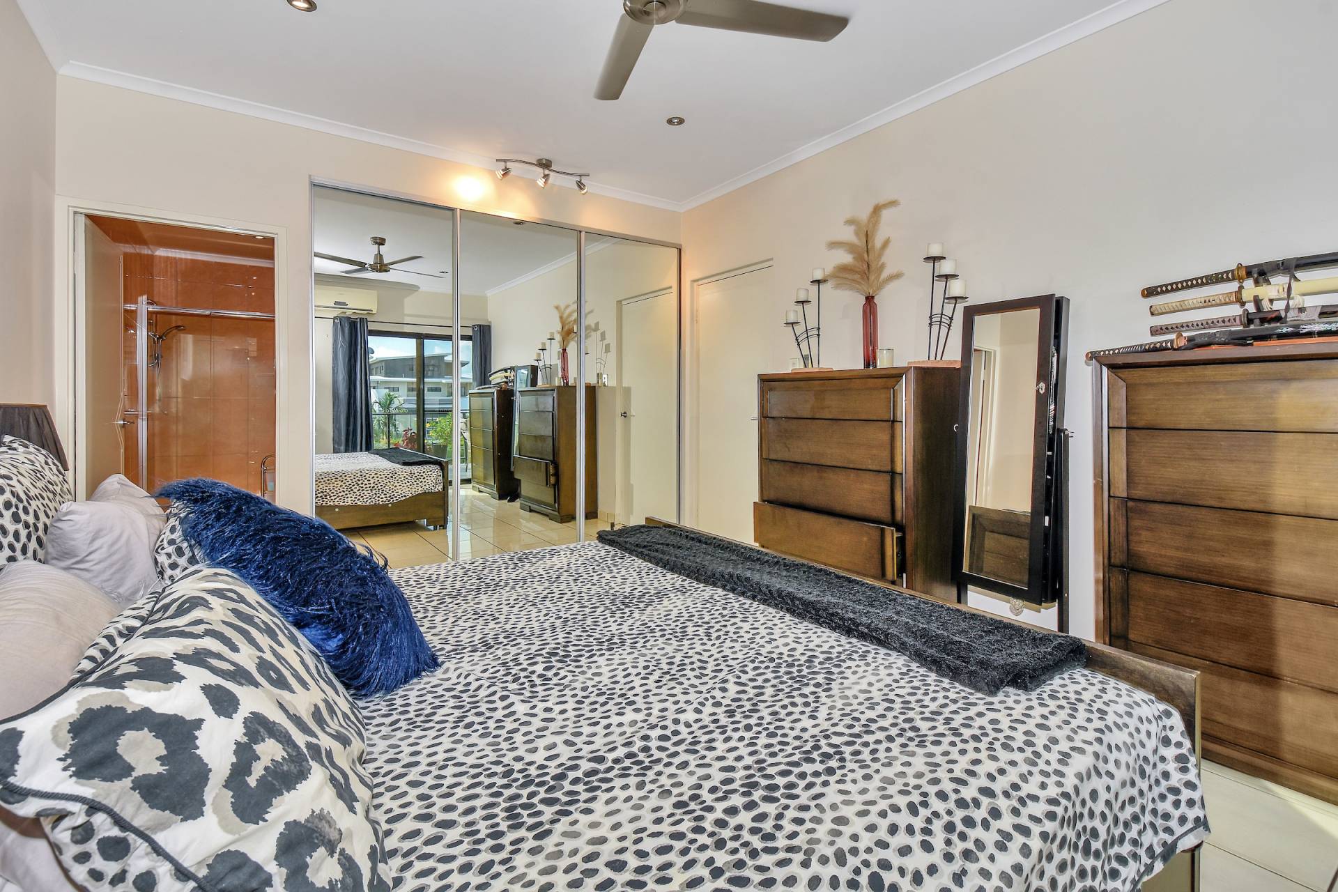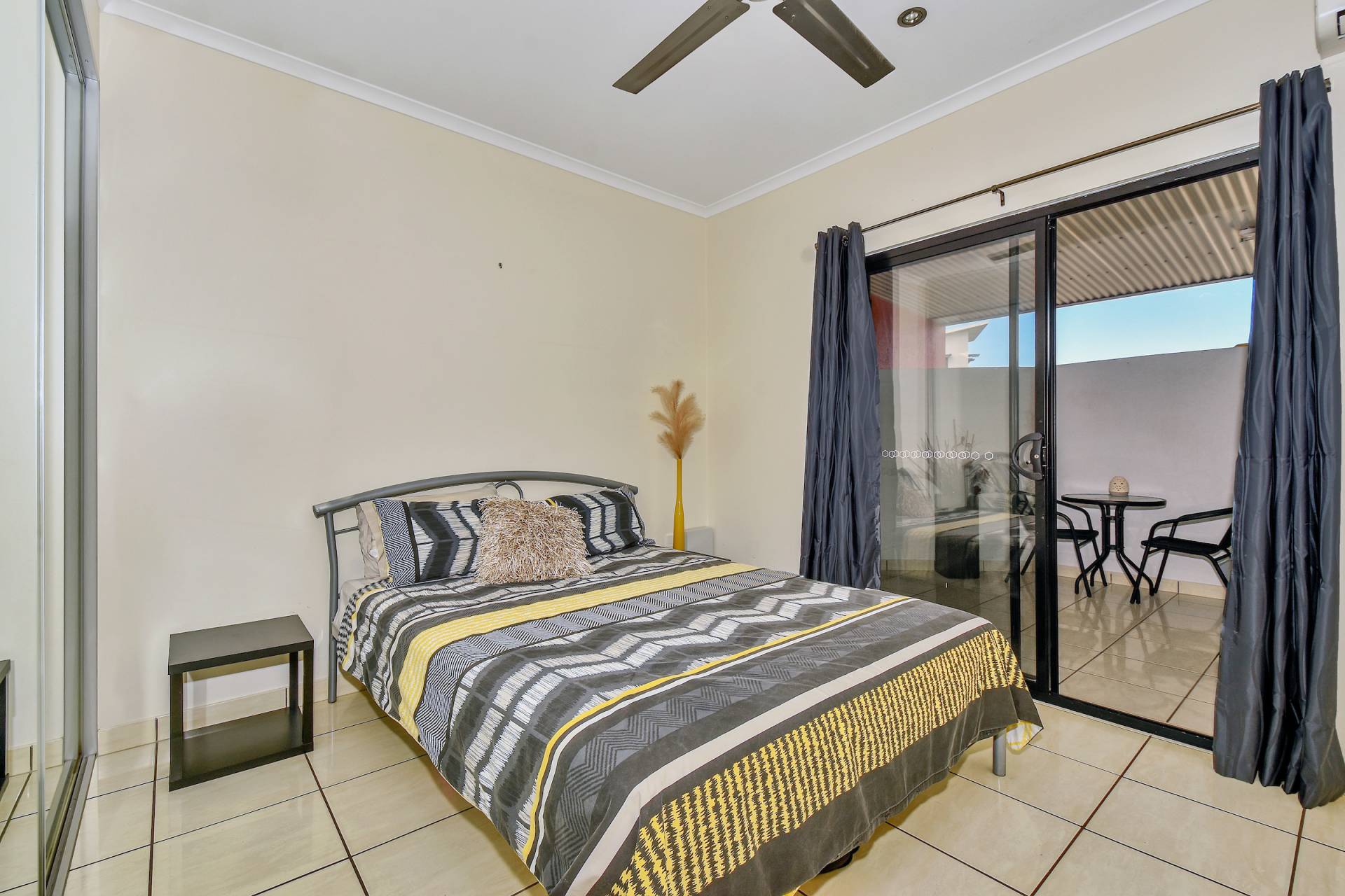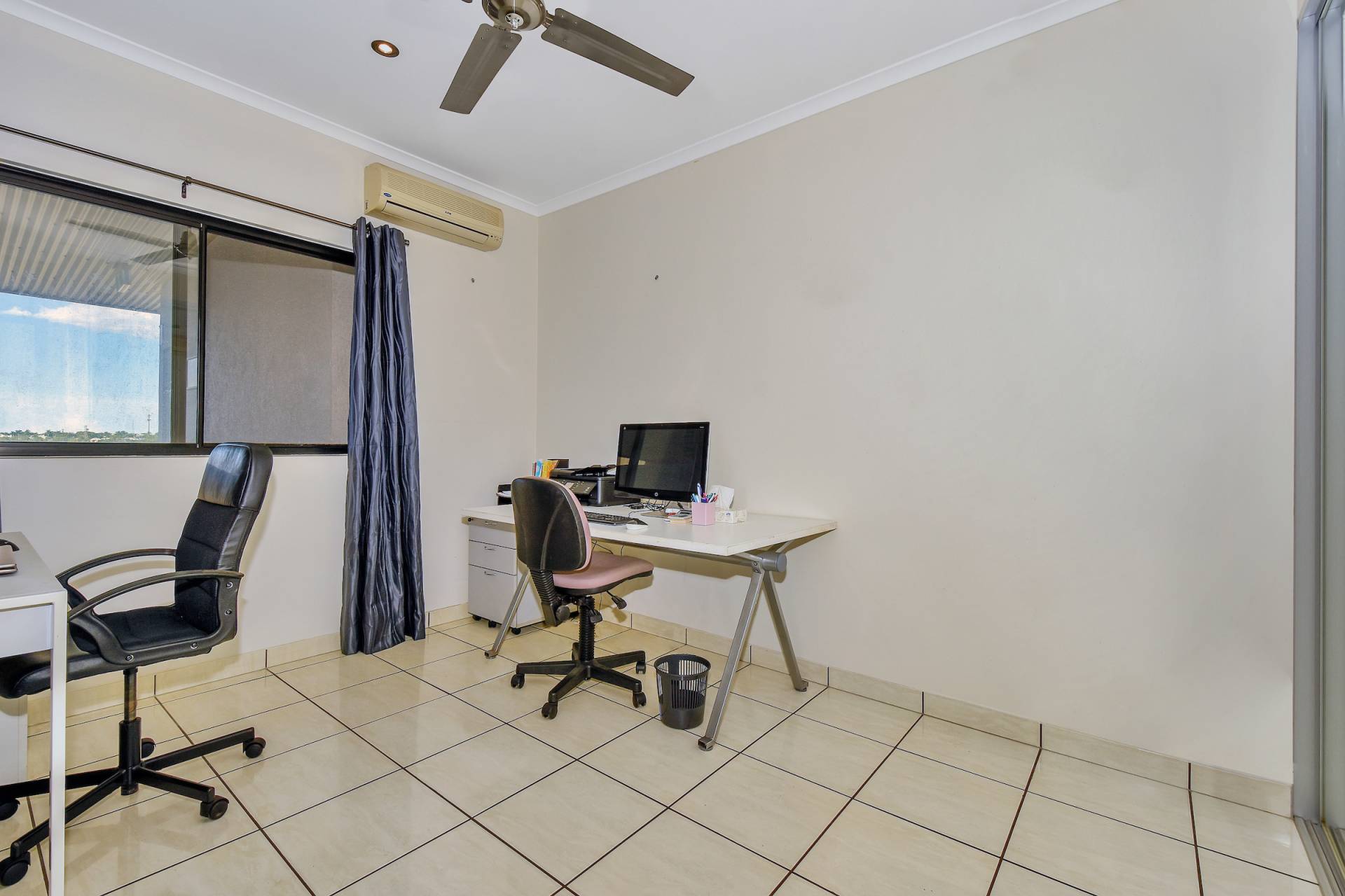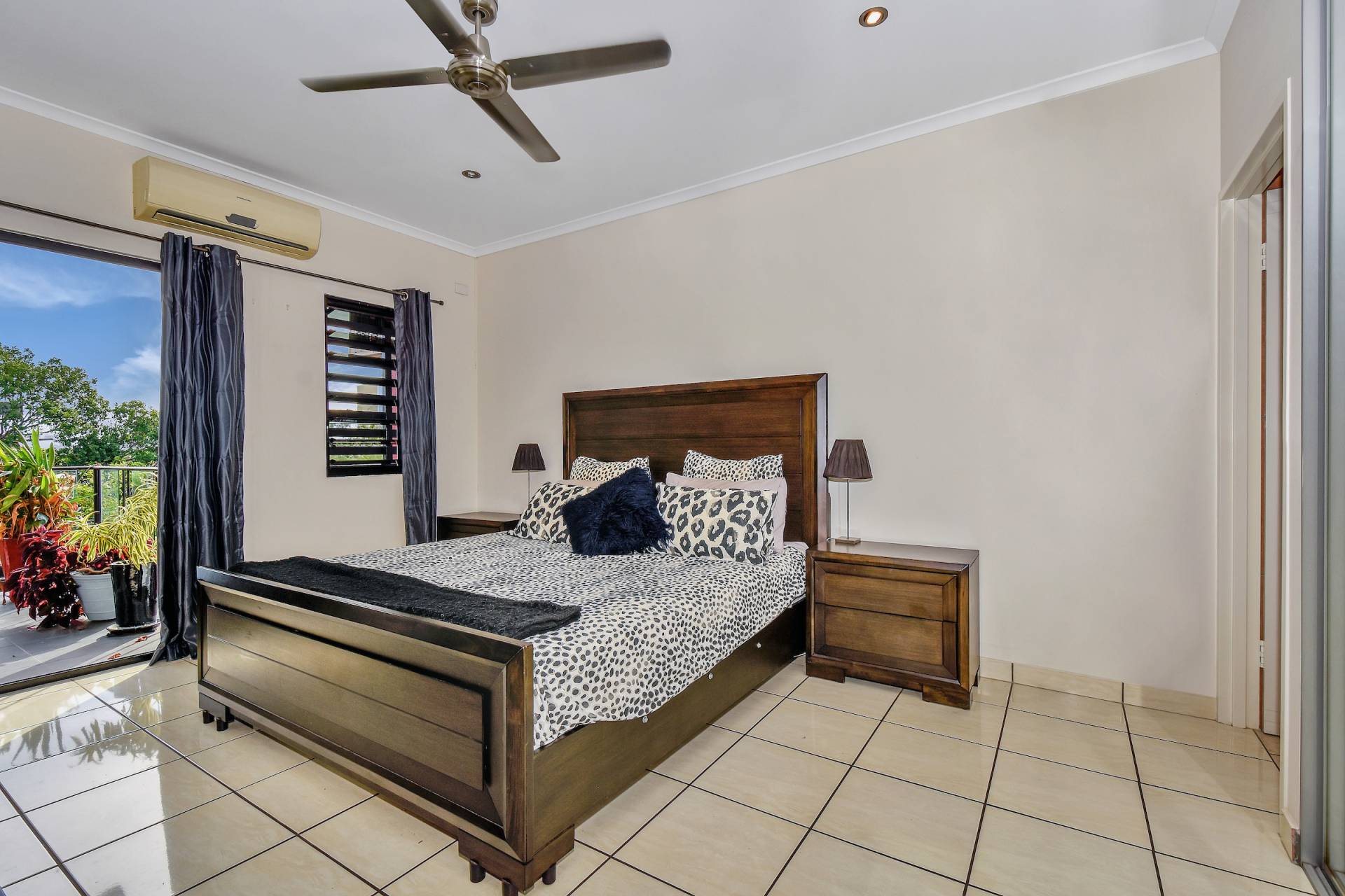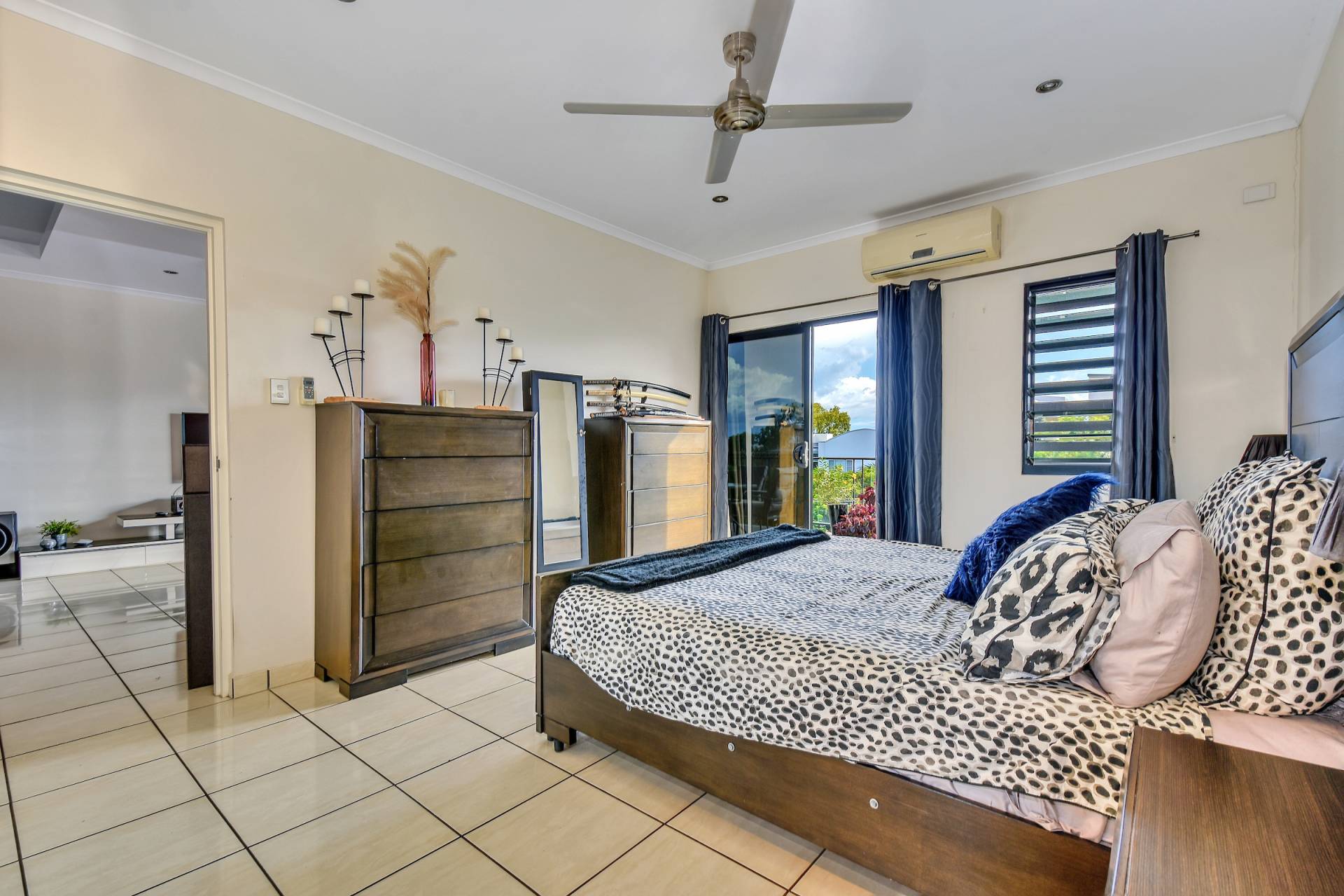 The master bedroom is front facing and enjoys views from the sliding doors that open onto the veranda. This bedroom also includes an ensuite bathroom while two other bedrooms each have a BIR and tiled flooring along with A/C and a fresh coat of paint.