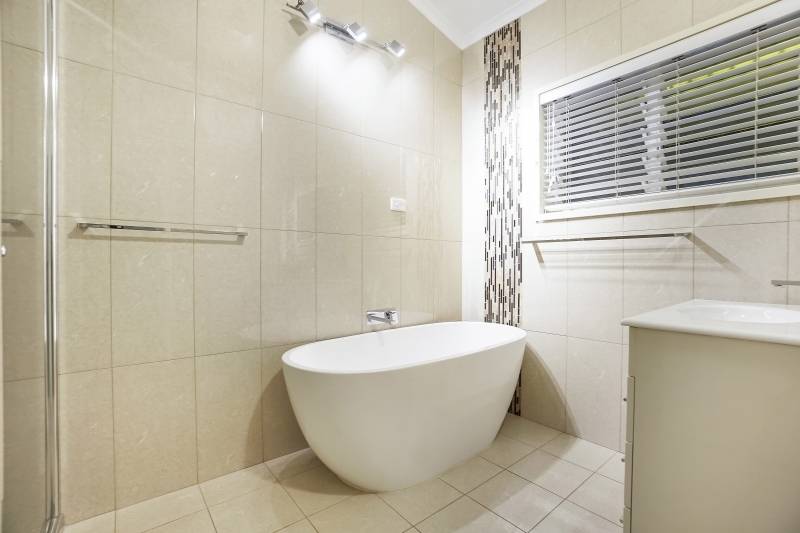 The stylish family-sized main bathroom has been superbly renovated with floor-to-ceiling tiles and features a corner shower, striking freestanding bath and separate toilet.