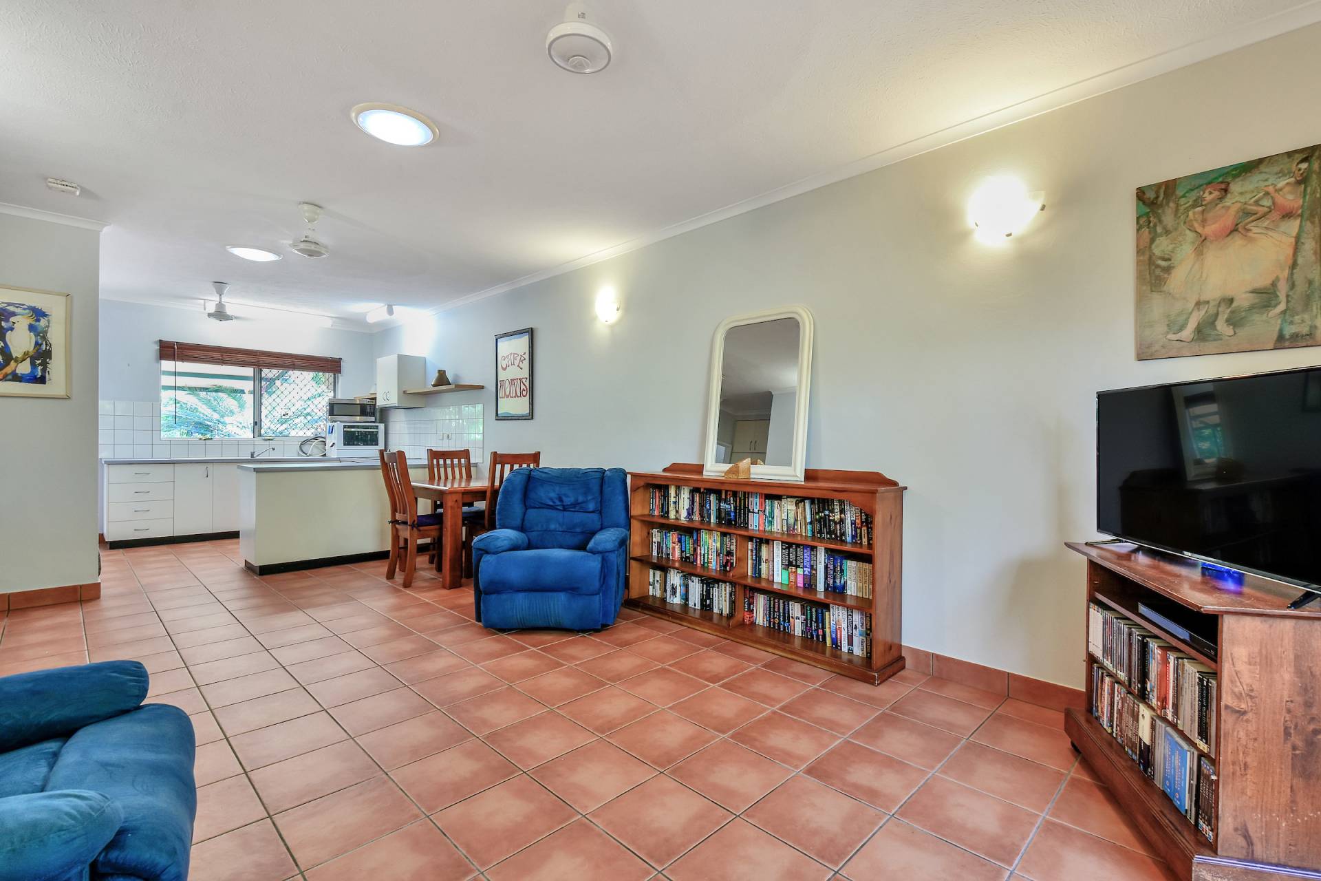 At the front of this pet freindly home is a screened in front porch that is sheltered with tropical gardens and a paved area where you can secure your push bike or greet guests. Inside is a sweeping open plan living and dining room with the kitchen positioned at the rear. These internal living areas are light and breezy and include tiled flooring underfoot.