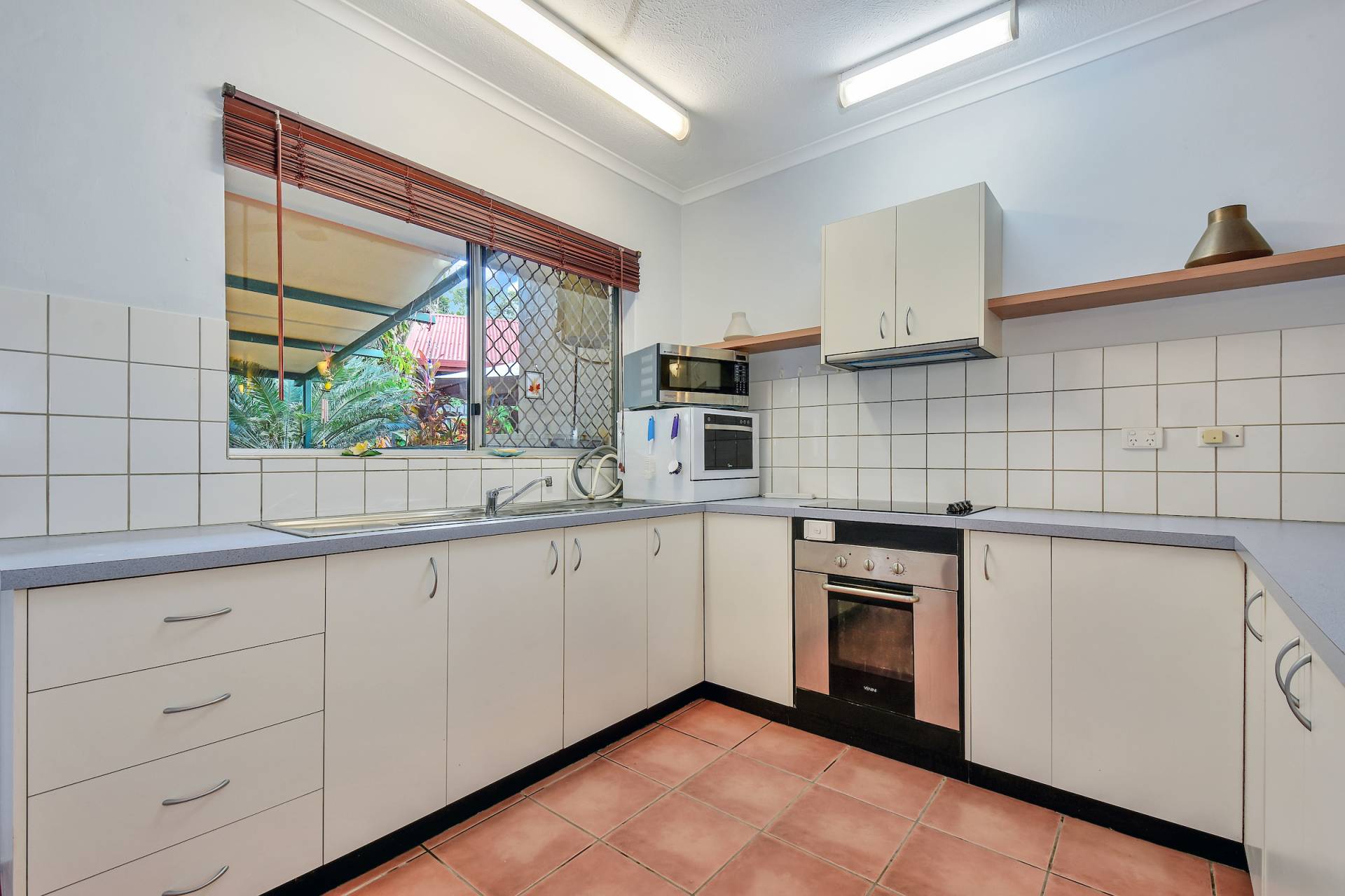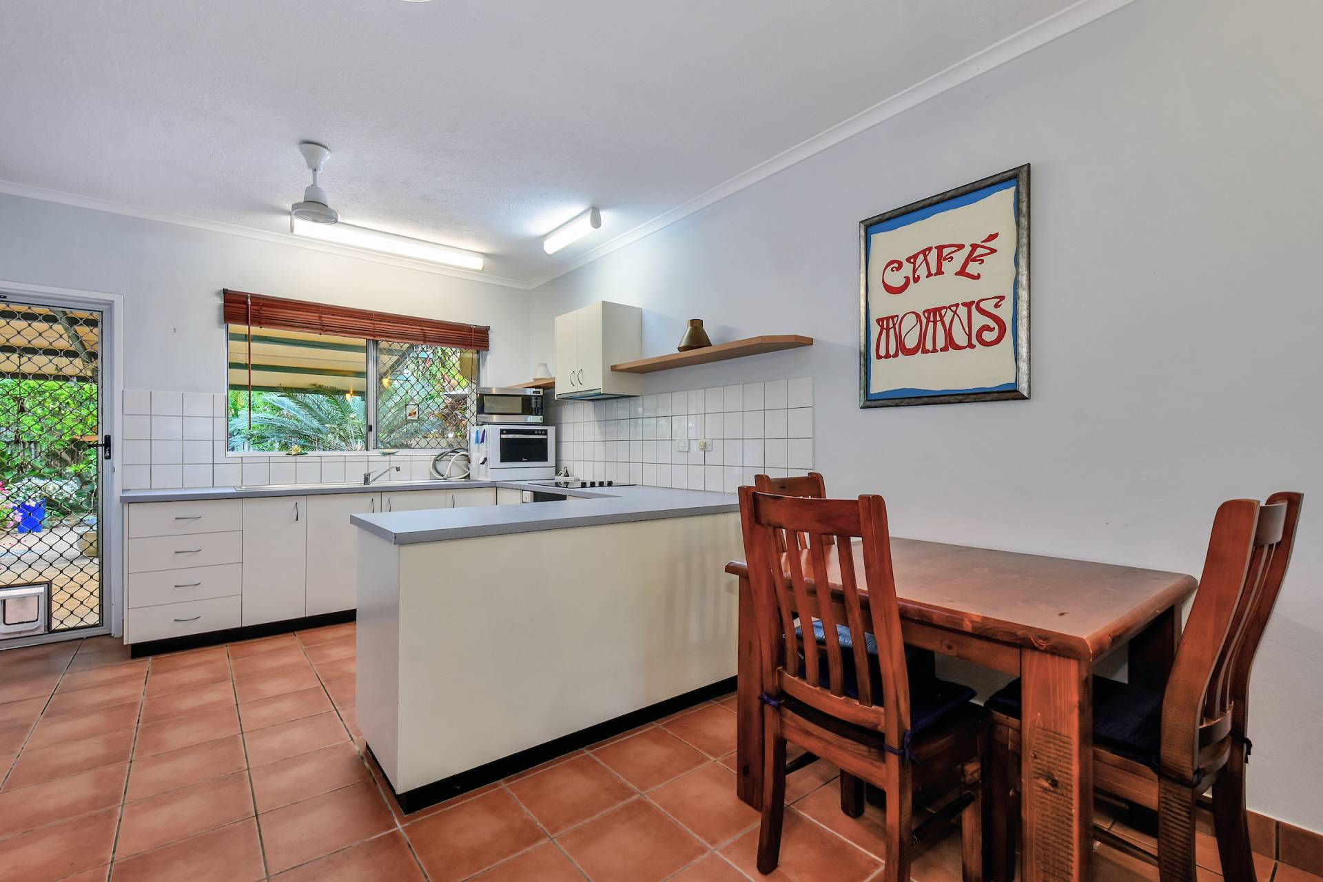 The kitchen is spacious and well designed for everyday cooking with wrap around counters that include plenty of under bench storage along with overhead shelving / displays and access through to the courtyard for easy outdoor dining options.