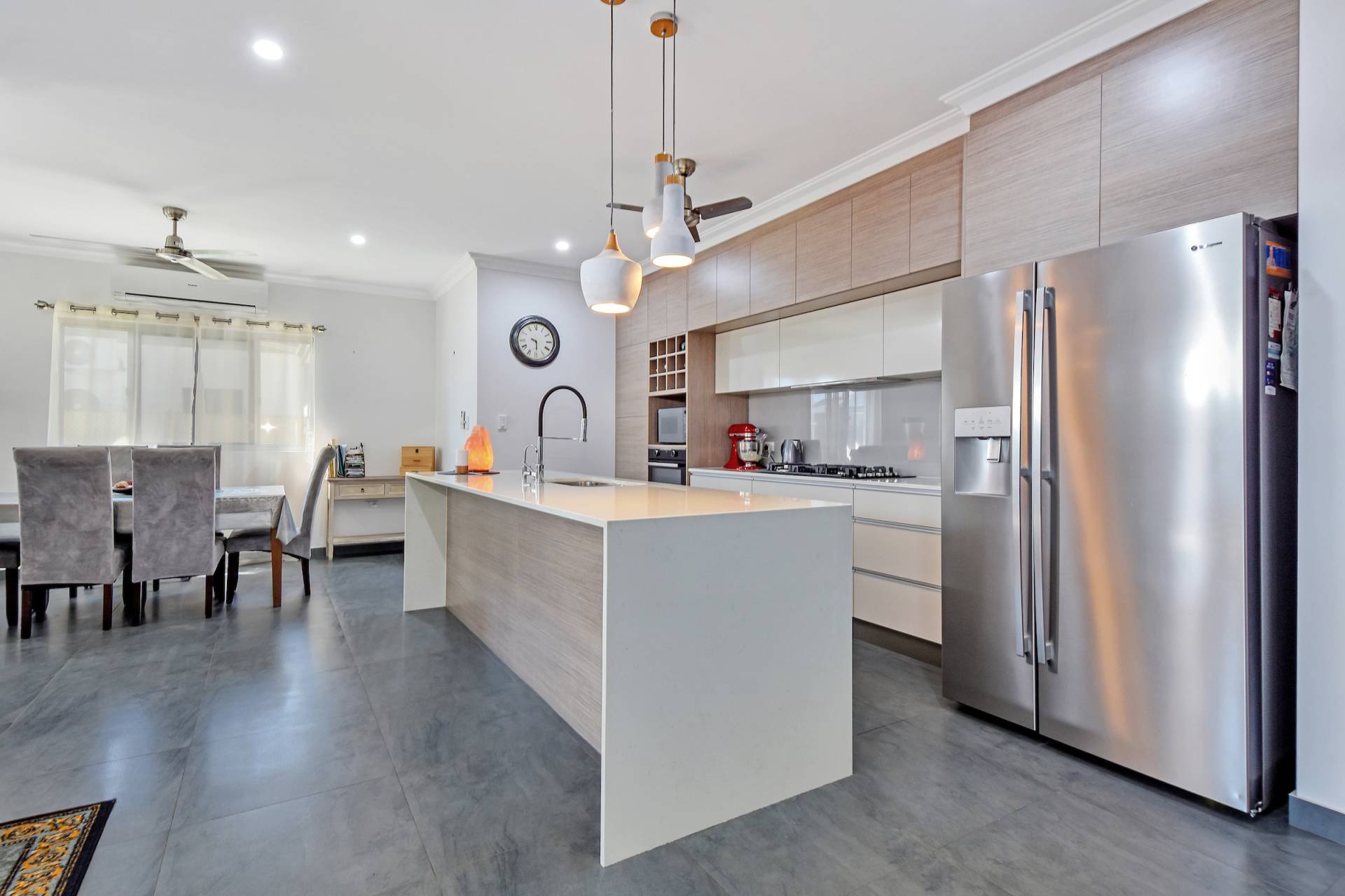 Inside is a fully air-conditioned sweeping open plan living, dining and kitchen area with grey tiles underfoot and large windows that let in plenty of light to this well proportioned space. The kitchen boasts a large island bench with stone counters, overhead storage, plus pantry and dishwasher with views through the double opening doors that lead through to the side verandah where you can host a party or BBQ with the family.