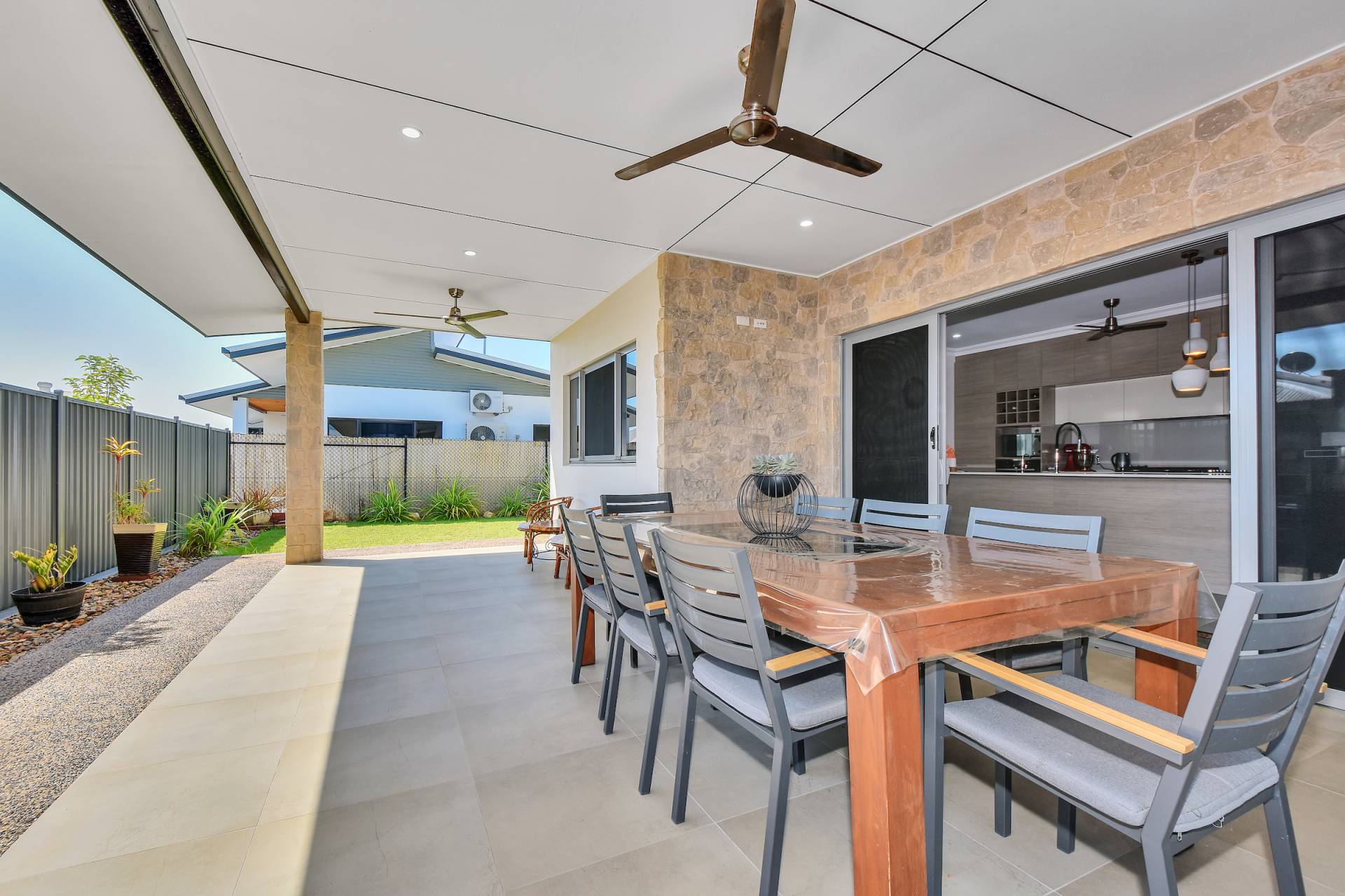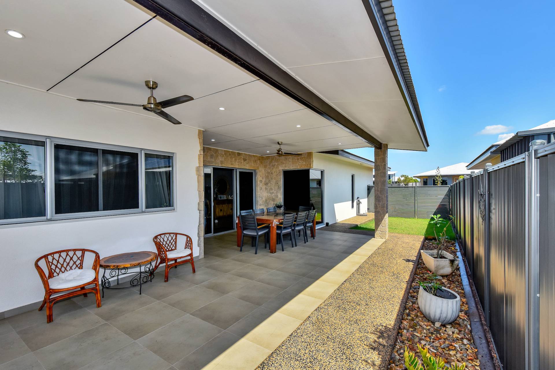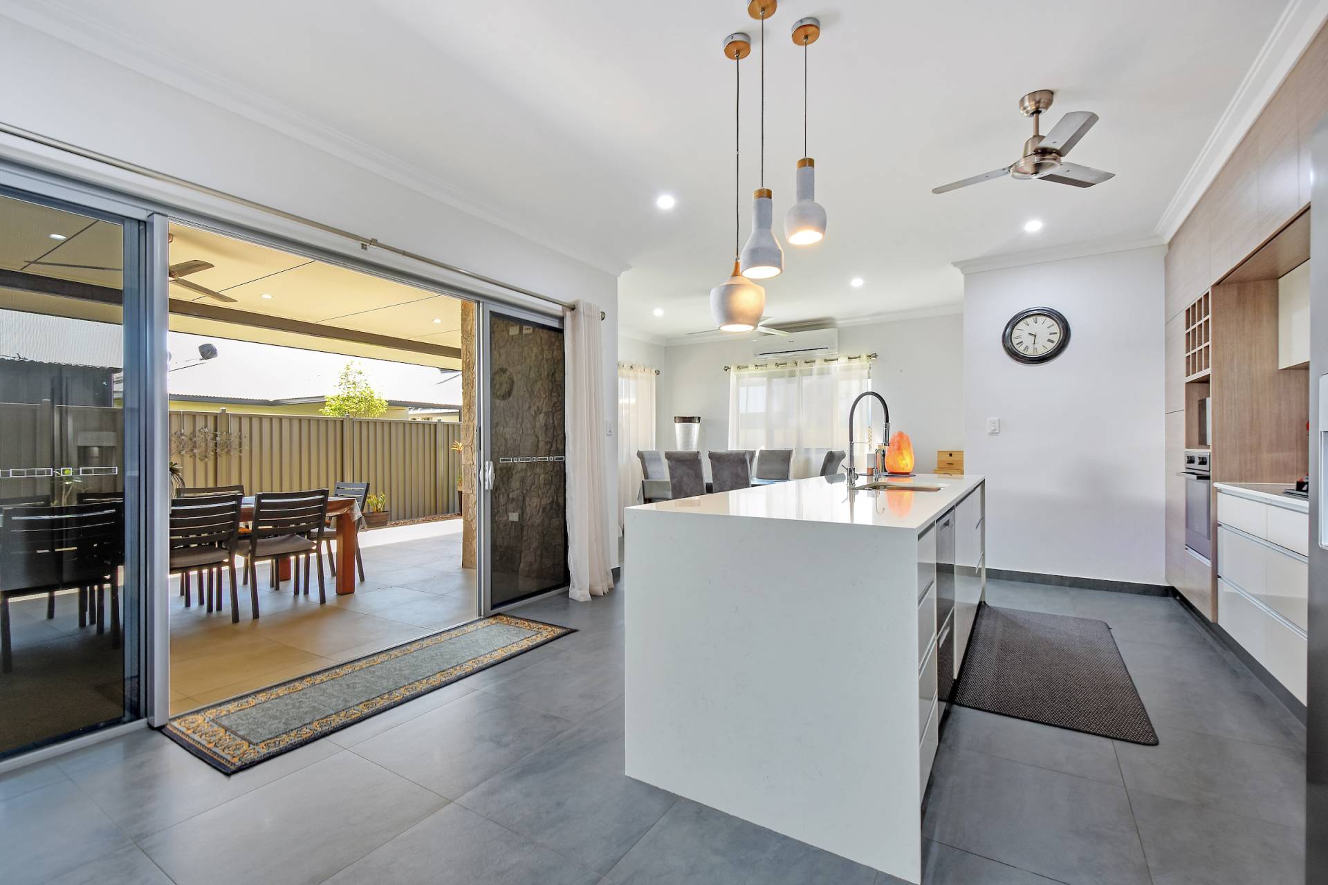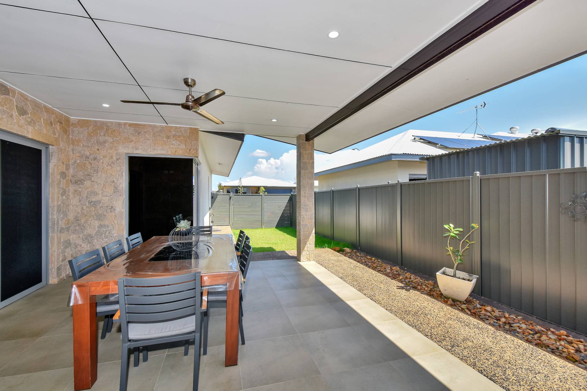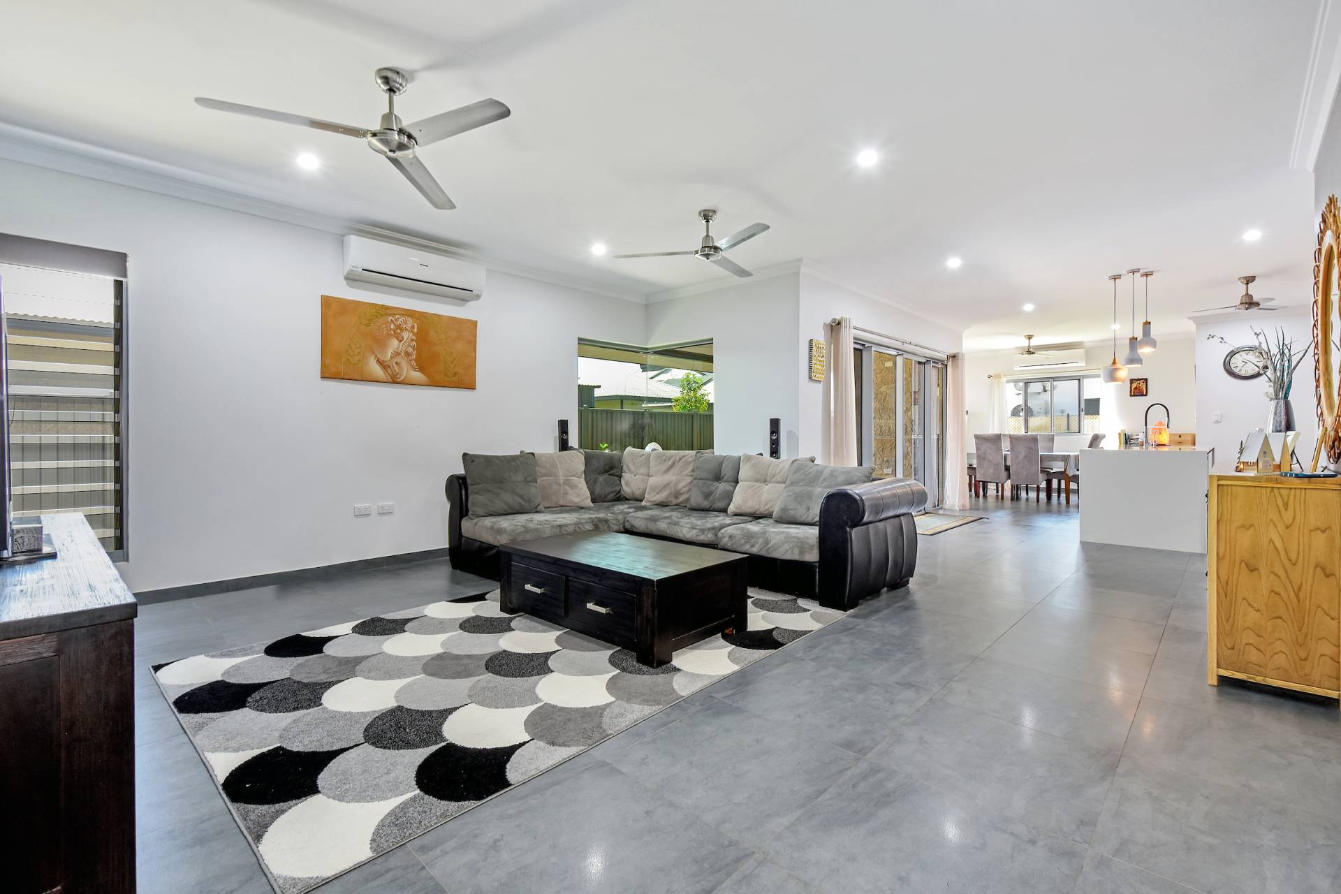 • Dual opening sliding doors lead through to the side verandah and grassy outdoor areas