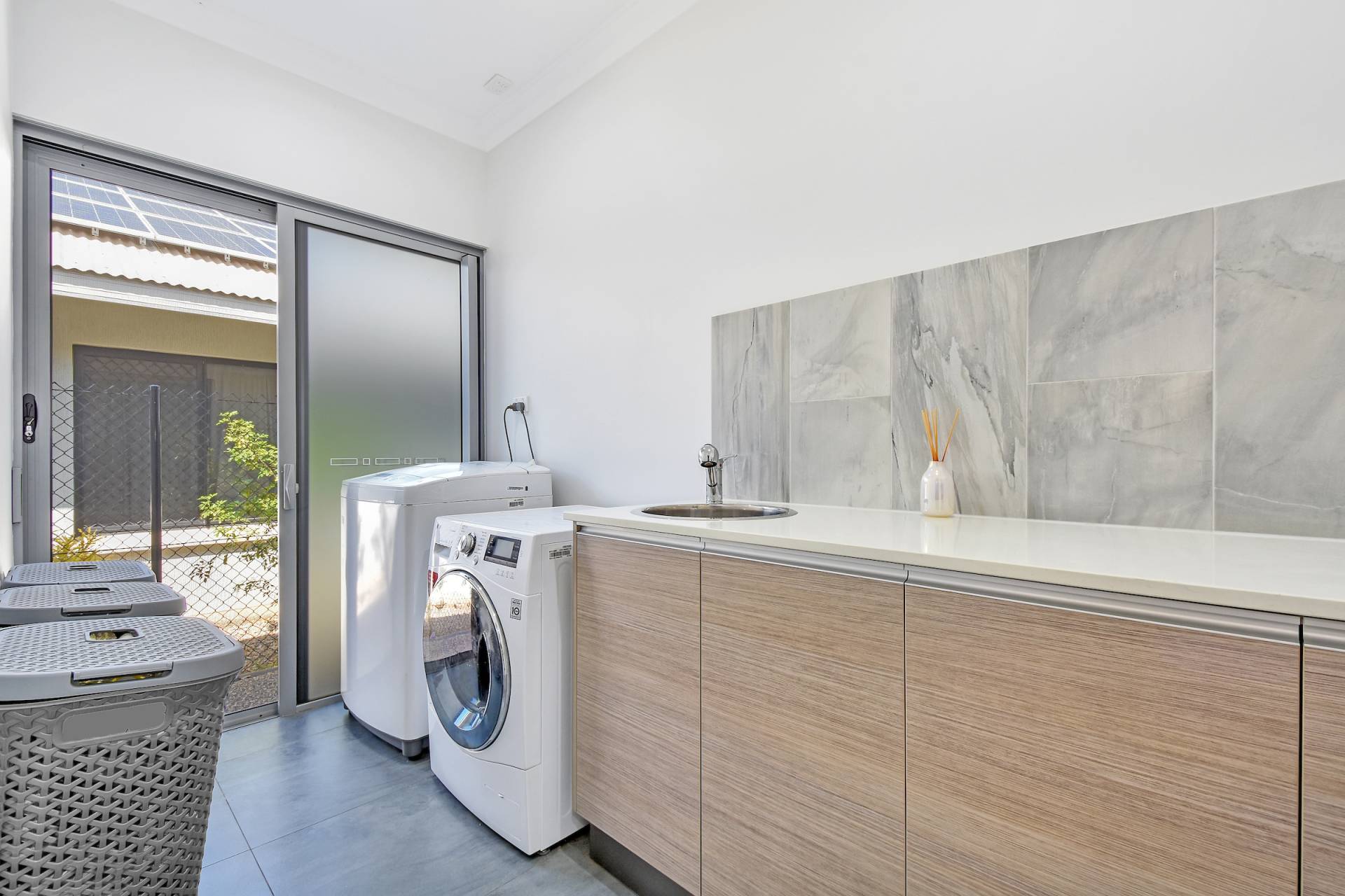 • Internal laundry room with a bounty of storage and sliding door to yard