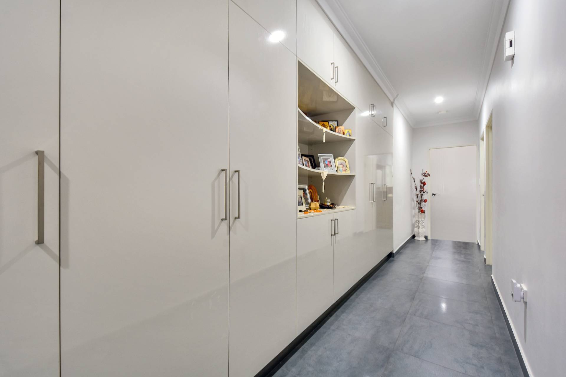 • Hallway linen closet with nearly 5 metres of storage space and display area
