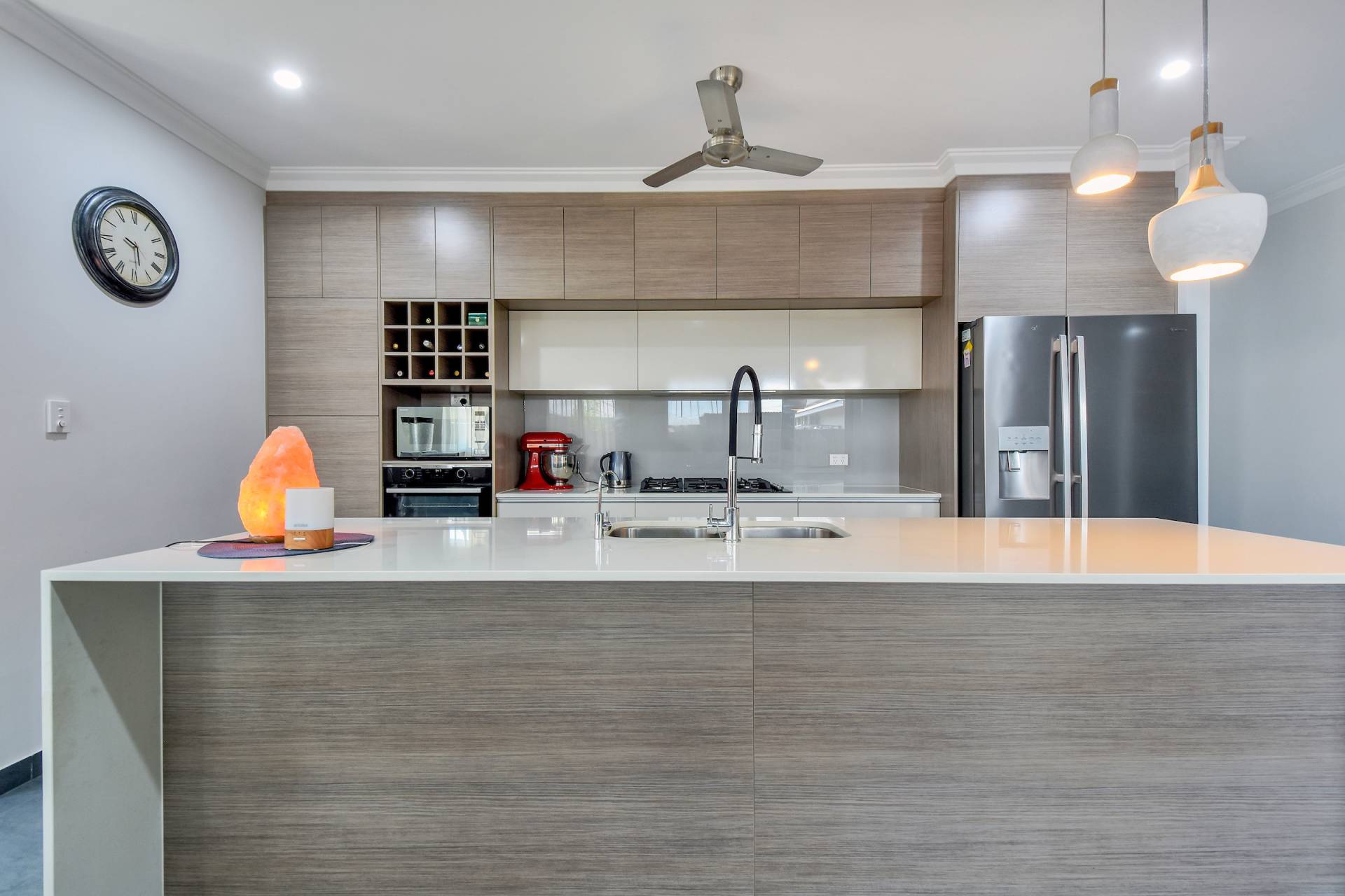 • Kitchen has GAS cooking stone counters with massive island prep bench, overhead storage, pantry and dishwasher