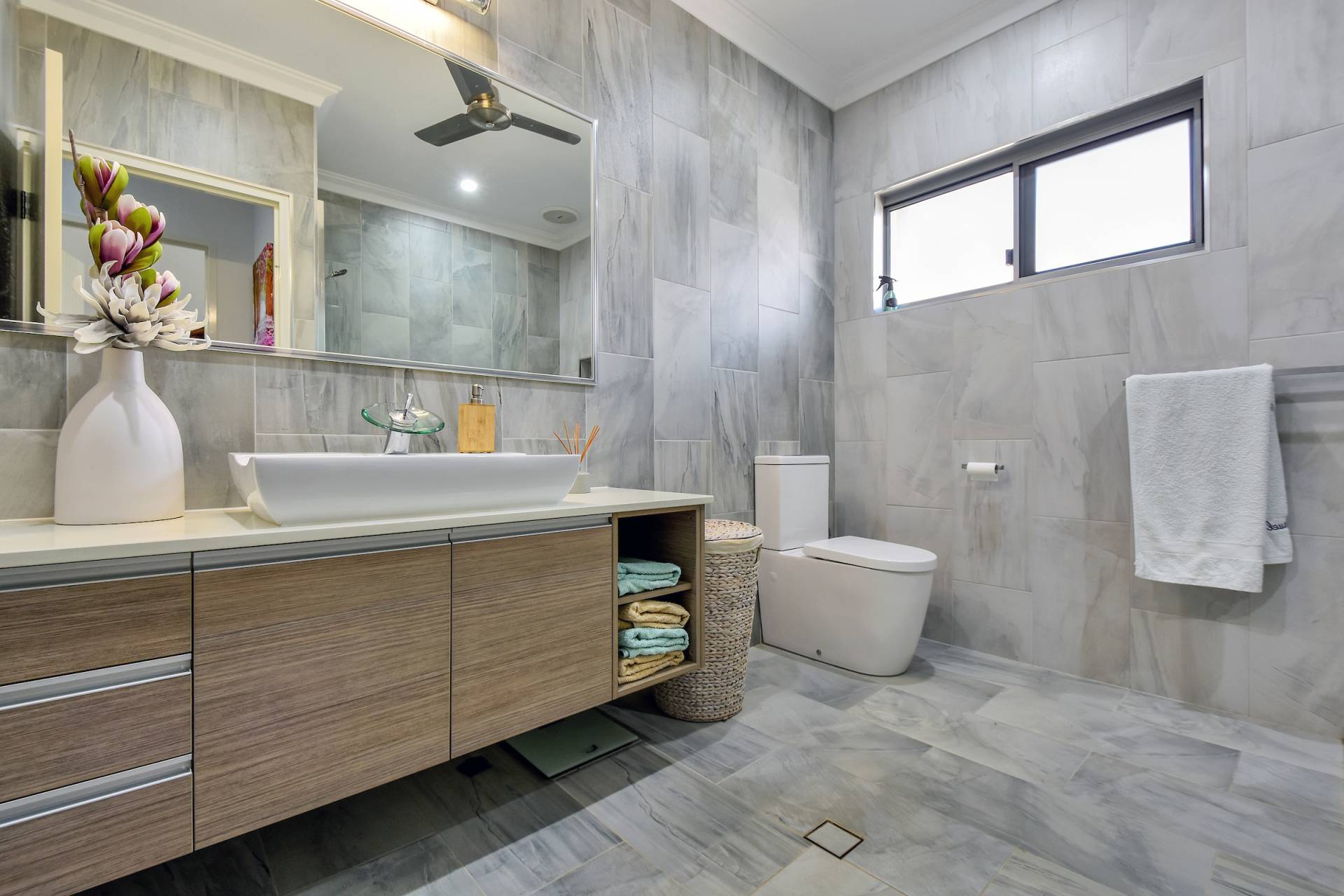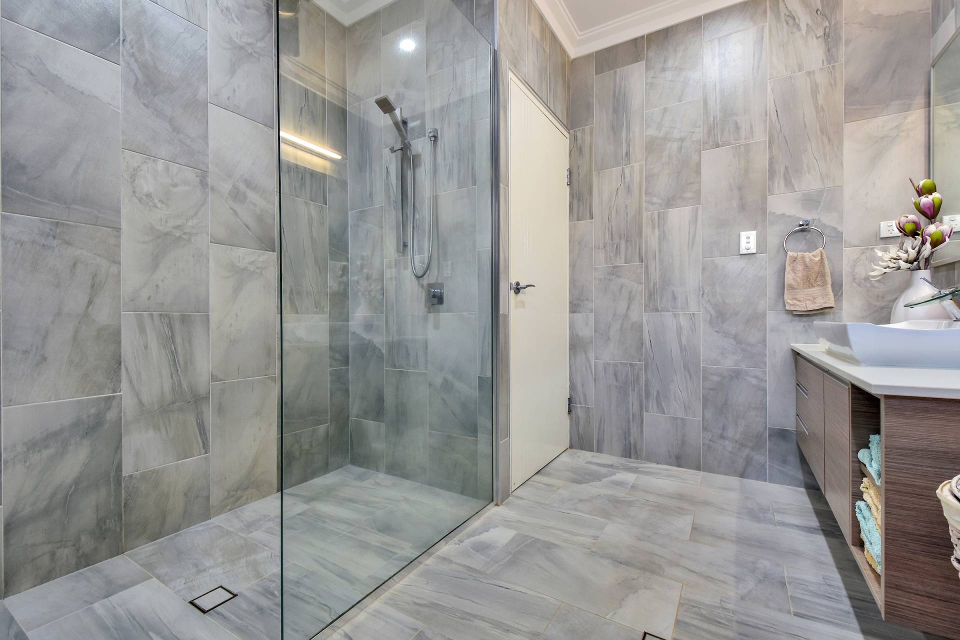 The main bathroom is also luxurious with a large walk in shower and vanity with built in storage. The internal laundry room includes cupboards, facilities for two washing machines, and sliding door access through to the yard, whilst in the hallway is an impressive linen closet with a bounty of cupboard space and a display shelf.
