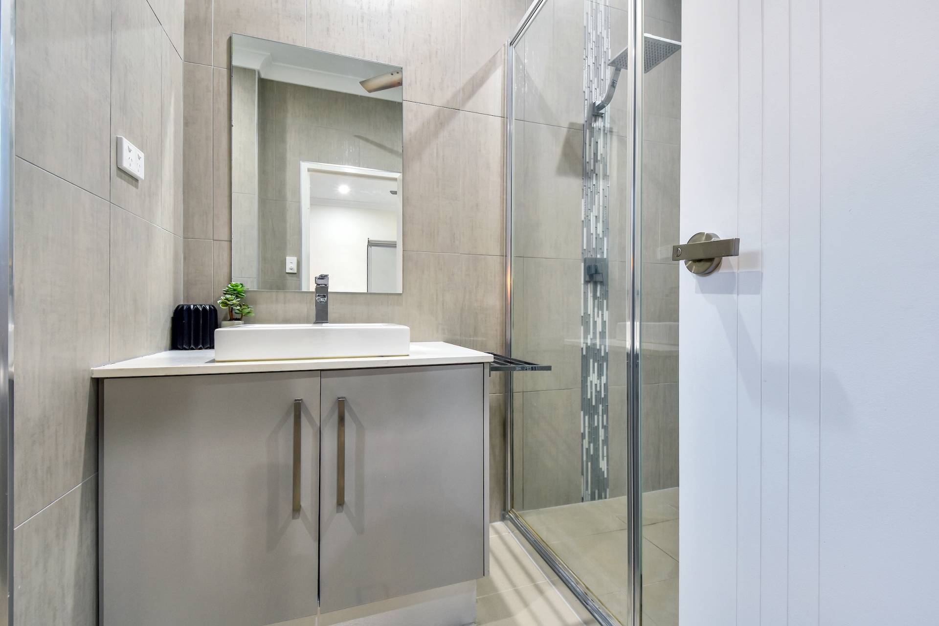 The home has instant WOW factor from the street with an impressive front façade, striking roofline and feature front door with glass panels that peep through to the lux interior beyond. At the front of the home is the master bedroom suite with dual pendant lighting strung low either side of the king bed with a dramatic dark feature wall to dim the lights. This room is enhanced further with an ensuite bathroom with dual showers and a walk in robe as well.