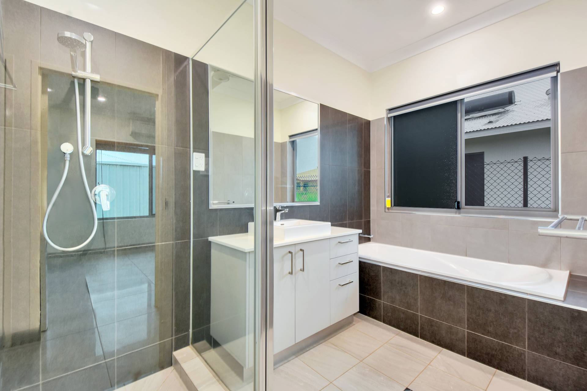 Each of four bedrooms includes tiled flooring along with A/C and large windows to let in the natural light. The media room has also got tiled flooring and A/C. The master bedroom is of course enhanced with a generous layout that includes a private ensuite bathroom and a walk in robe. The main bathroom offers a relaxing bath tub plus central vanity and a shower along with separate toilet.
