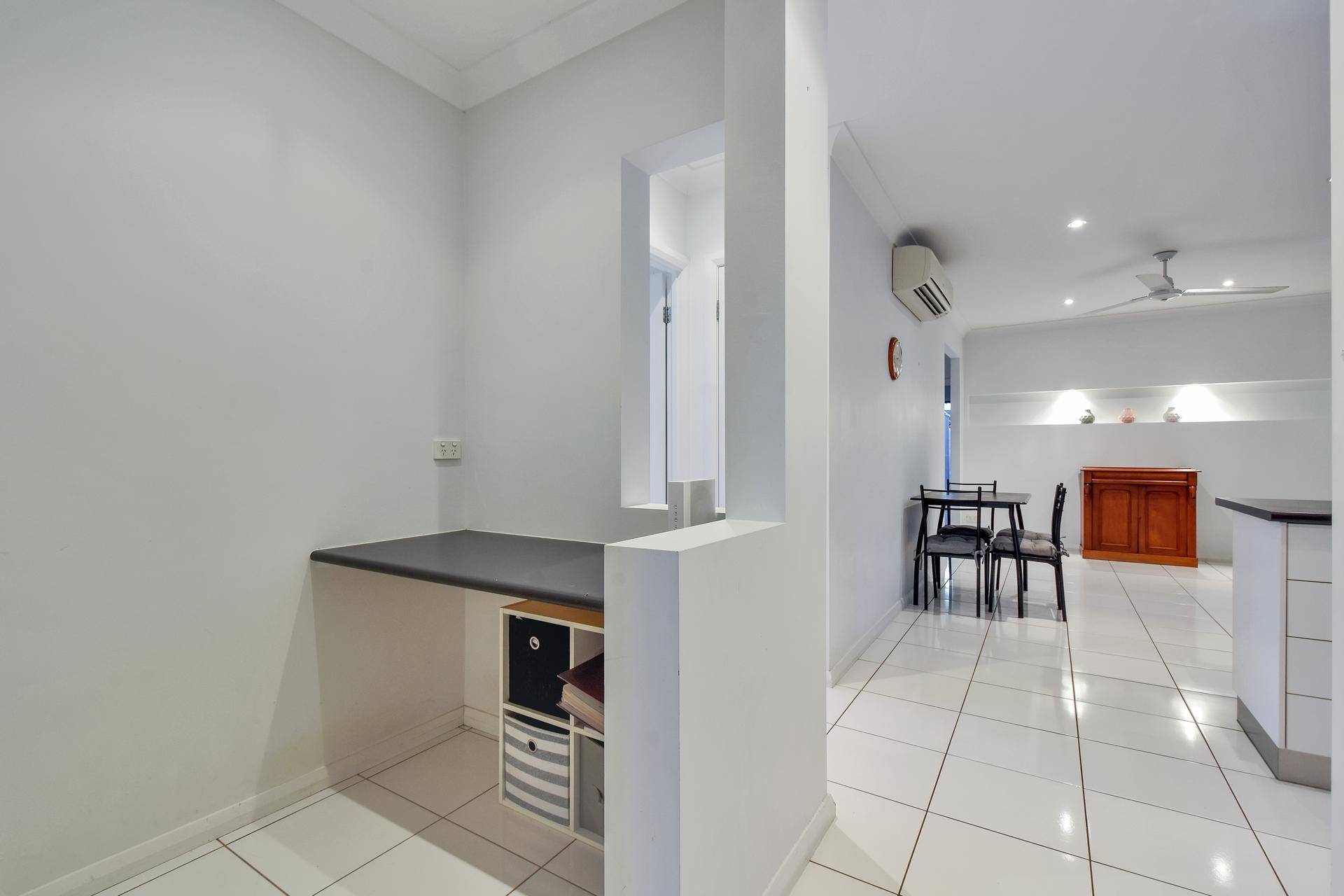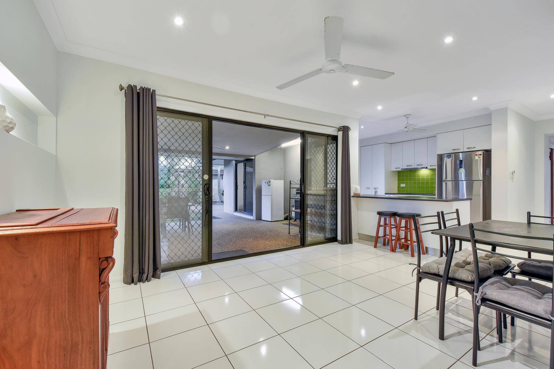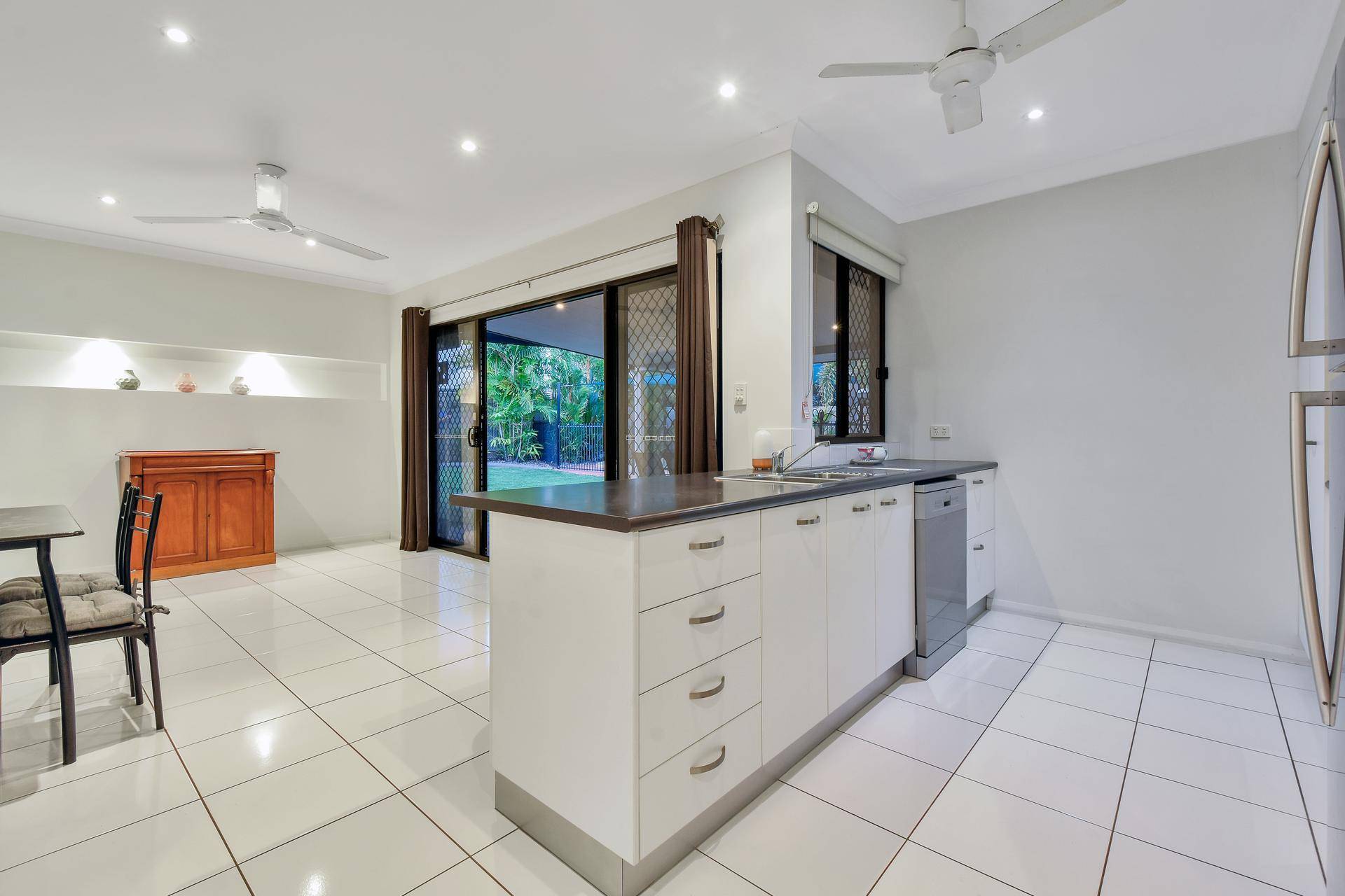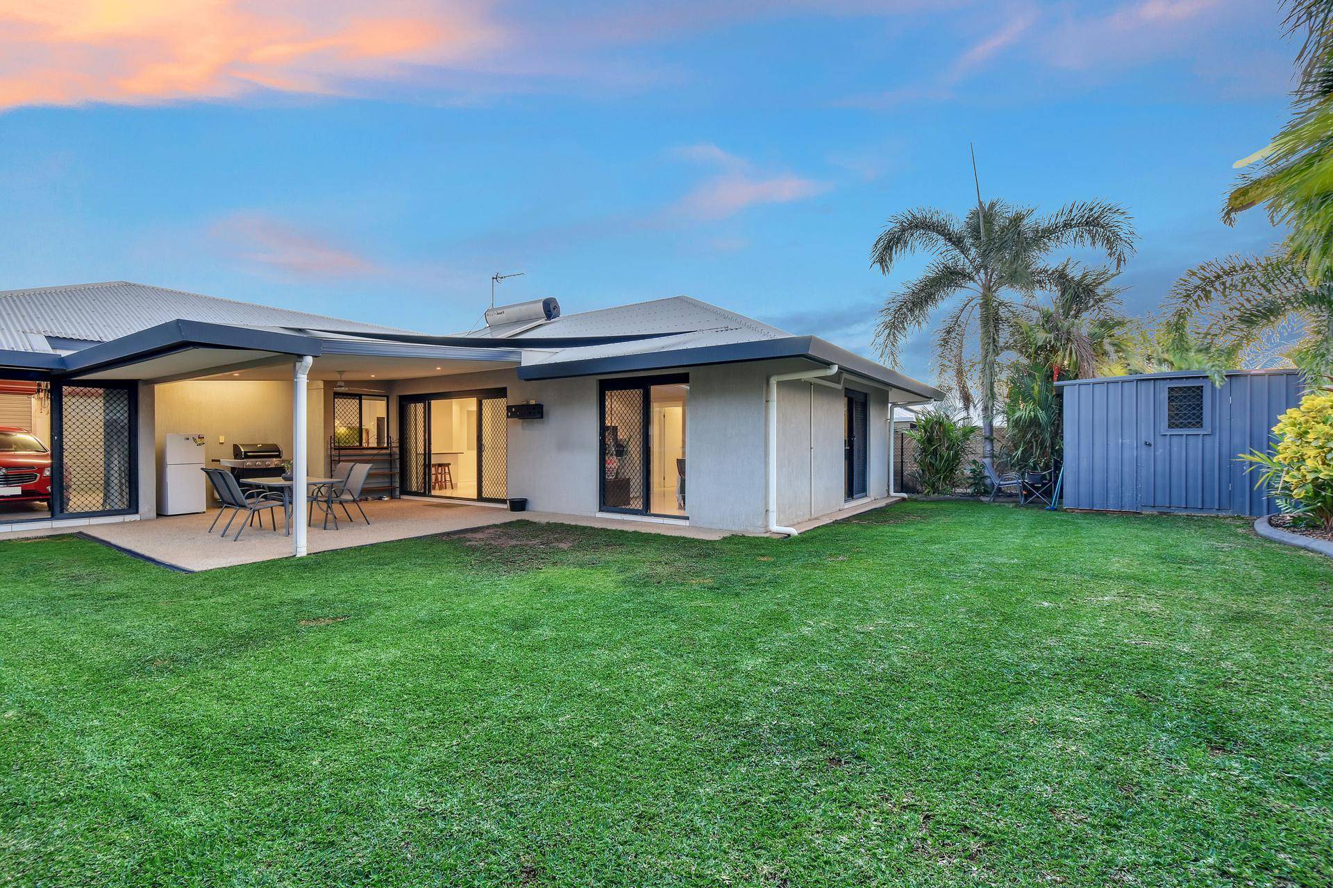 The home then opens up into the living spaces with a separate study nook, kitchen and dining room. The kitchen includes a feature splashback along with S/S appliances and dishwasher plus a servery / breakfast bar into the dining room. Twin sliding doors open onto the entertaining verandah that in turn over looks the swimming pool and grassy yard space where the kids and pets can explore. Screened with tropical gardens, the backyard is private.