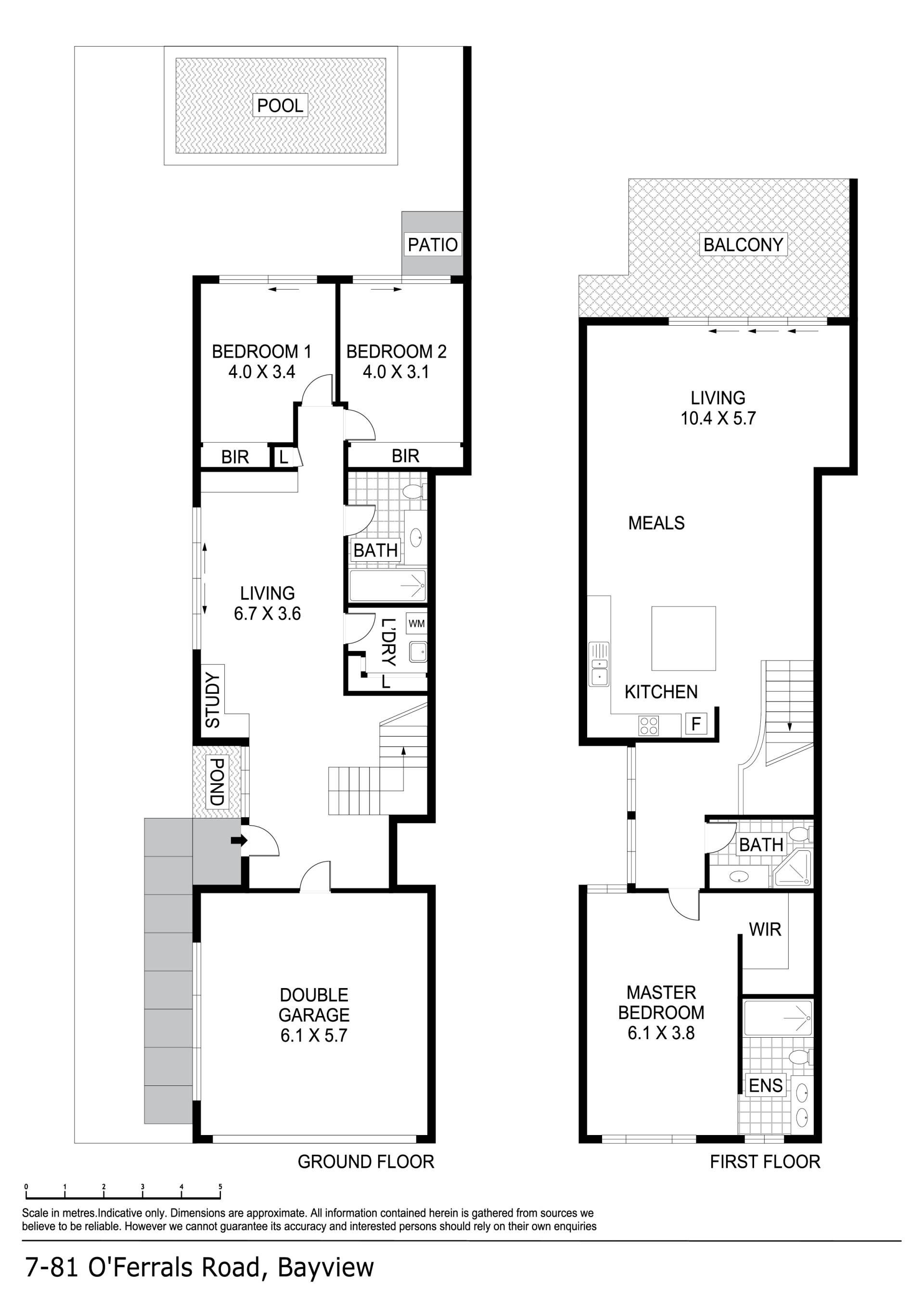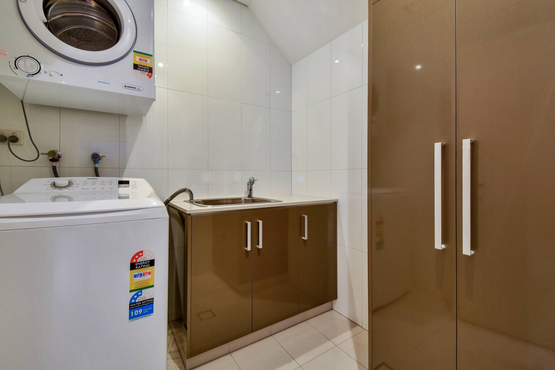 On the ground floor of this impeccable home is a large family room with sliding doors to the courtyard and banks of louvered windows. Functional aspects include a full bathroom, the laundry room, access to the dual garage, storage and twin back facing bedrooms with poolside views and robes.