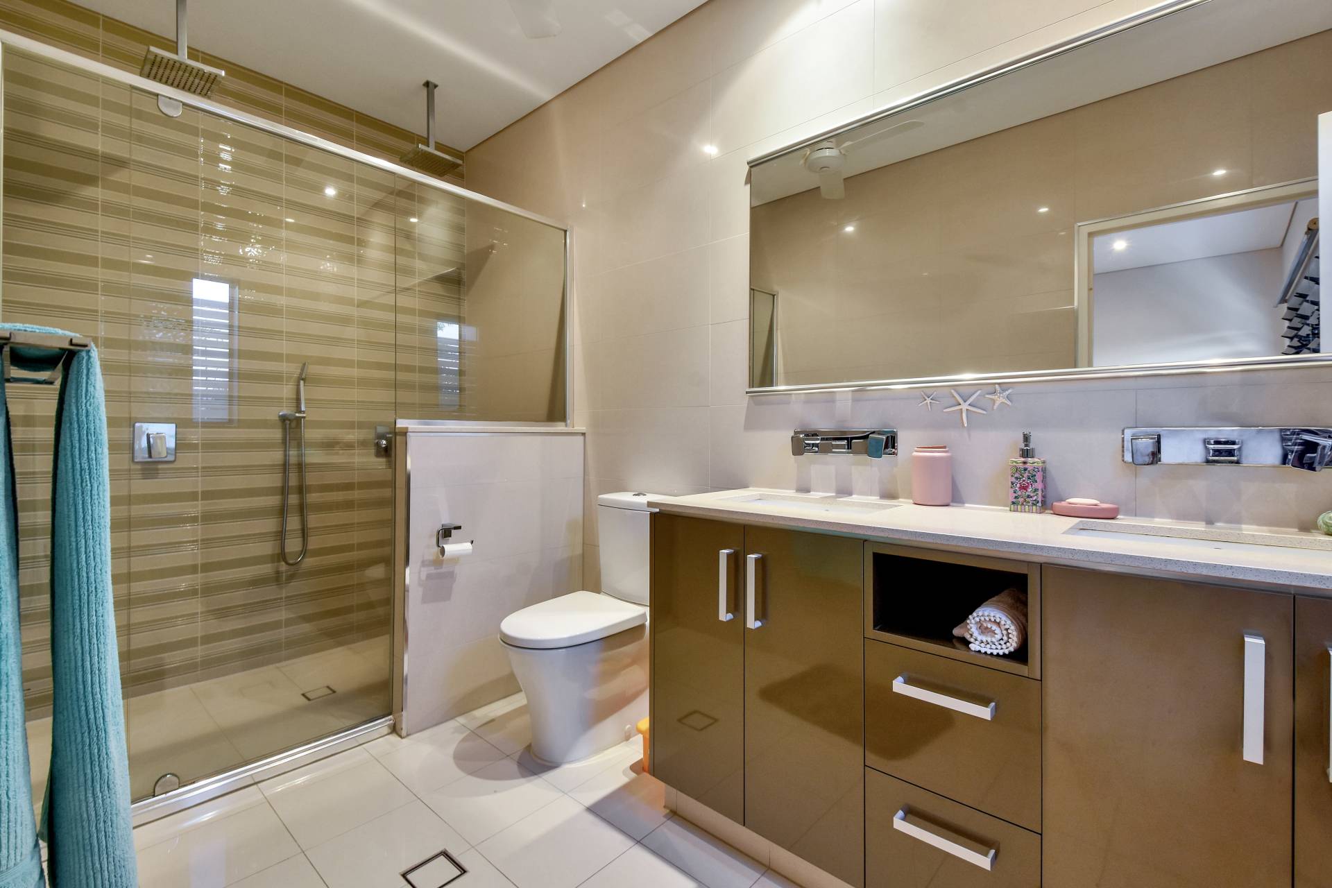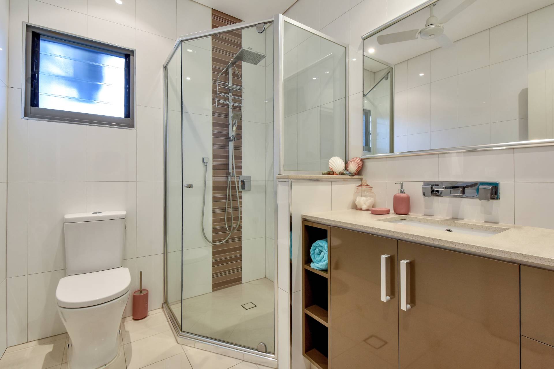 The master bedroom suite is separated from the main living areas with a small nook and another full bathroom suite. Inside is a private quarters with banks of louvers to catch the sea breezes and a private bathroom with twin shower and twin vanity.