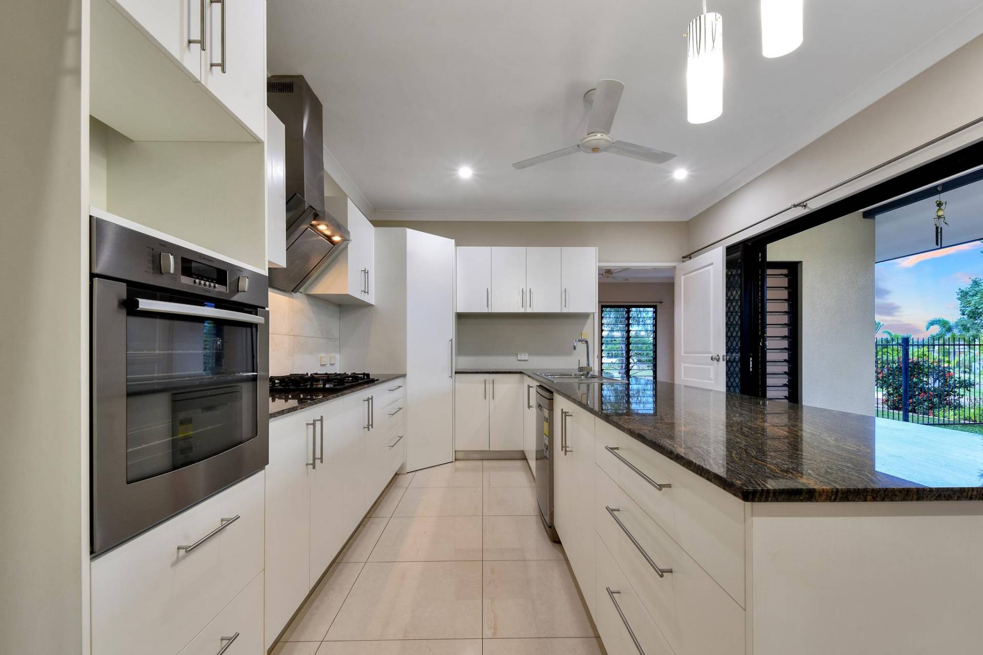 Through a privacy door the home opens into a sweeping secondary living area with a gourmet kitchen that includes GAS cooking, granite counters with SS appliances and a corner pantry along with overhead storage space galore. The open living areas here free flow through to a home office space and out via sliding doors to the verandah that is hugged against the home and overlooks the easy care established gardens and lawns.