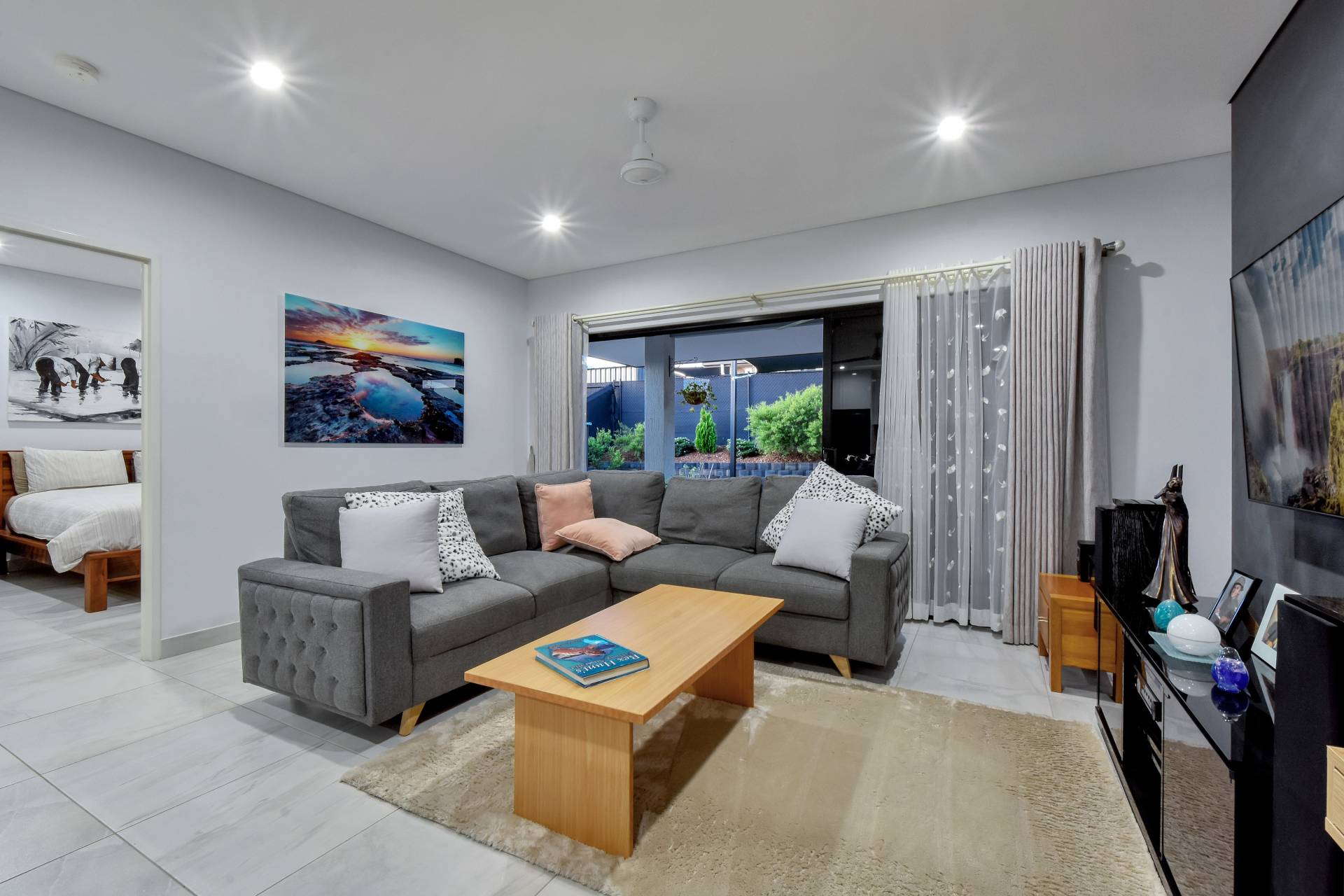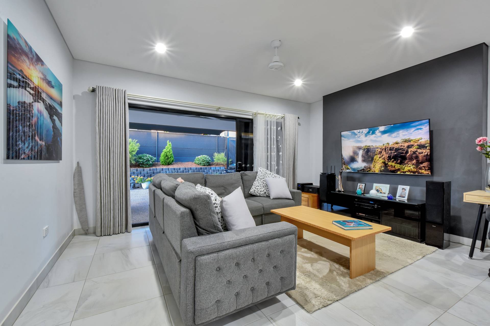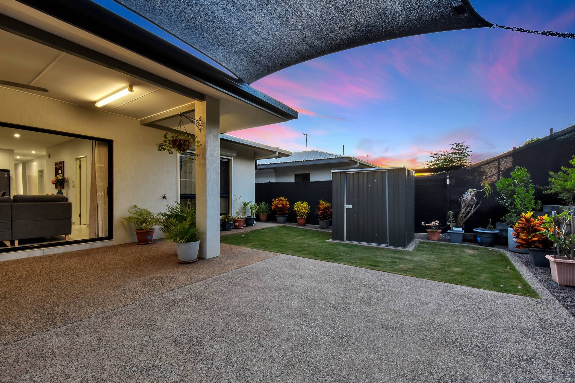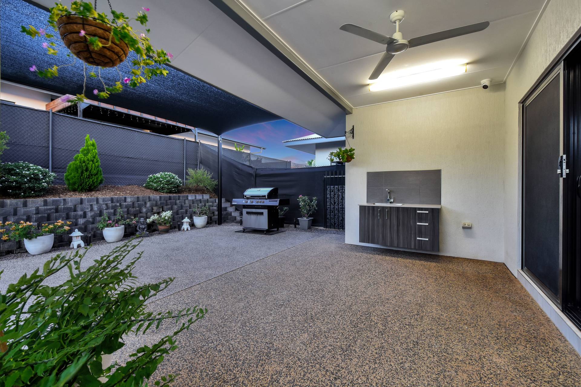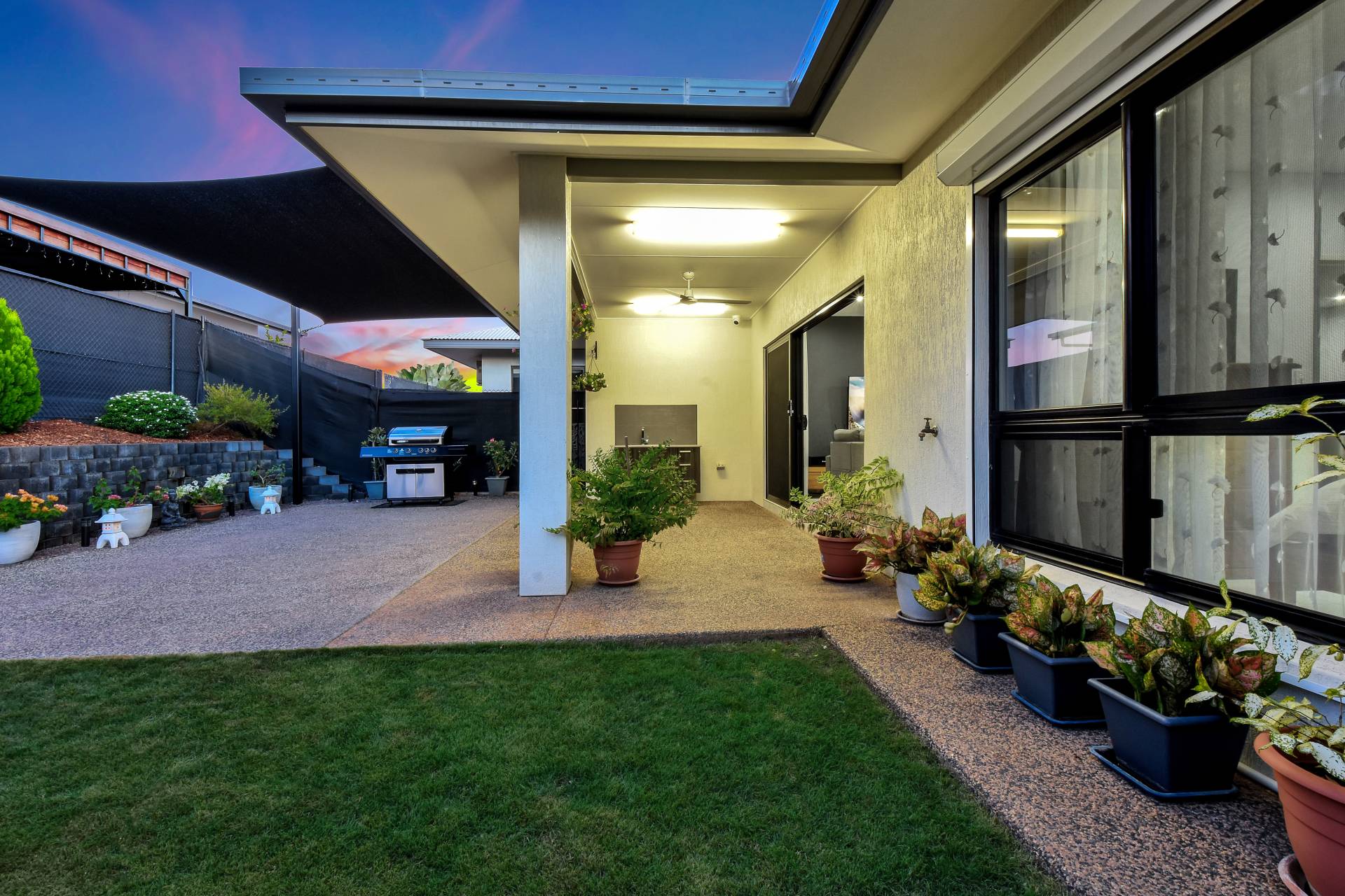 Triple opening doors slide back to reveal the outdoor kitchen with sink and gas outlet along with the feature retaining wall and established gardens that add a splash of colour. Lush lawns, a garden shed and an extended entertaining pad with shade sail complete this perfect outdoor area.