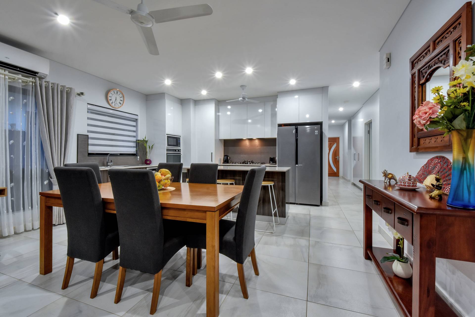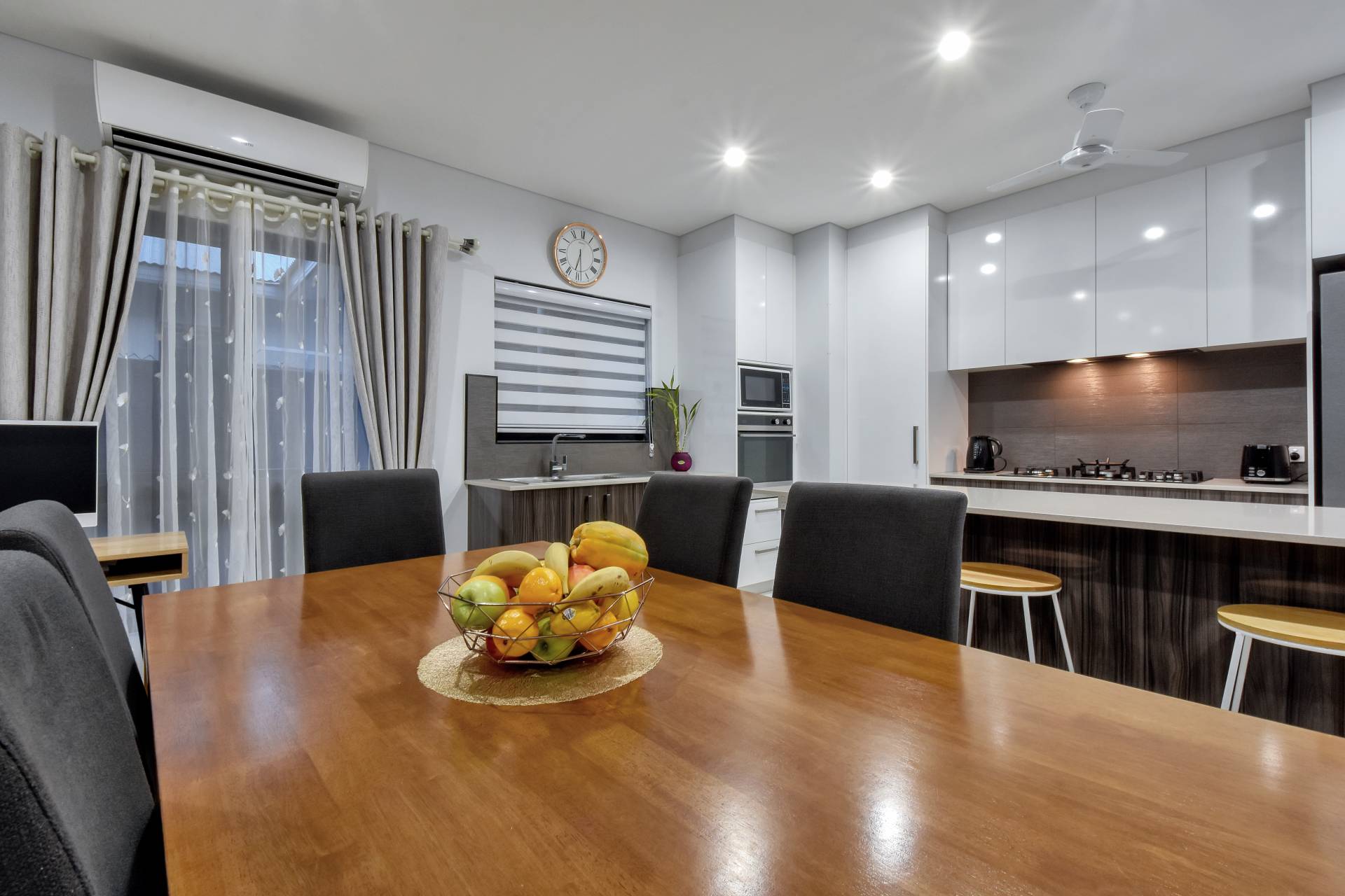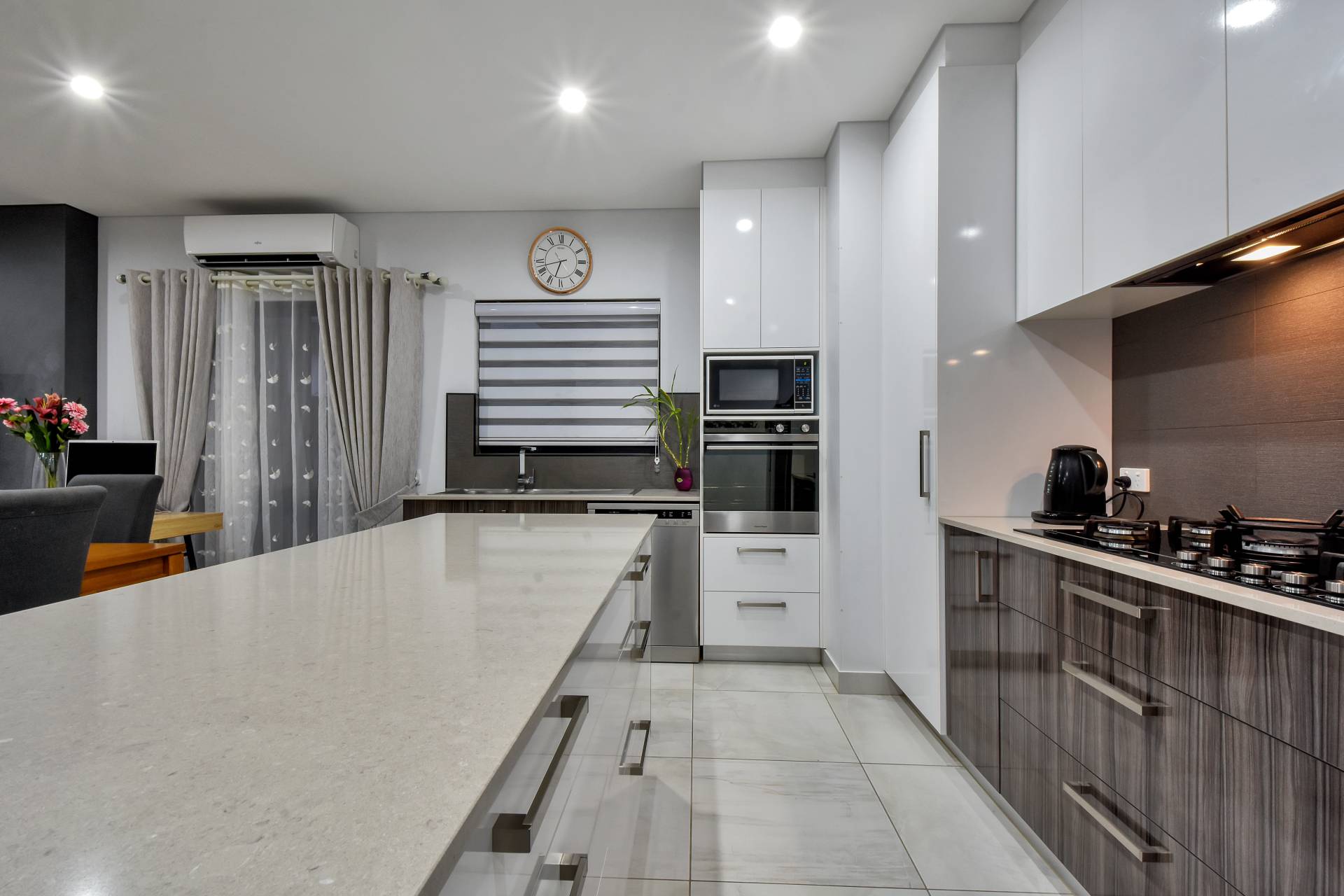 Centralised living areas include tiled flooring and A/C with a gorgeous kitchen that will excite the home cook. With bounties of storage overhead, Gas Cook top and SS appliances along with an island breakfast bar and stone counters, this is one amazing kitchen.