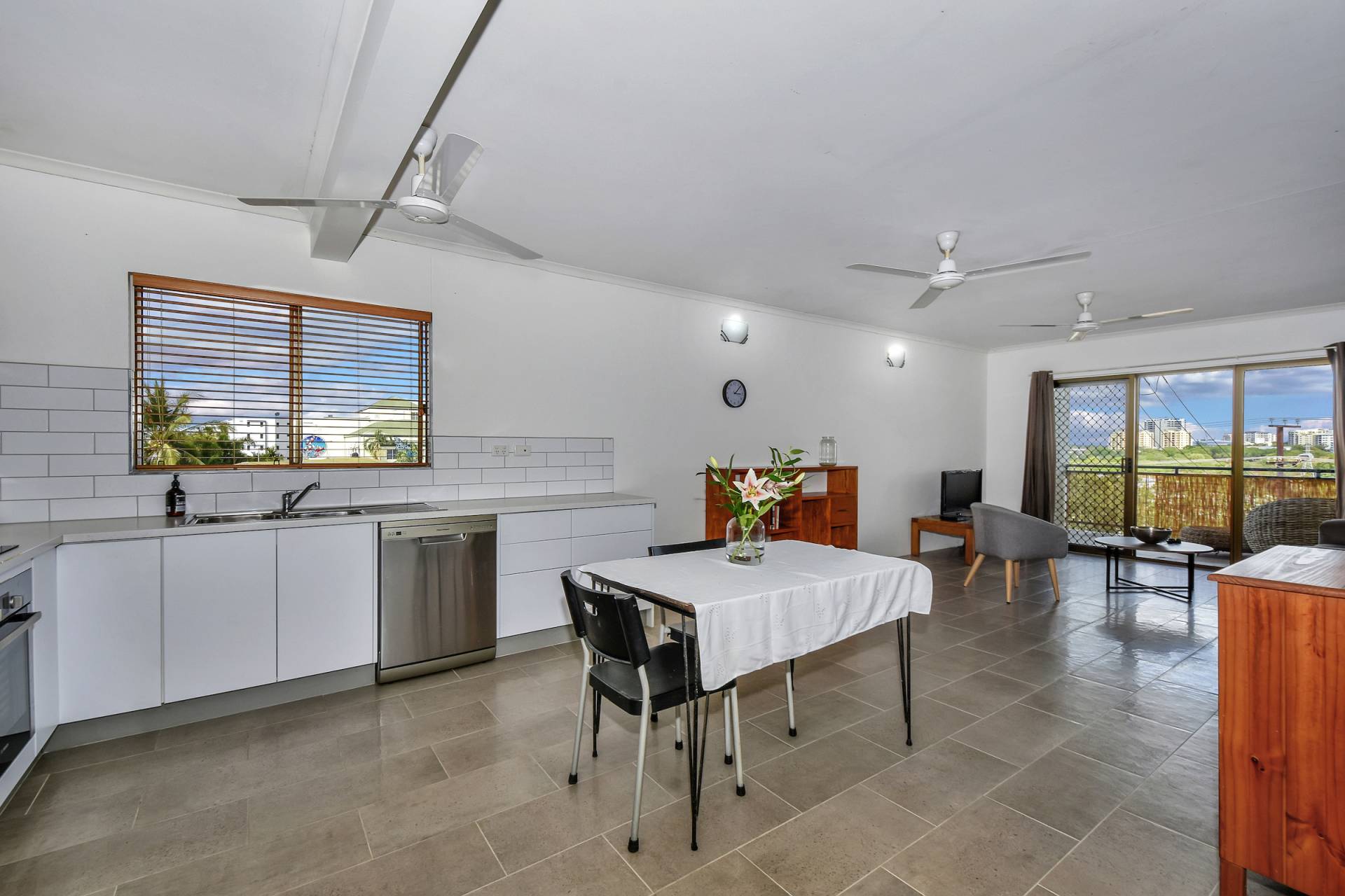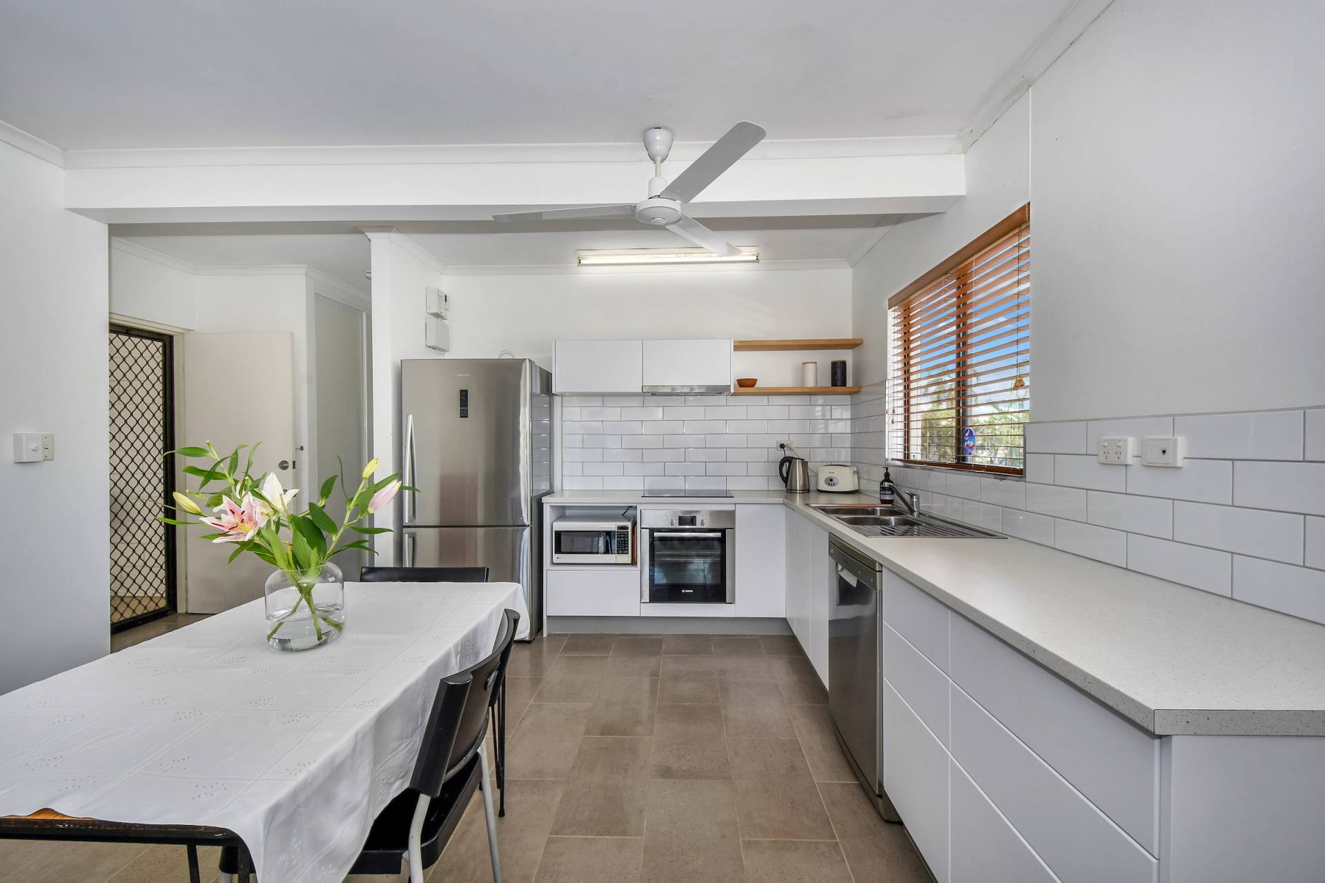 The kitchen comprises of white laminate cabinetry with a white gloss subway feature tile, loads of space and stainless-steel appliances, including a dishwasher.