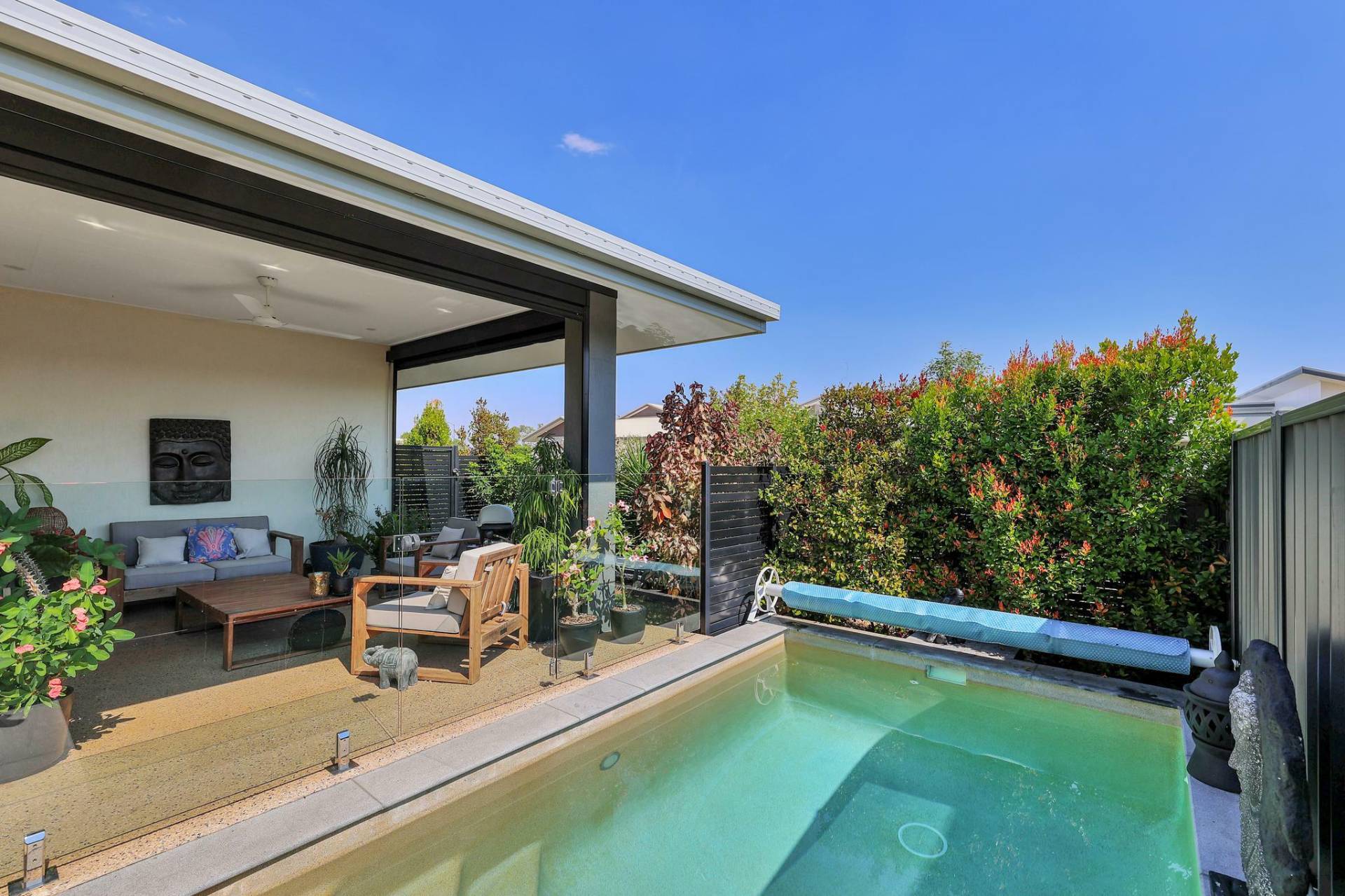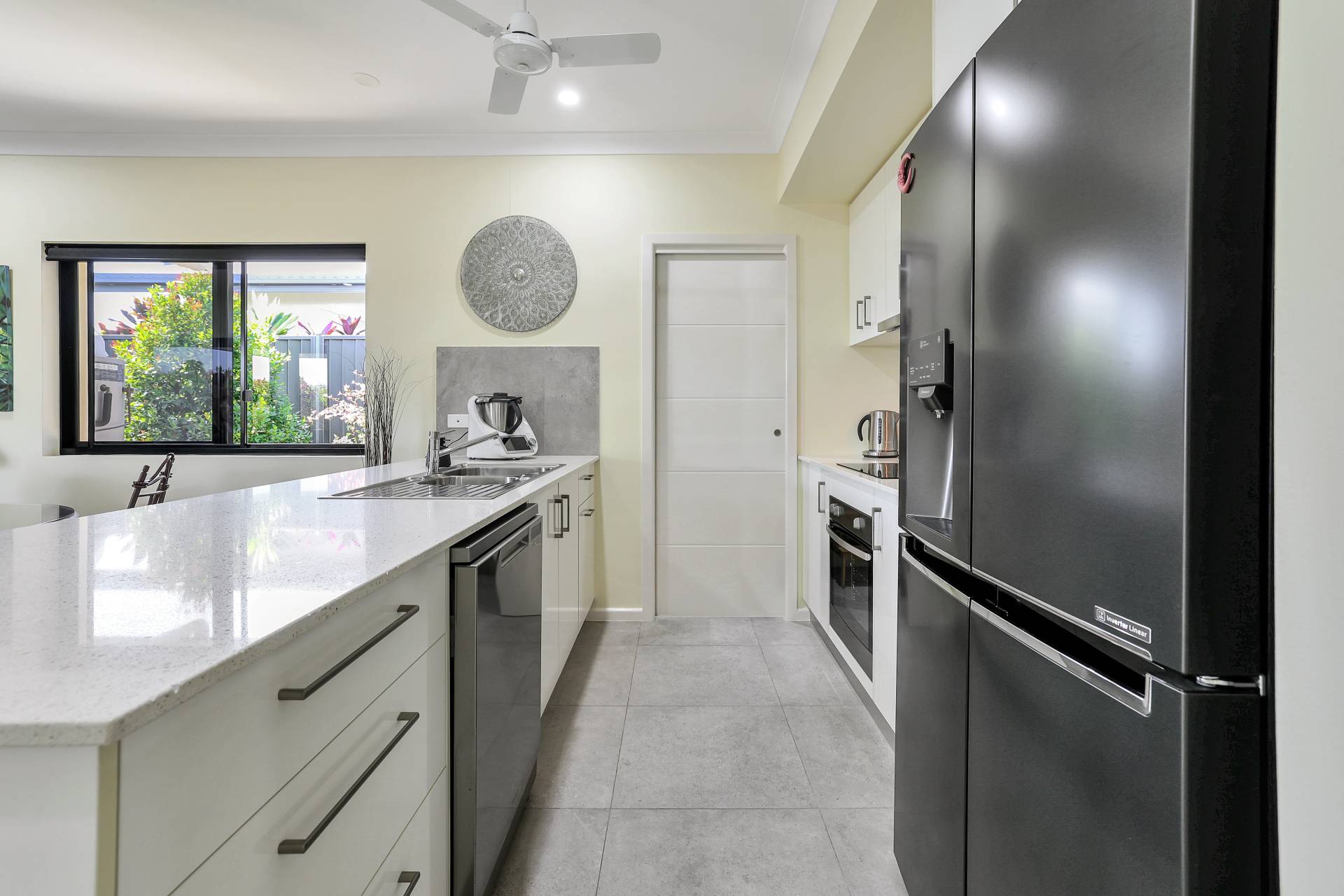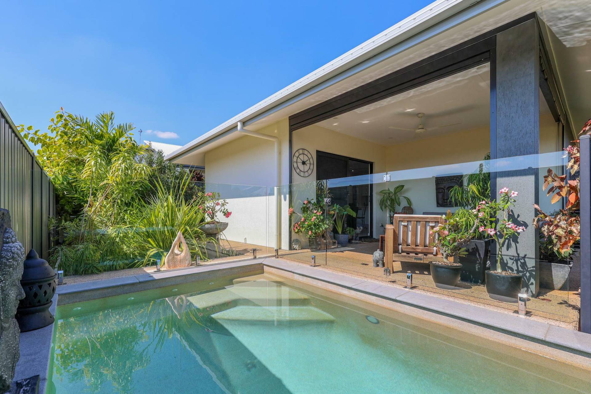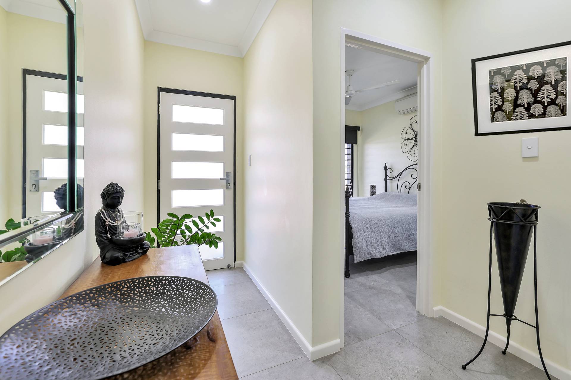A formal front entry leads through to the hallway that takes you to the living areas at the far end of the home that open via sliding doors onto the verandah with a glass framed swimming pool and lush tropical gardens.