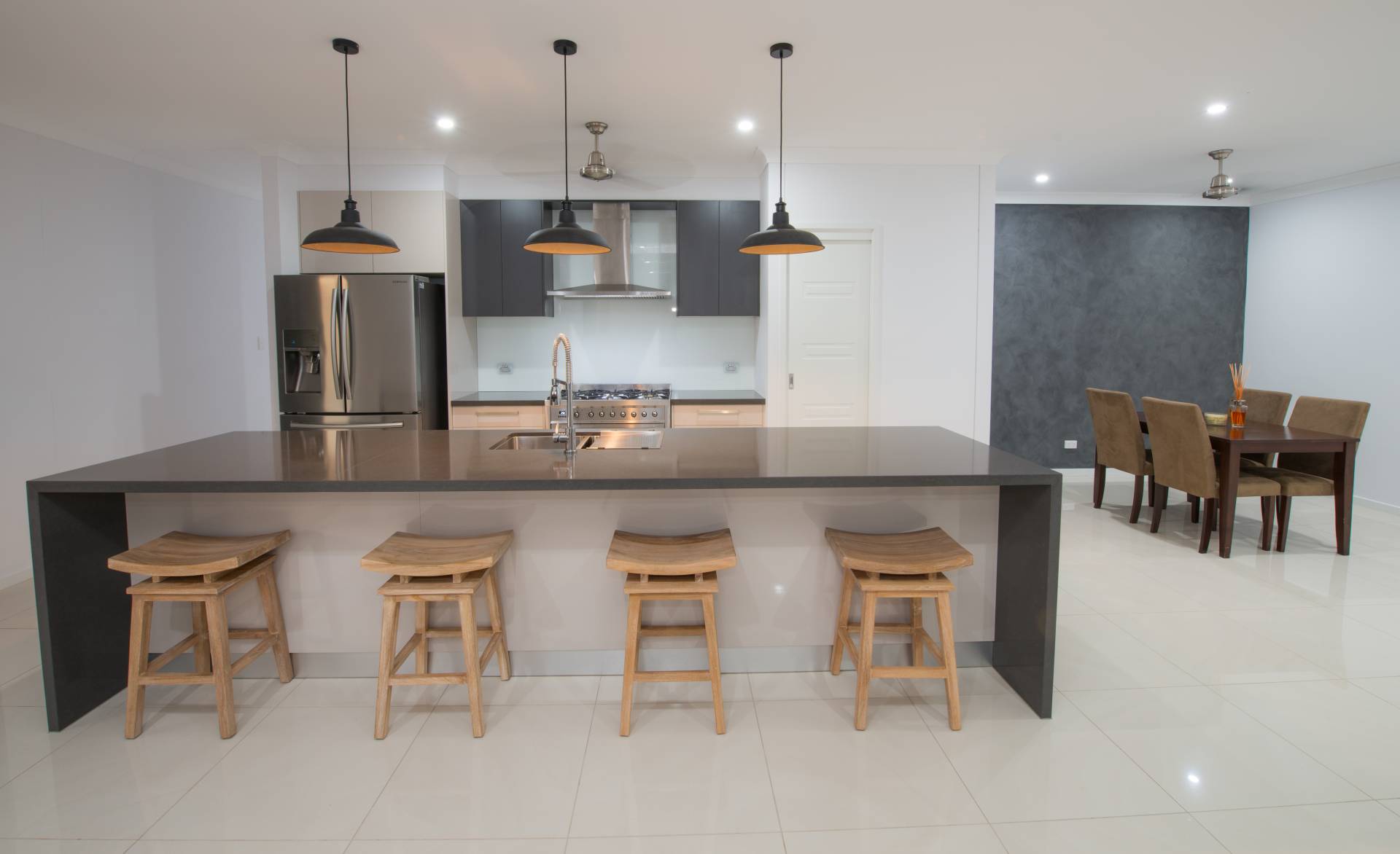 •A central open planned kitchen with a butler’s pantry, stone tops and a large 900 oven with gas cooking on top.