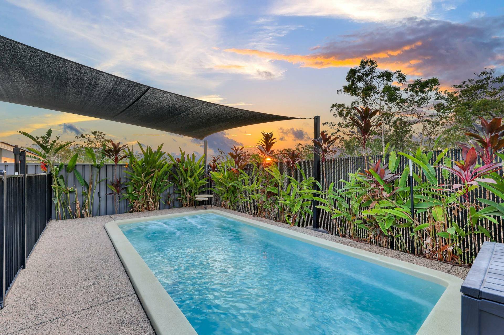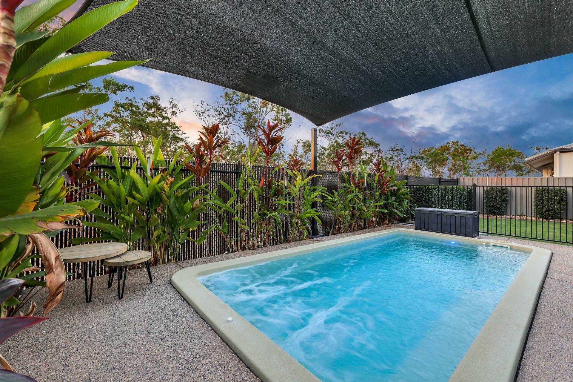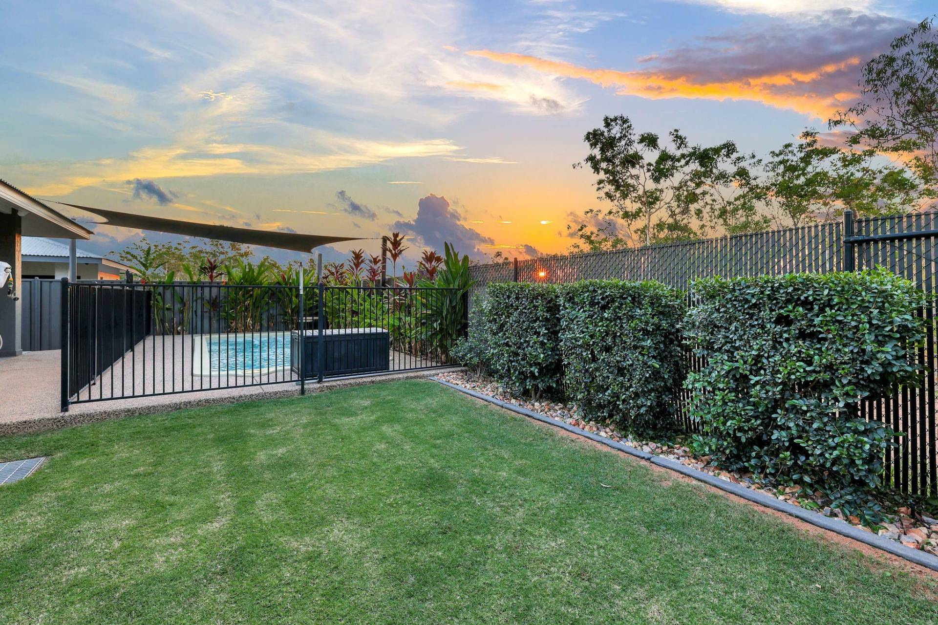 -Outside is a gorgeous in ground swimming pool surrounded with tropical gardens and rolling green lawns with an easy care design to please.