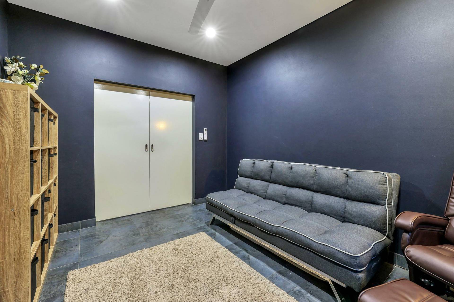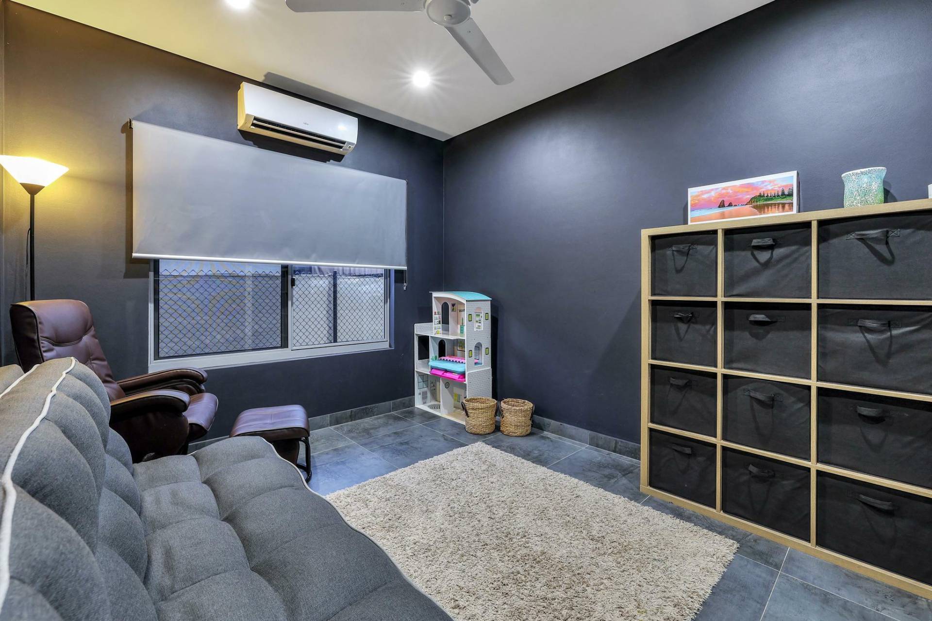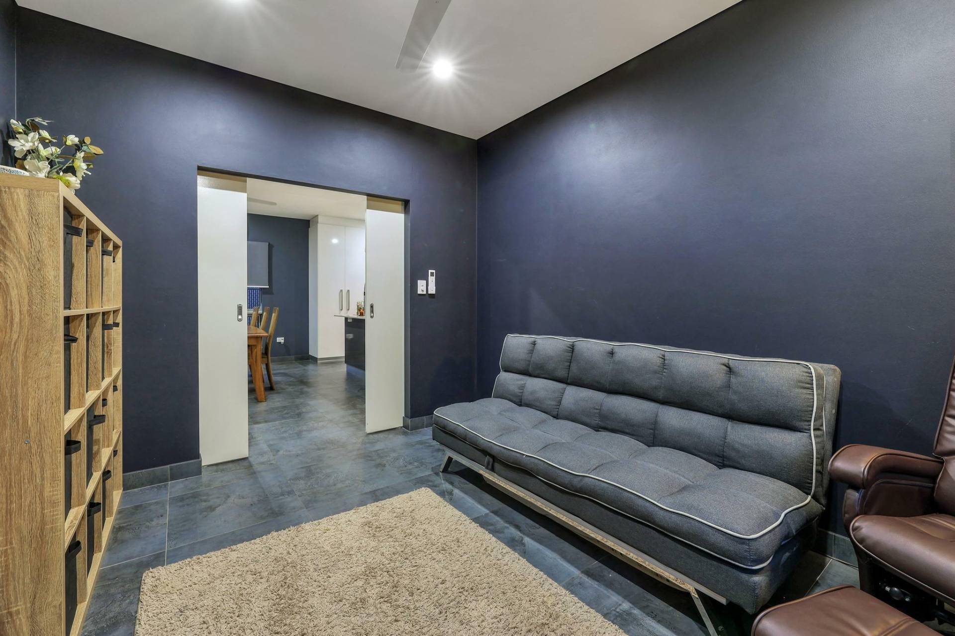Open plan living, dining and kitchen areas create the hub of the home for the family to enjoy each other. The kitchen has stone counters along with breakfast bar seating, pendant lighting and overhead storage space. Double doors lead through to the media room painted in moody tones perfect for the family movie nights or as a secluded lounge room (optional 4th bedroom).