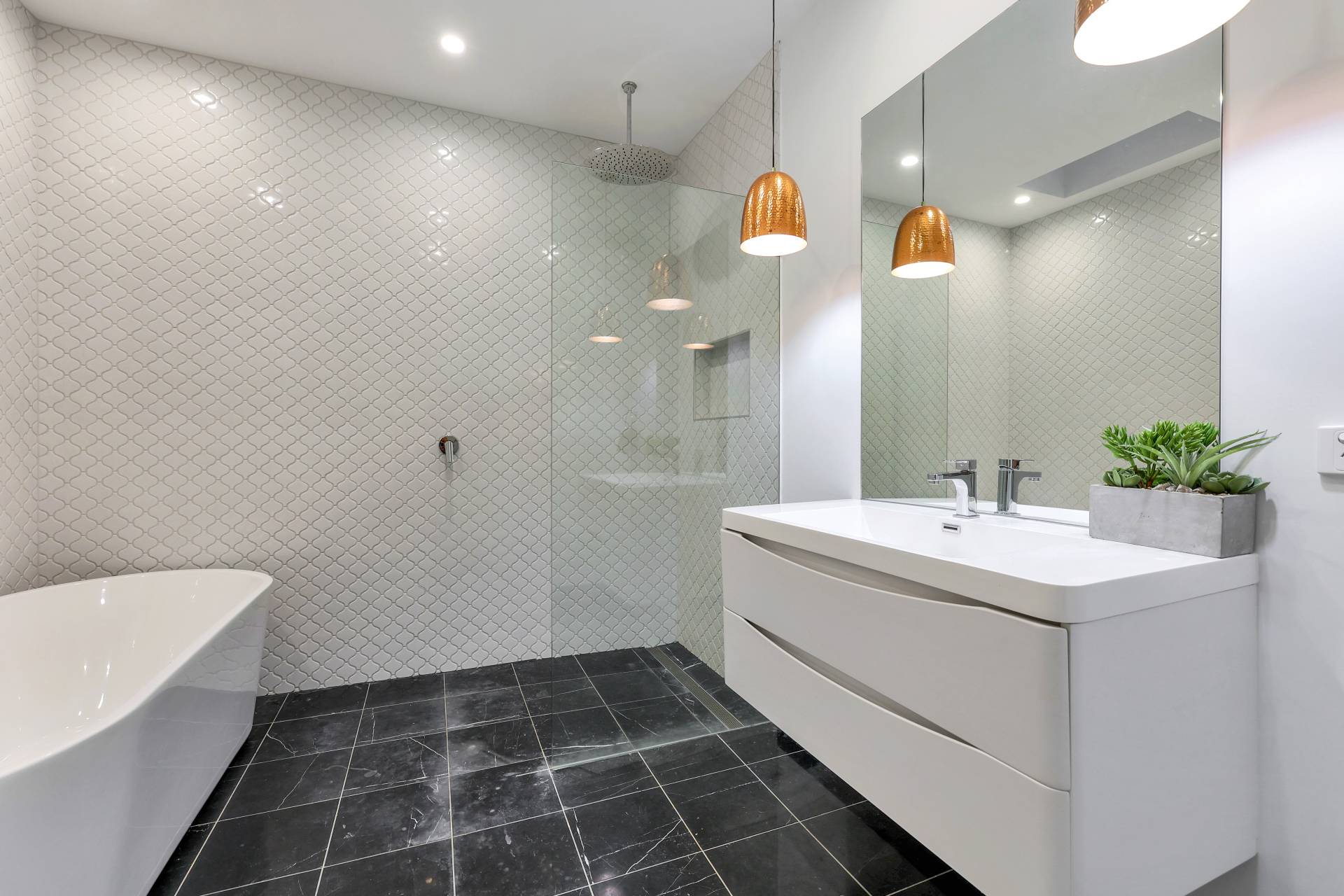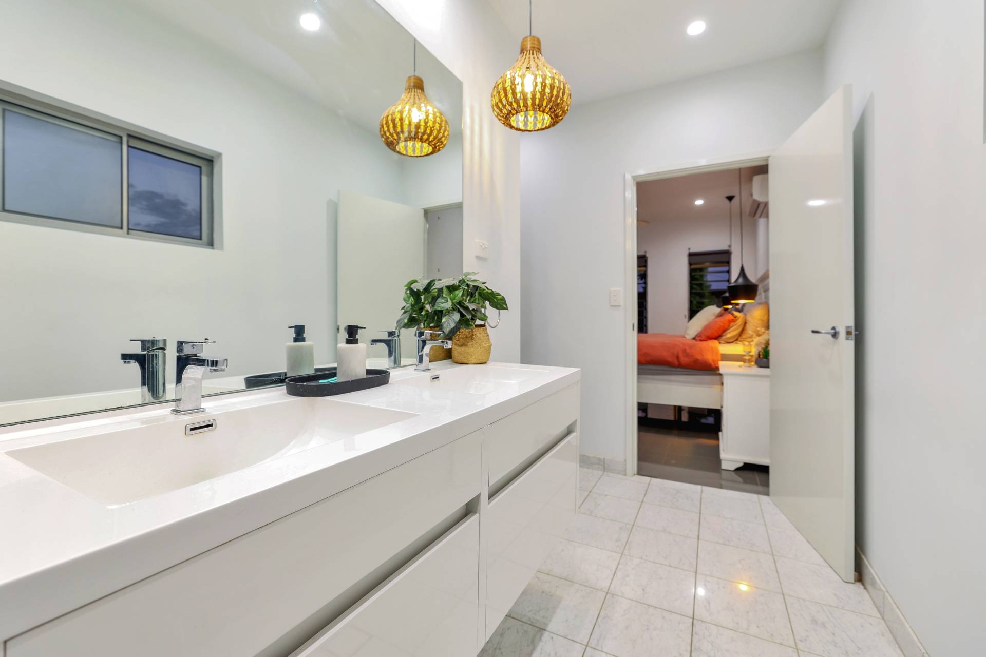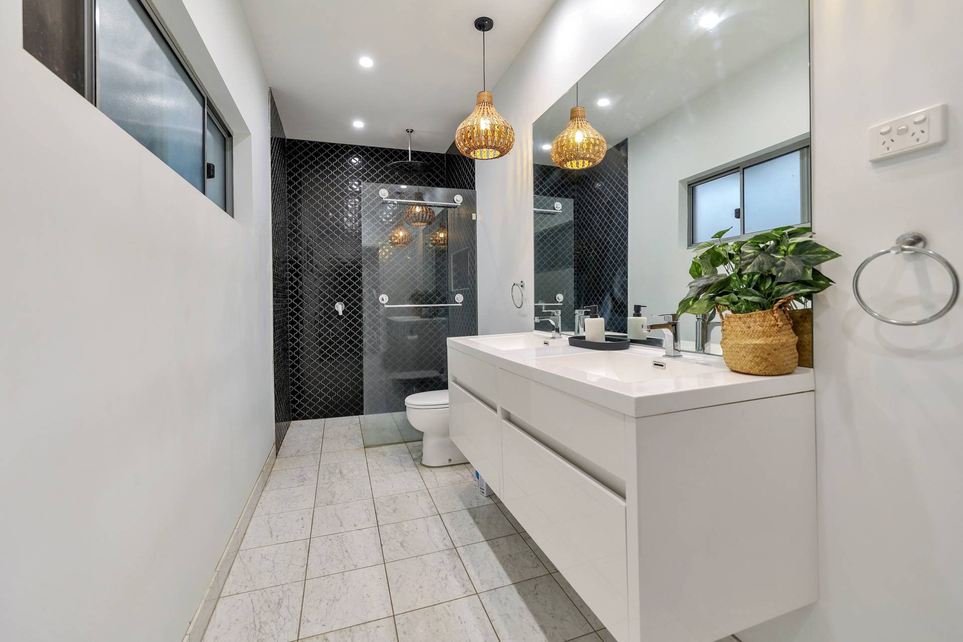 The home has a front facing master bedroom suite with twin feature pendant lighting strung low either side of the bed. A lux ensuite bathroom boasts dual basin and a gorgeous shower with feature tiles along with a walk in robe. 3 more bedroom all have tiled flooring, A/C, louvered windows and a built in robe. The master bathroom is sleek and gorgeous with a free standing bath tub along with pendant lighting as well.