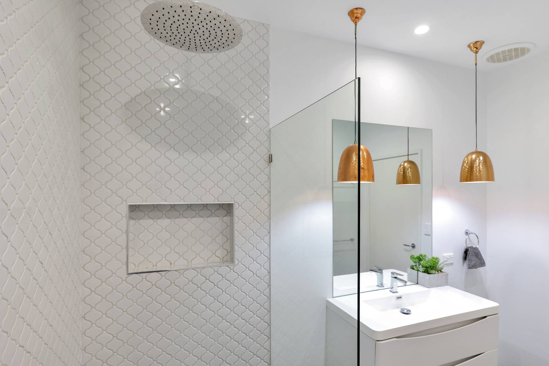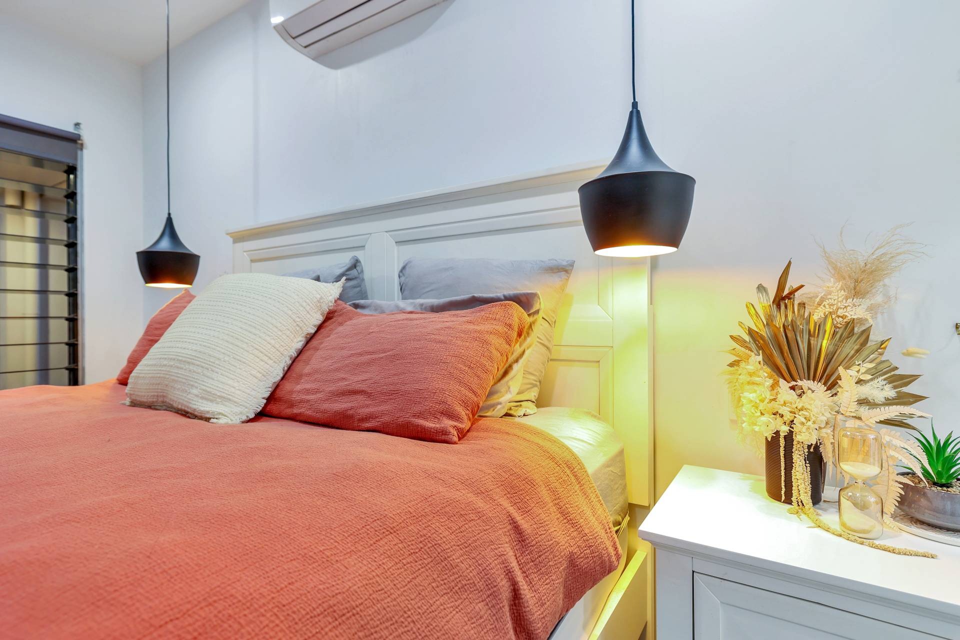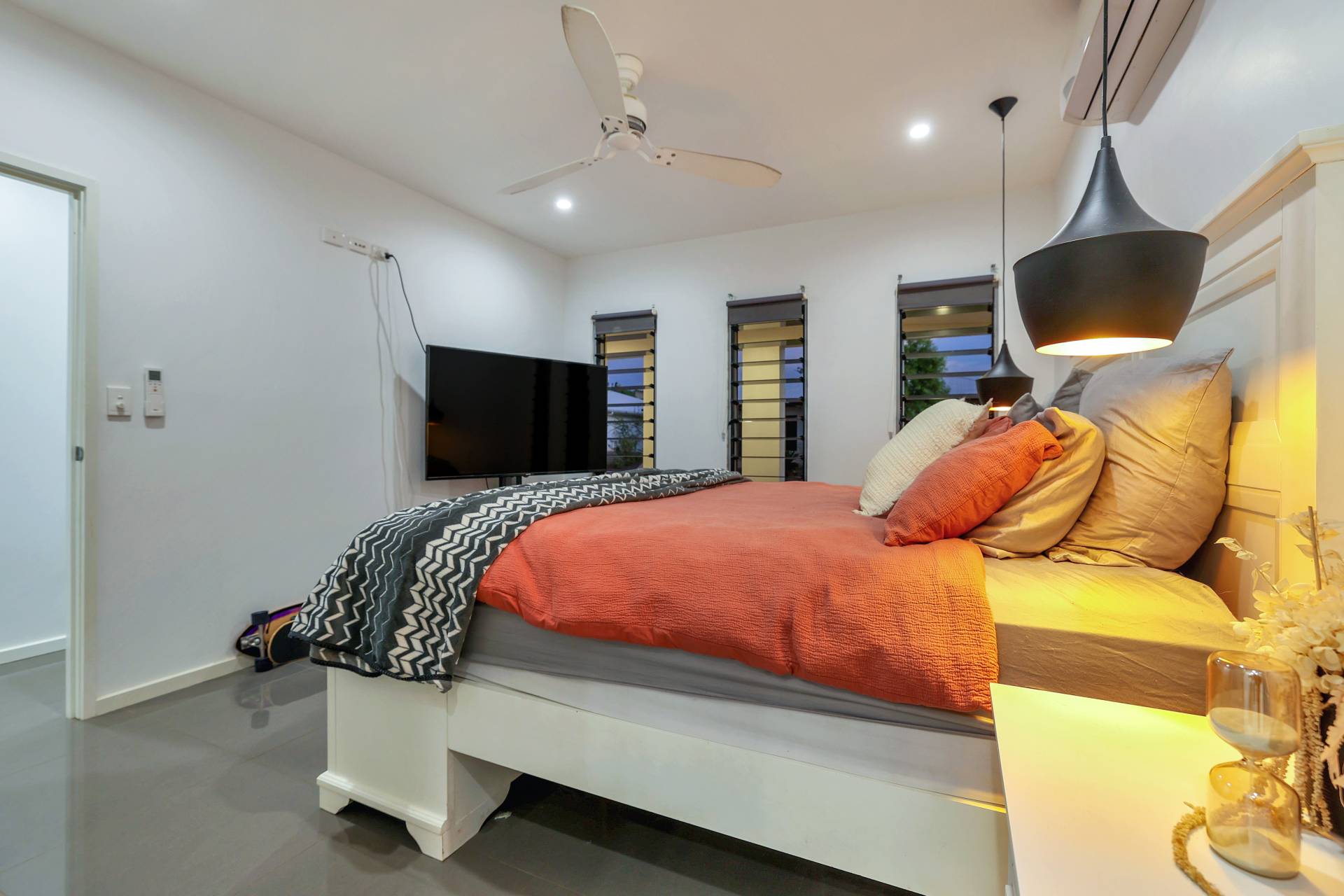 The home has a front facing master bedroom suite with twin feature pendant lighting strung low either side of the bed. A lux ensuite bathroom boasts dual basin and a gorgeous shower with feature tiles along with a walk in robe. 3 more bedroom all have tiled flooring, A/C, louvered windows and a built in robe. The master bathroom is sleek and gorgeous with a free standing bath tub along with pendant lighting as well.