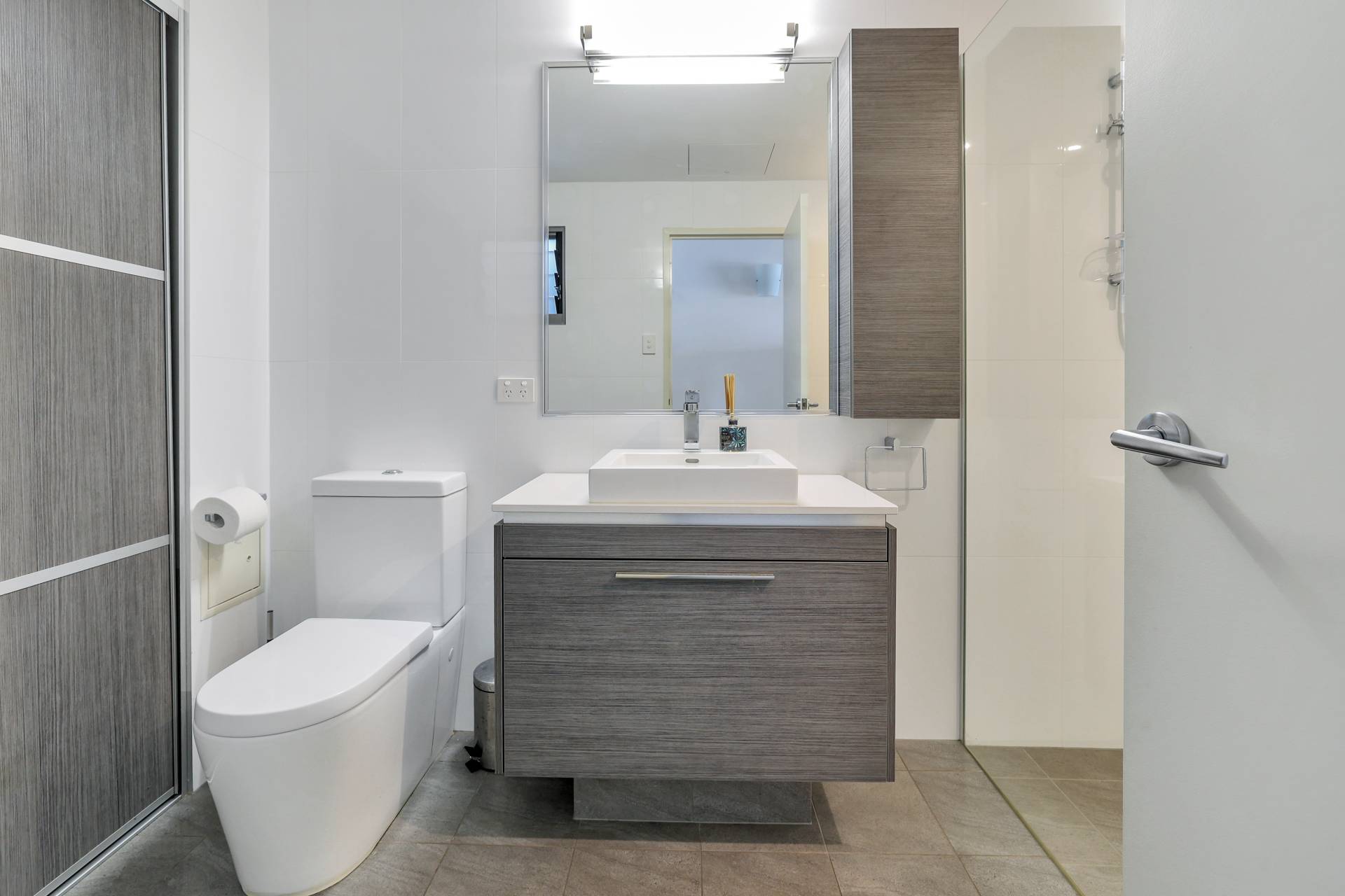 Both bedrooms are positioned separately allowing them totally privacy from each other. Both have carpeted flooring and A/C while the master is enhanced with a walk in robe and ensuite bathroom. The main bathroom cleverly hosts the laundry facilities behind sliding doors for a seamless and unobtrusive finish plus there is a bank of built in storage in the dining area as well – bonus.