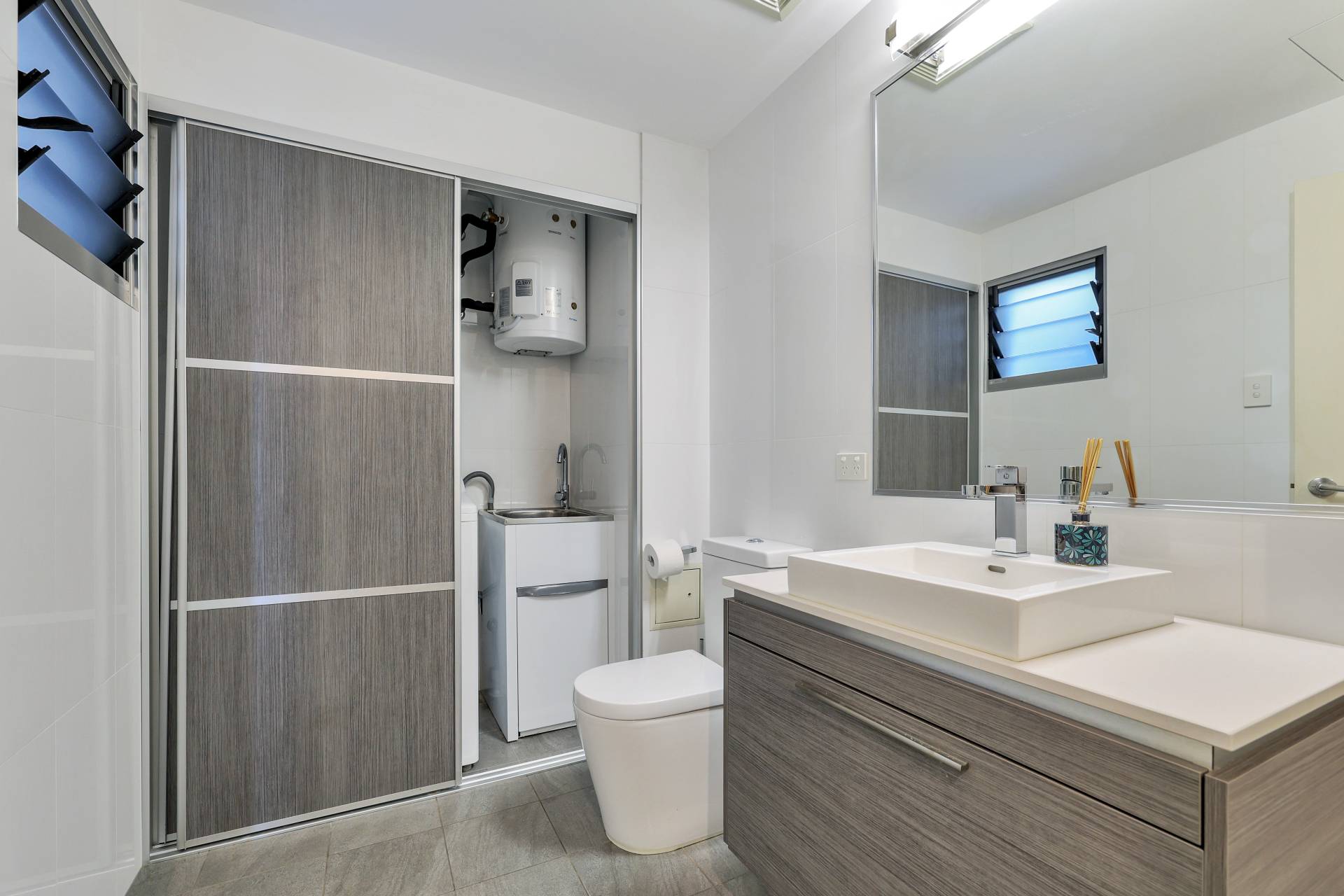 -Main bathroom cleverly hosts the laundry amenities in a seamless design