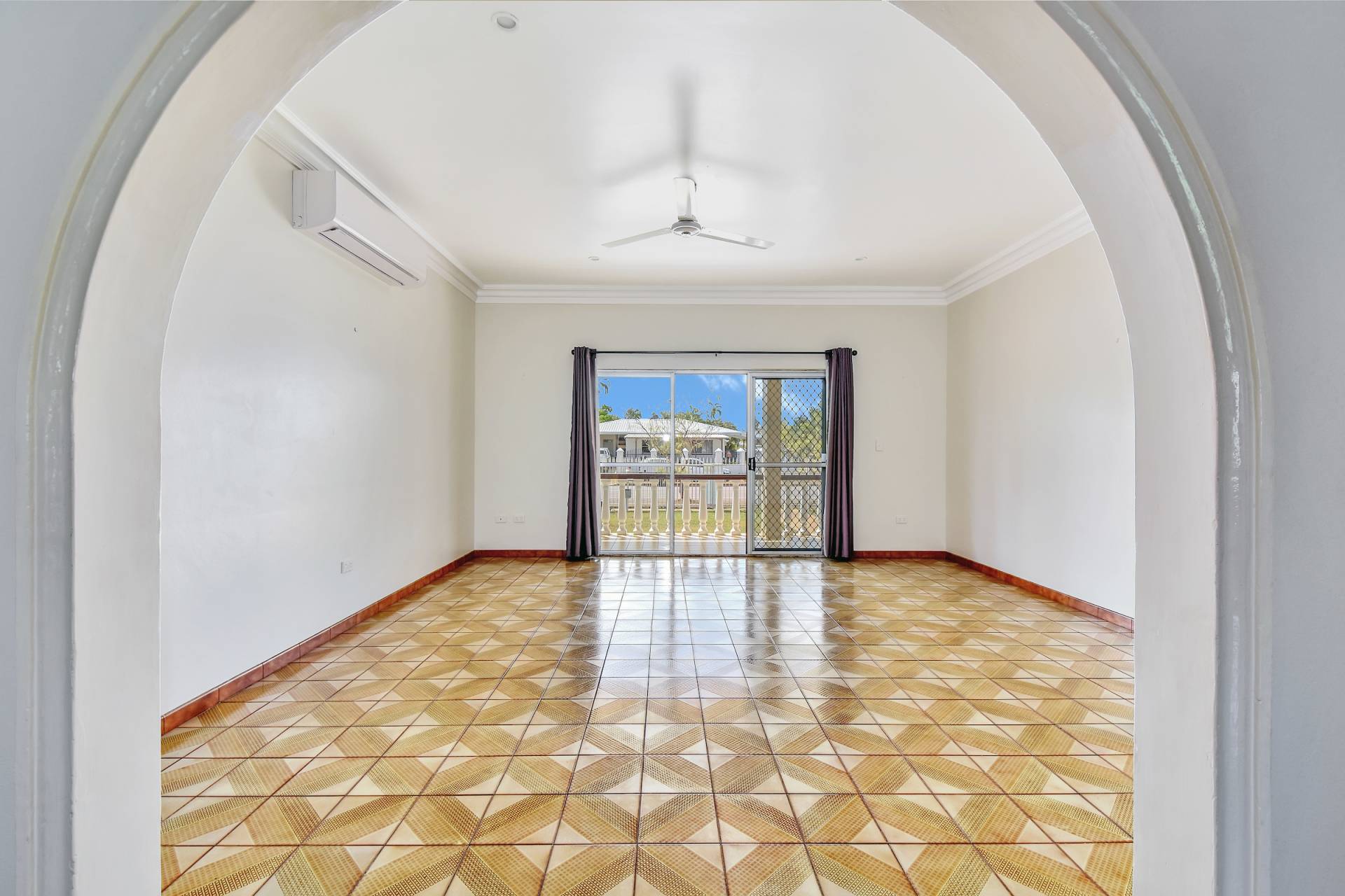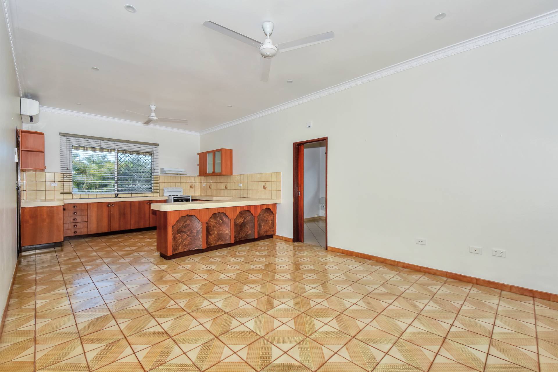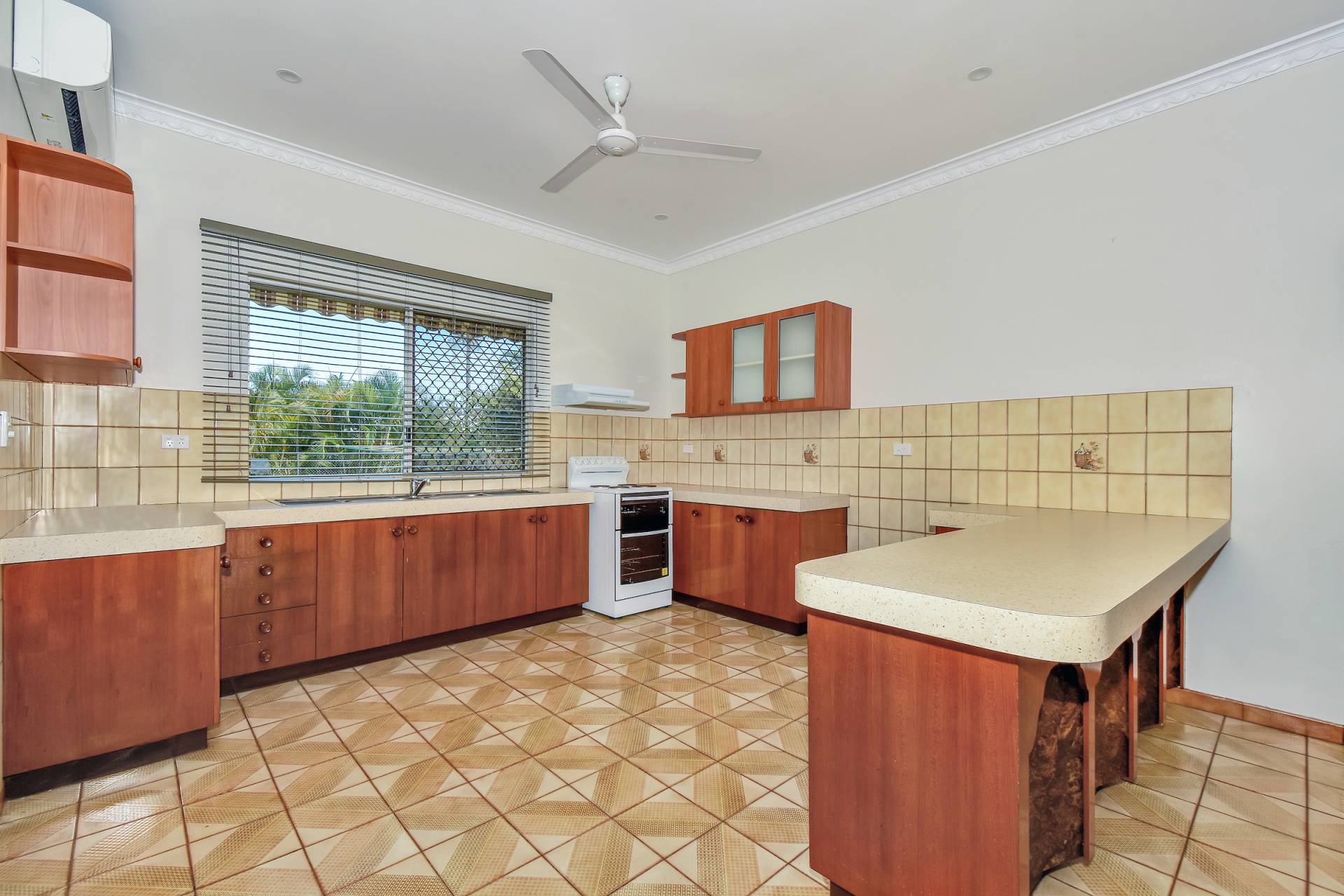 Inside the home is an expansive living room with retro tiled flooring that plays nicely off the fresh white walls and modern finishes including an A/C. An archway leads through to the dining room which is adjacent to the kitchen, this practical design makes this home feel enormous. The kitchen has wrap around laminate counters along with a breakfast bar, overhead storage and tiled splashback with loads of timber cabinets for storage.