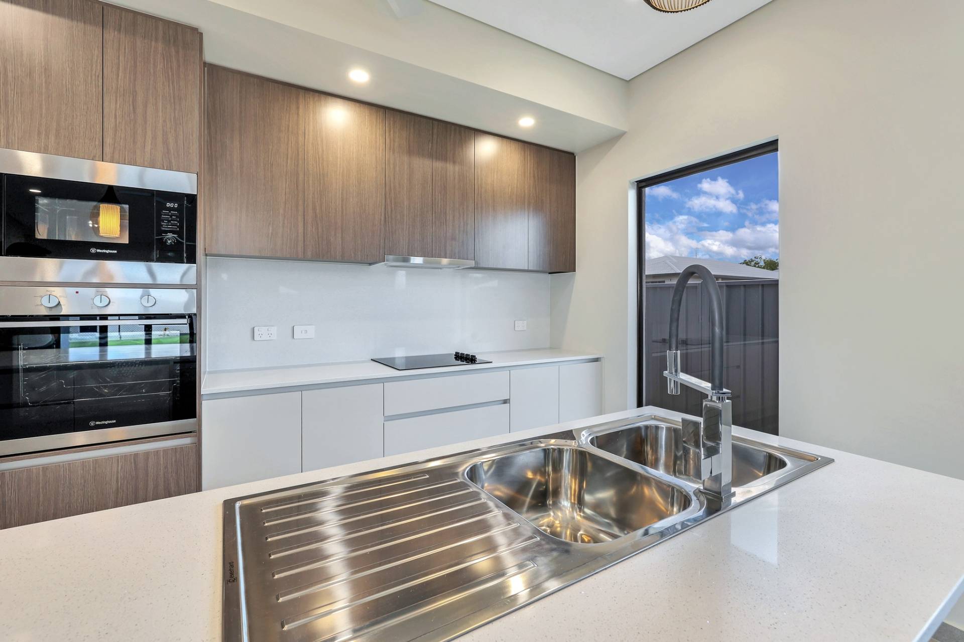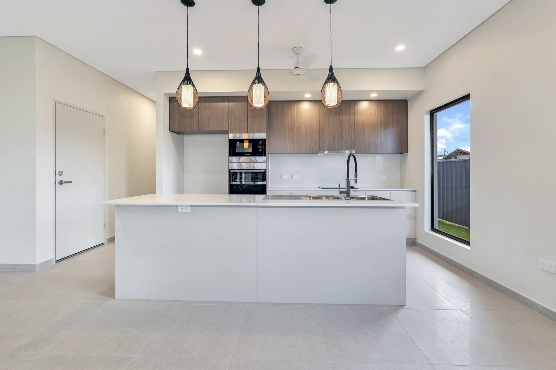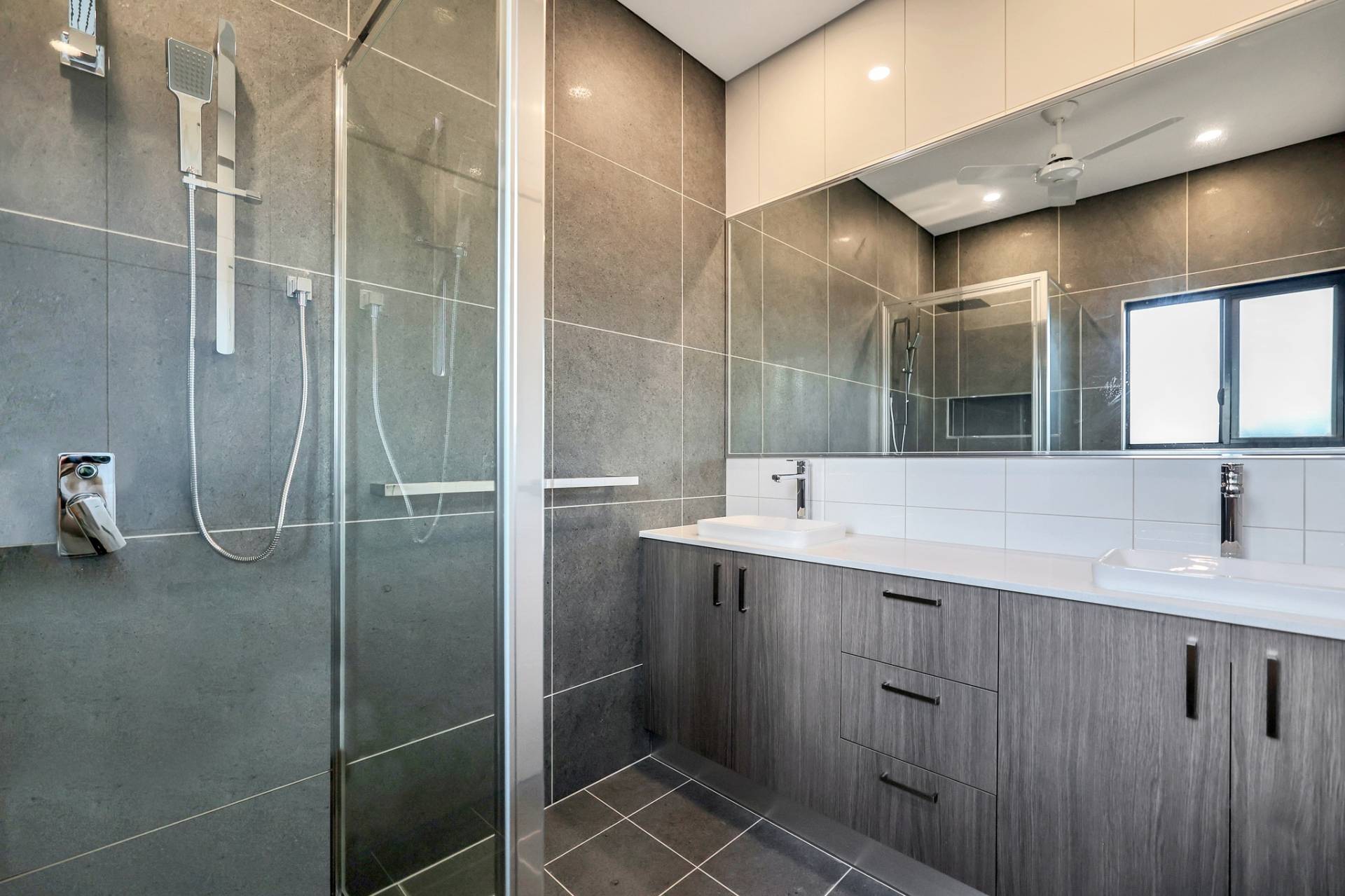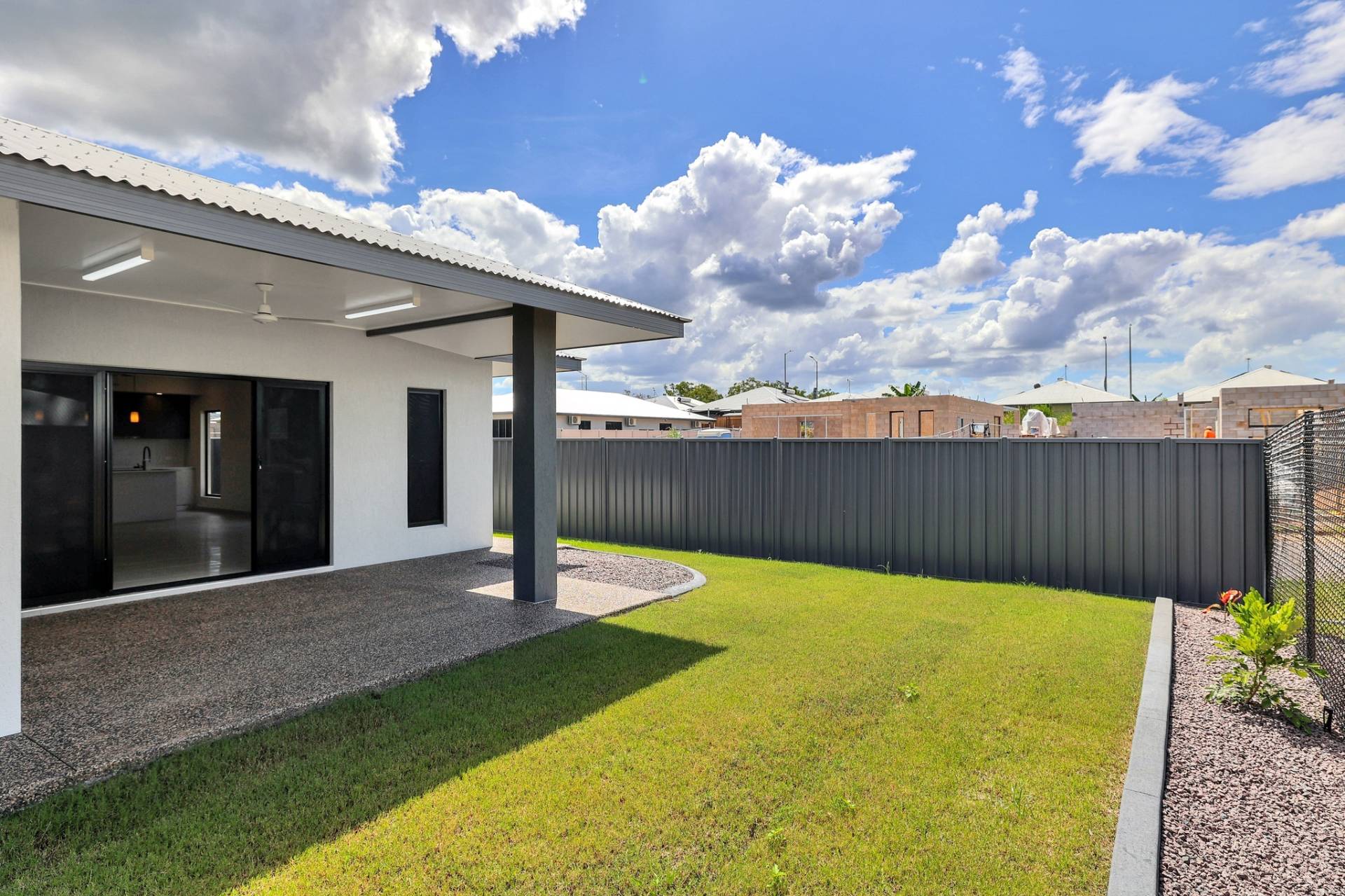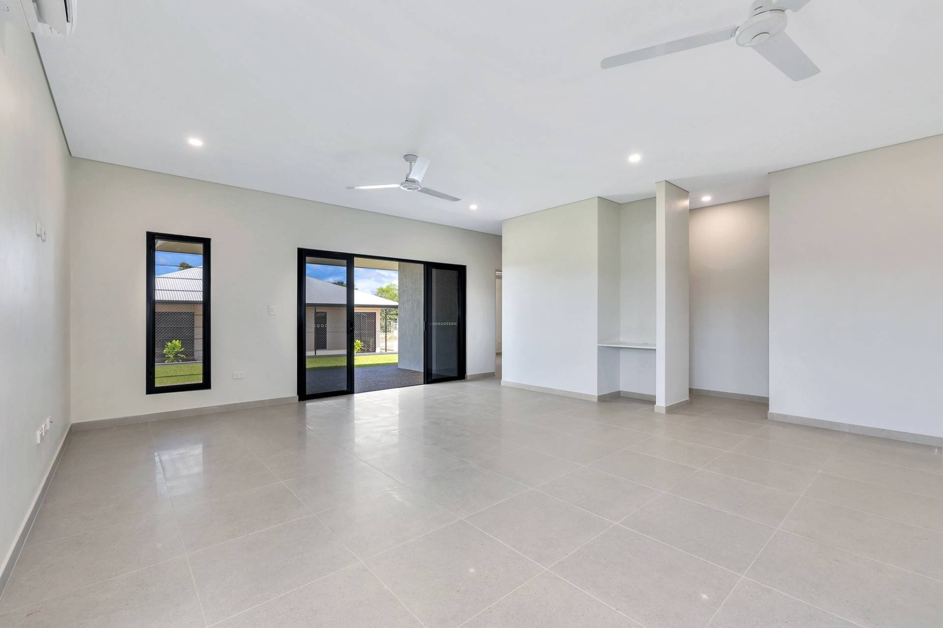 Open plan living and dining areas have tiled flooring underfoot and large sliding windows that let in the natural light and soft breezes. At the far end are a double bank of sliding doors that open onto the verandah which overlooks the newly installed gardens with irrigated grass and tropical plants finding their feet.
