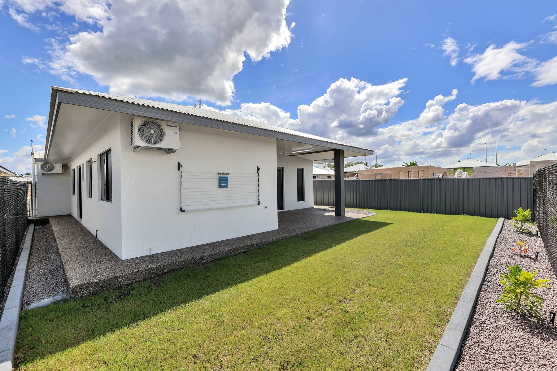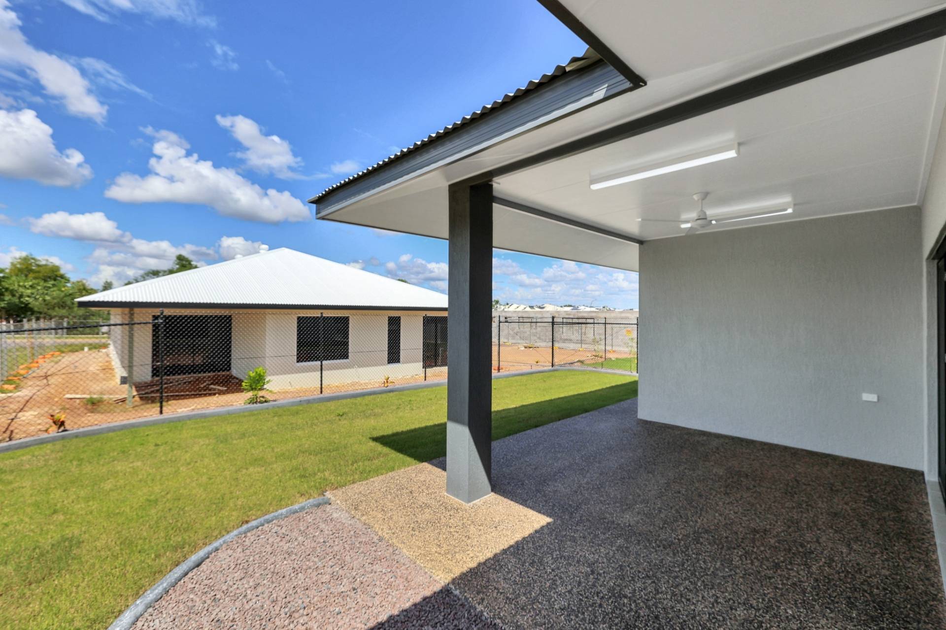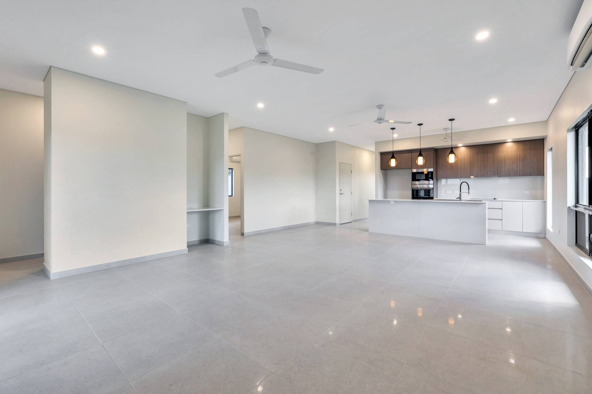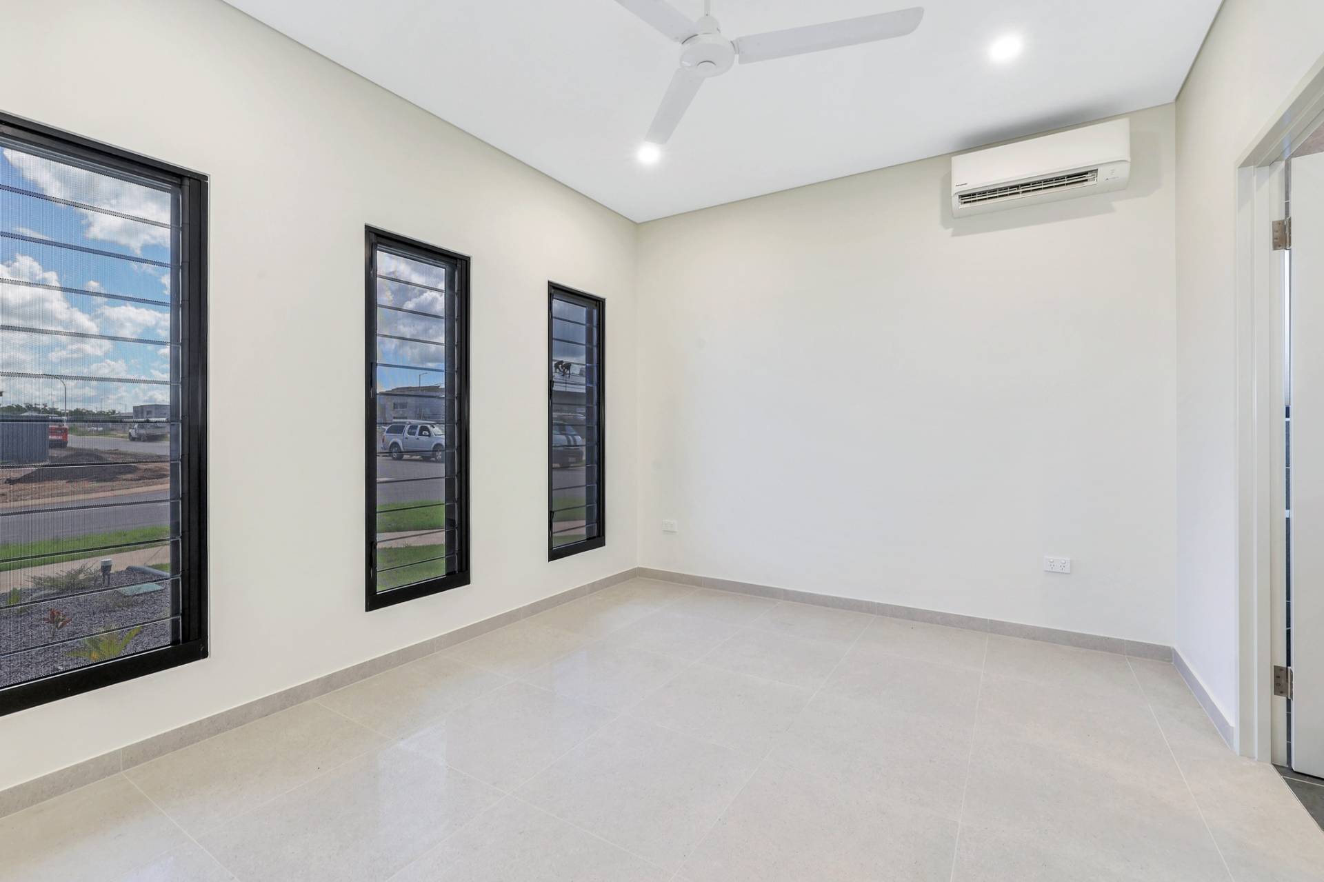 Open plan living and dining areas have tiled flooring underfoot and large sliding windows that let in the natural light and soft breezes. At the far end are a double bank of sliding doors that open onto the verandah which overlooks the newly installed gardens with irrigated grass and tropical plants finding their feet.