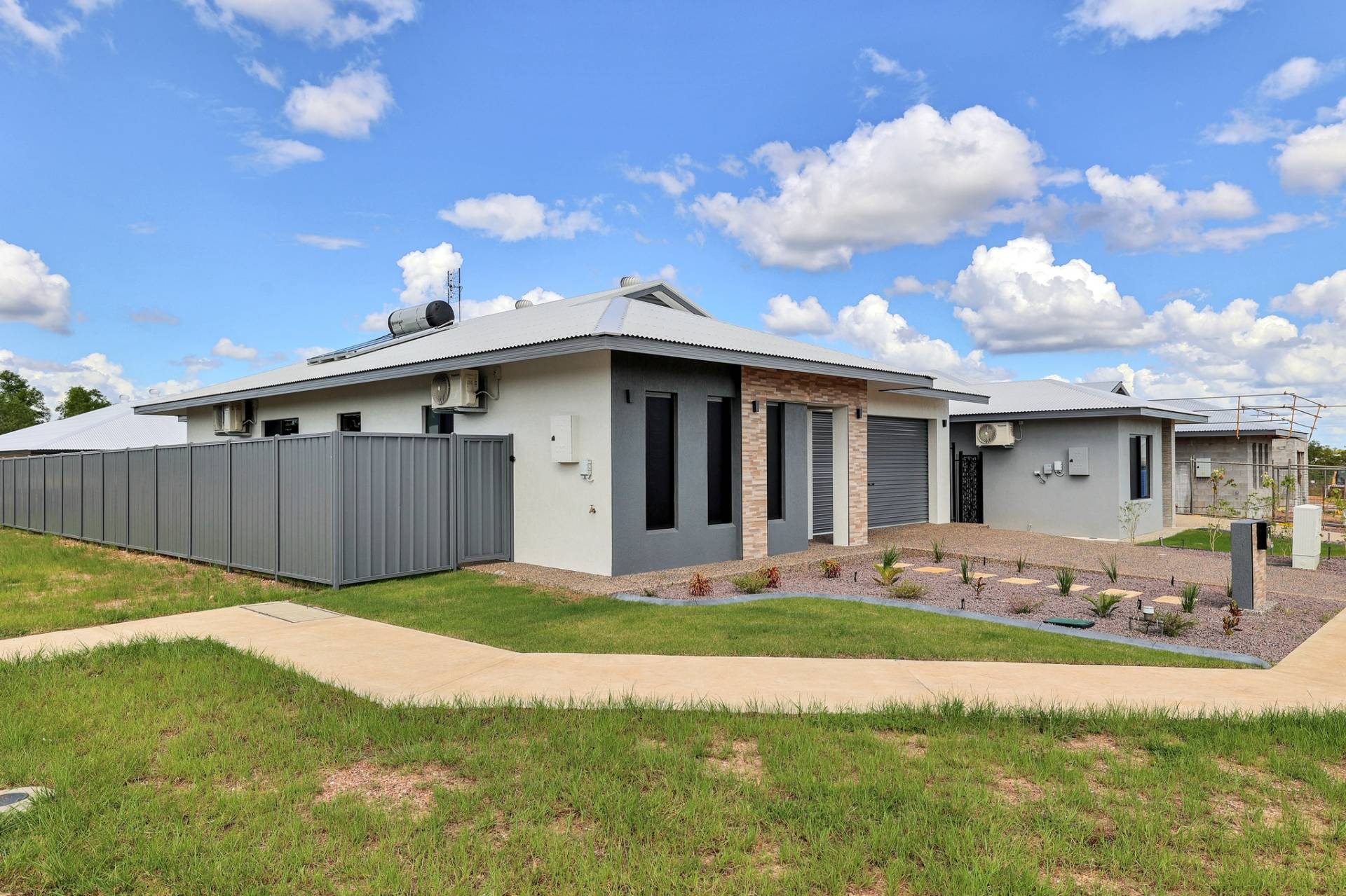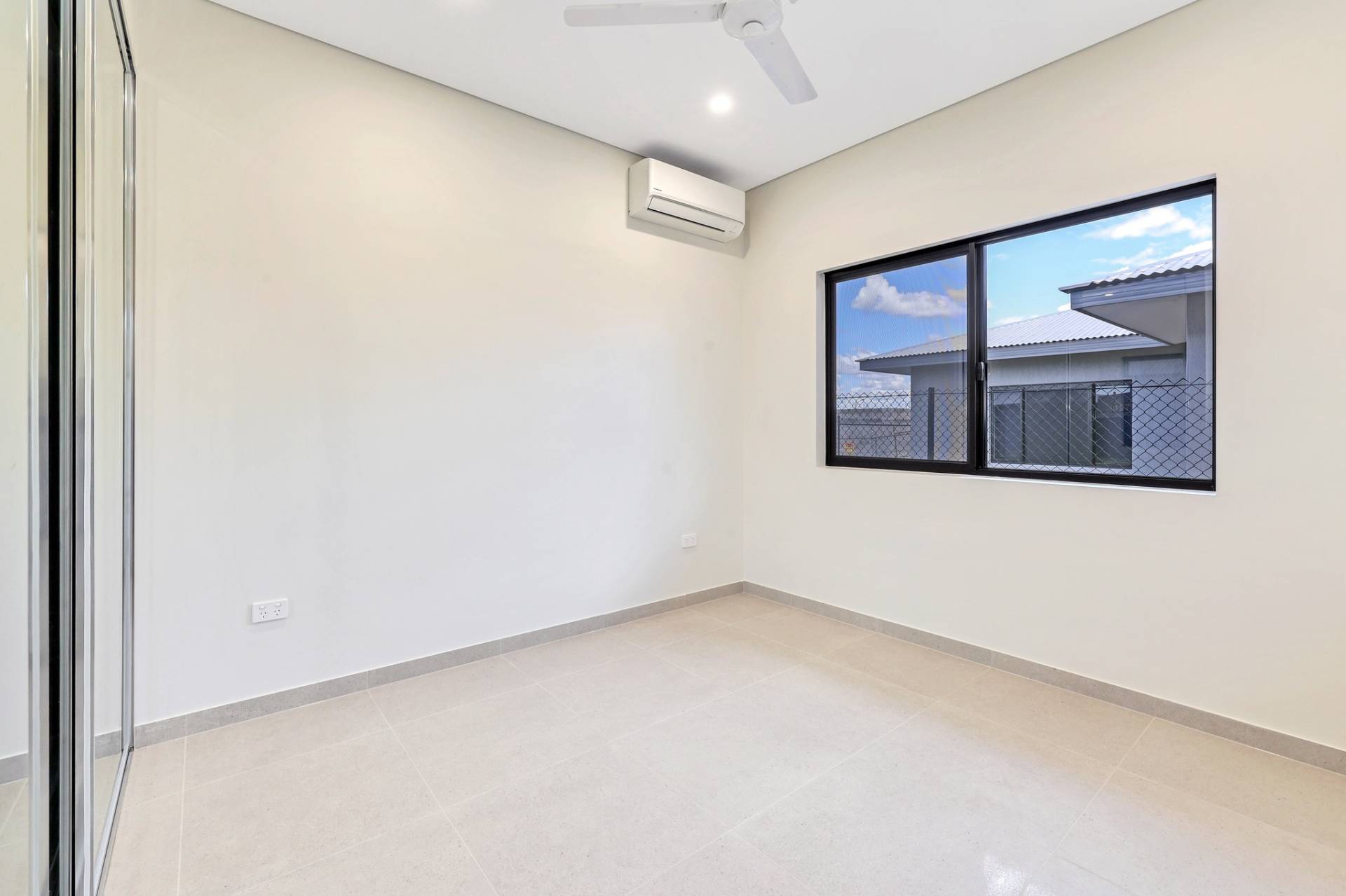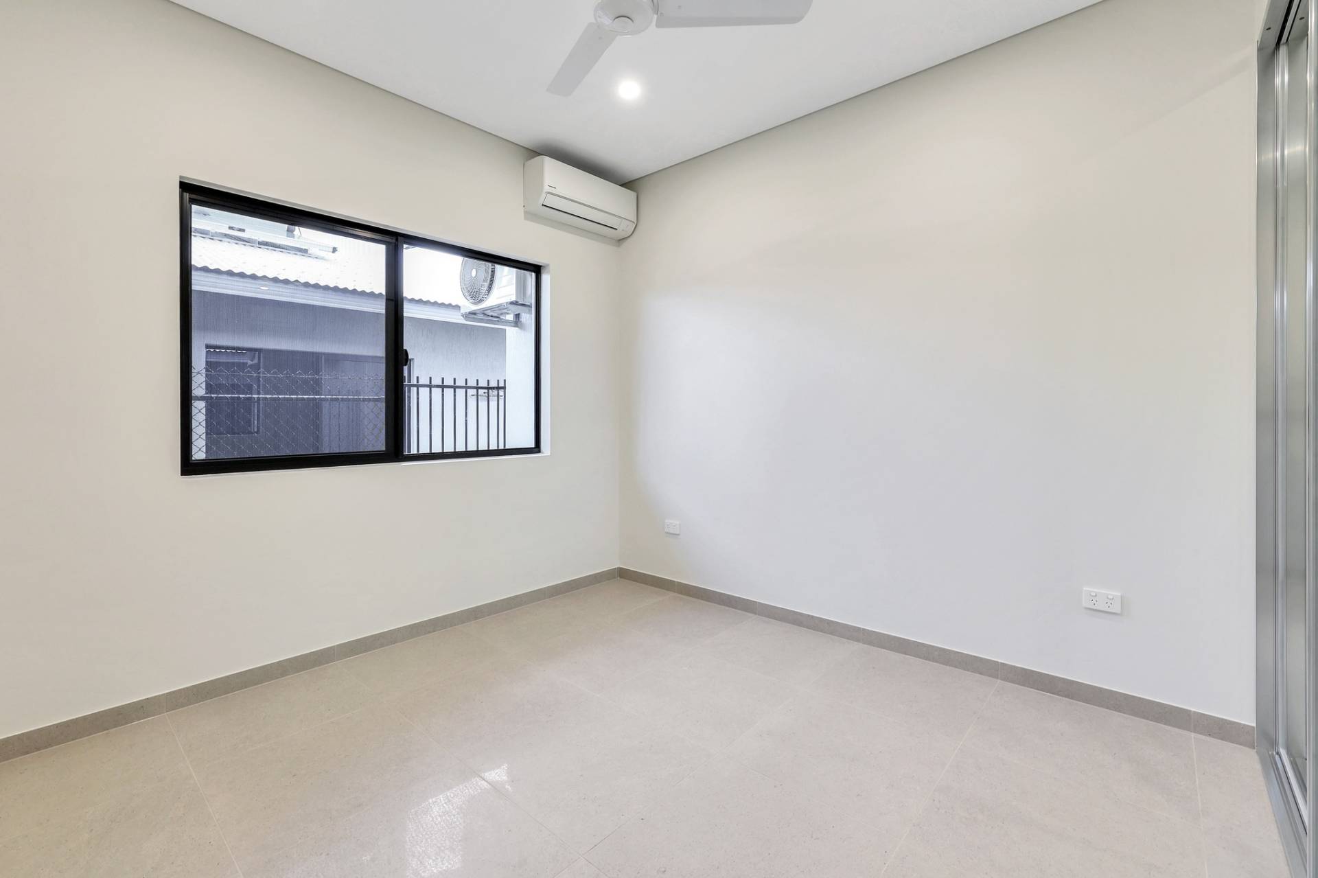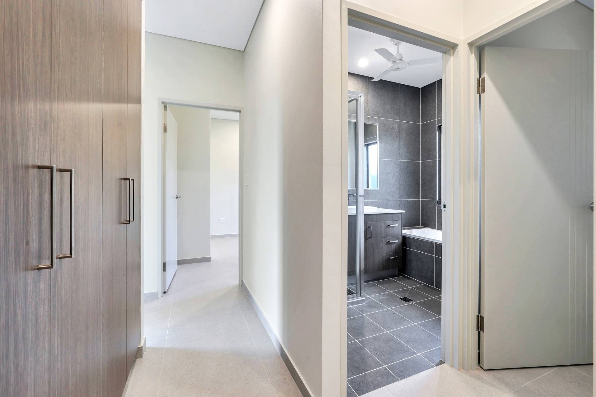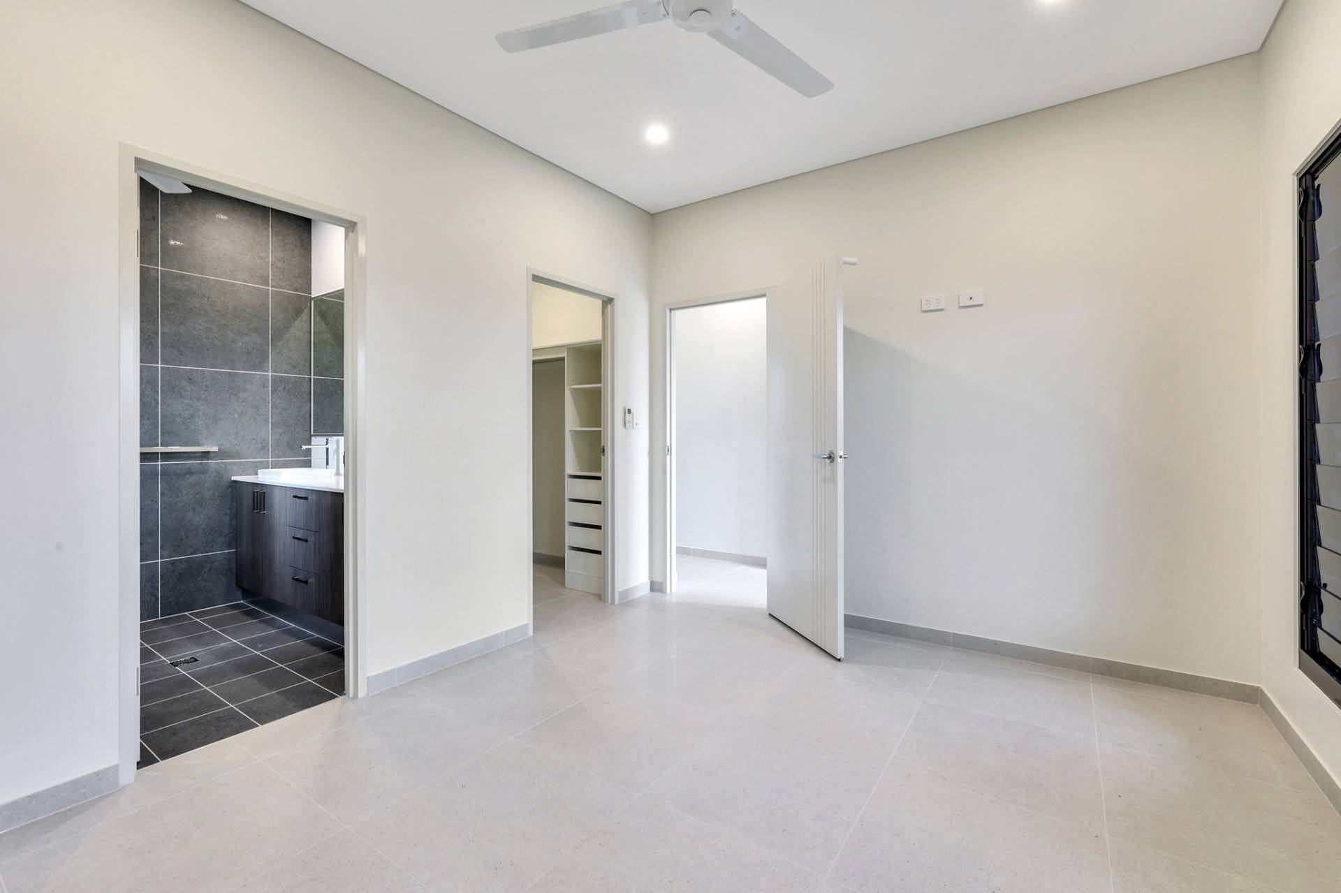 Open plan living and dining areas have tiled flooring underfoot and large sliding windows that let in the natural light and soft breezes. At the far end are a double bank of sliding doors that open onto the verandah which overlooks the newly installed gardens with irrigated grass and tropical plants finding their feet.