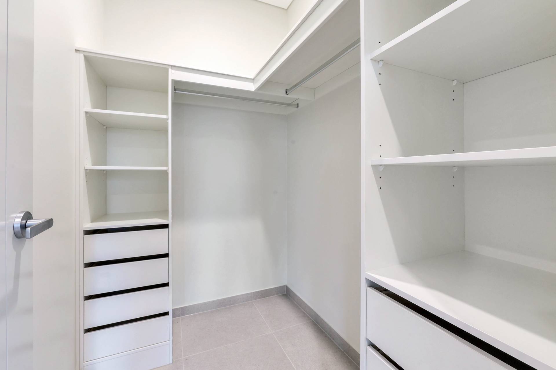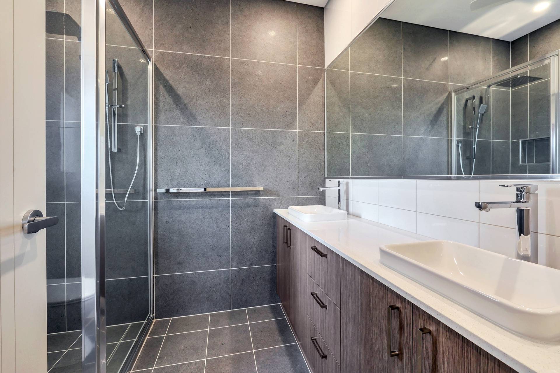 The kitchen is a stunner with streamlined design, contrasting cabinetry and banks of built in storage space. There are feature pendant lighting strung low over the stone topped island bench for the added WOW factor.