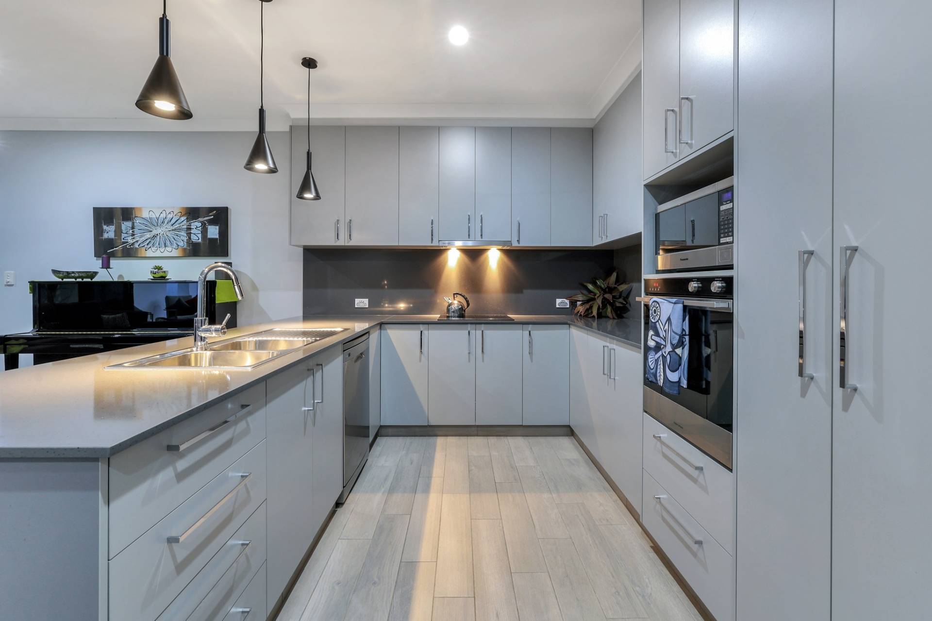 Free flowing living and dining areas have tiled flooring underfoot and split A/C along with feature walls and a wall of built in storage space great for family board games or additional linens. The kitchen offers wrap around counters with banks of built in storage space plus breakfast bar seating under low strung pendant lighting. There are endless bays of overhead storage and there is an easy flow through to the dining room adjacent.