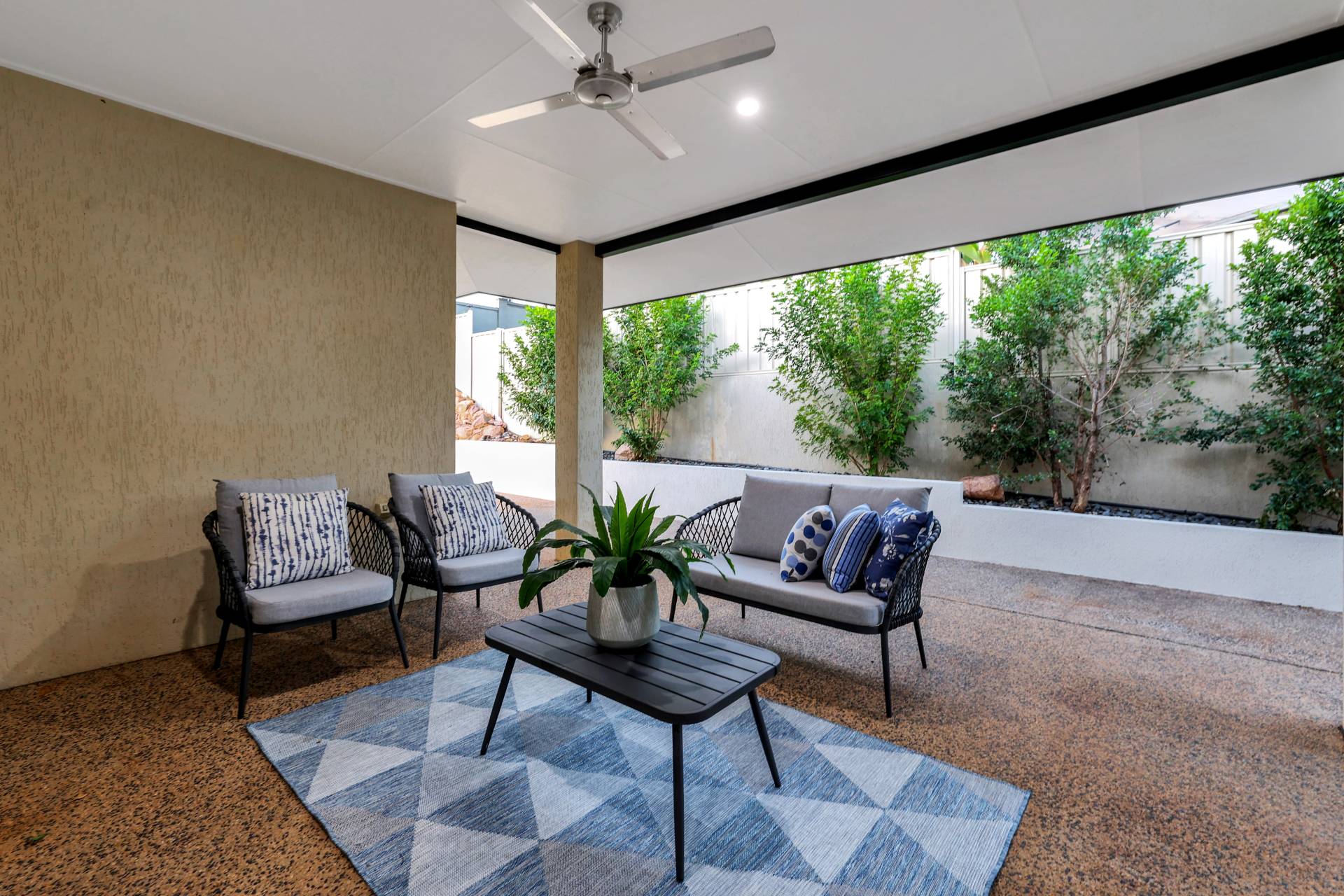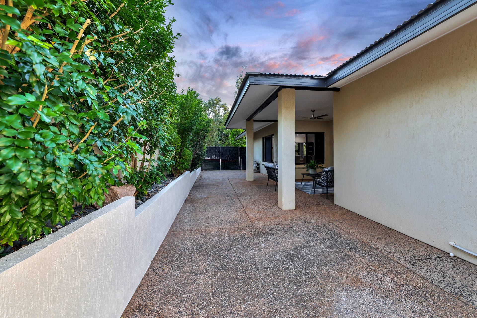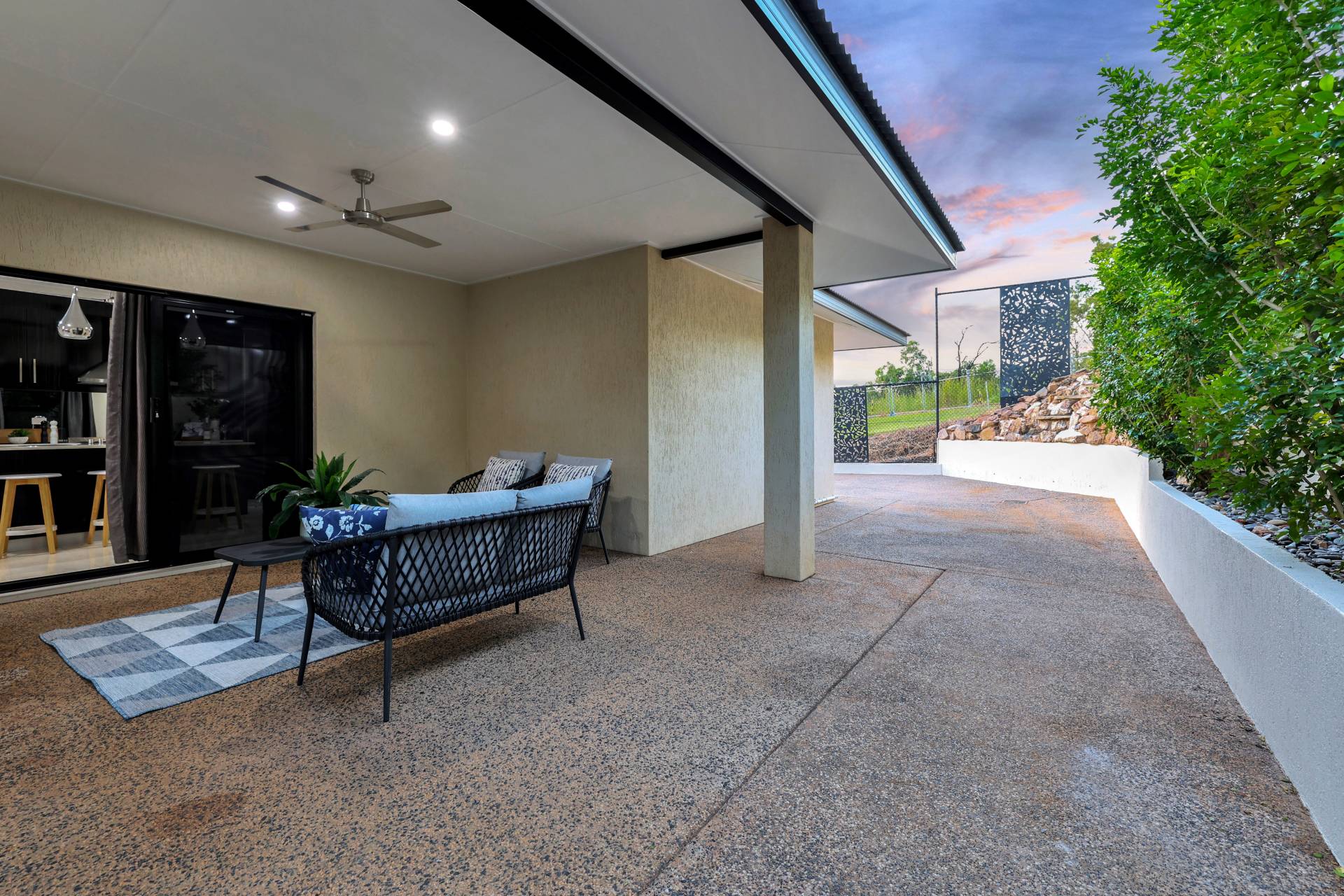 The kitchen offers an island bench with low strung pendant lighting over the stone topped breakfast bar. There is a pantry and plenty of built in storage in modern warm tones. From here there are sliding doors through to the verandah which is shaded and cool with ample space for effortless entertaining. Wrapping around to the back of the home, the concreted area offers space for the kids on bikes, storage, an outdoor kitchen or a spa to be put in – choose what works best for your lifestyle. The home backs onto a nature strip so there are currently no neighbours and a huge grassy area to enjoy that you don’t have to mow!.