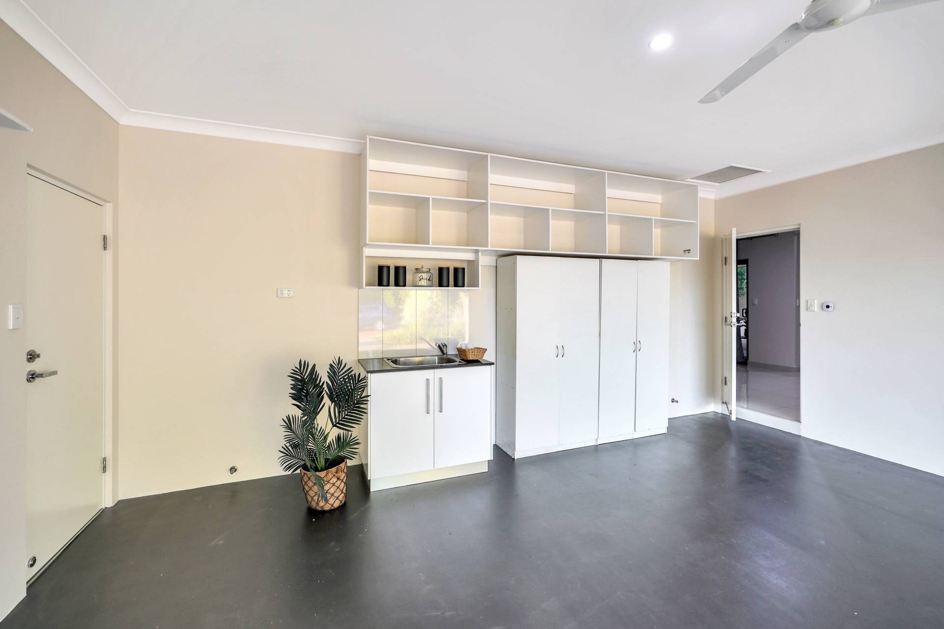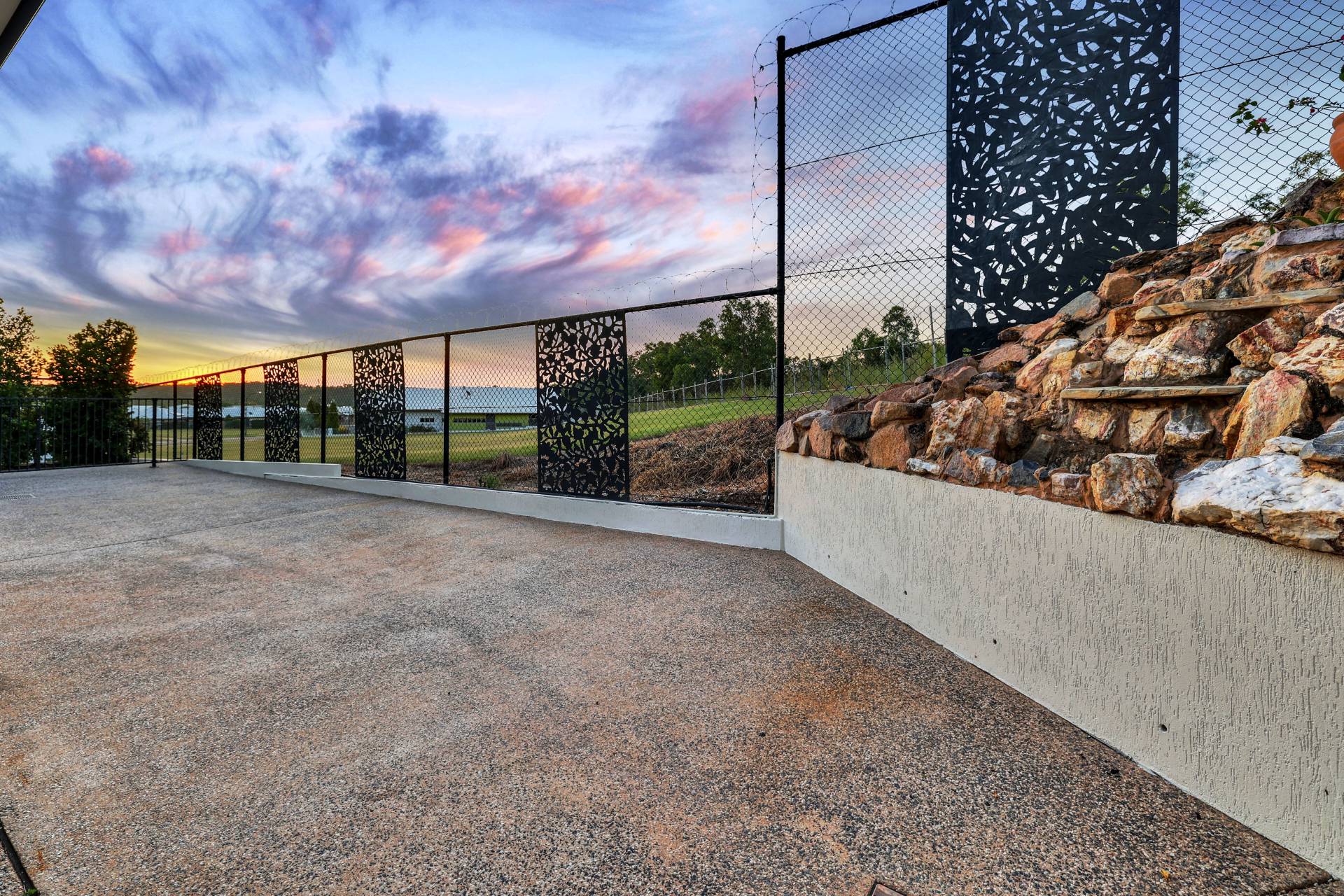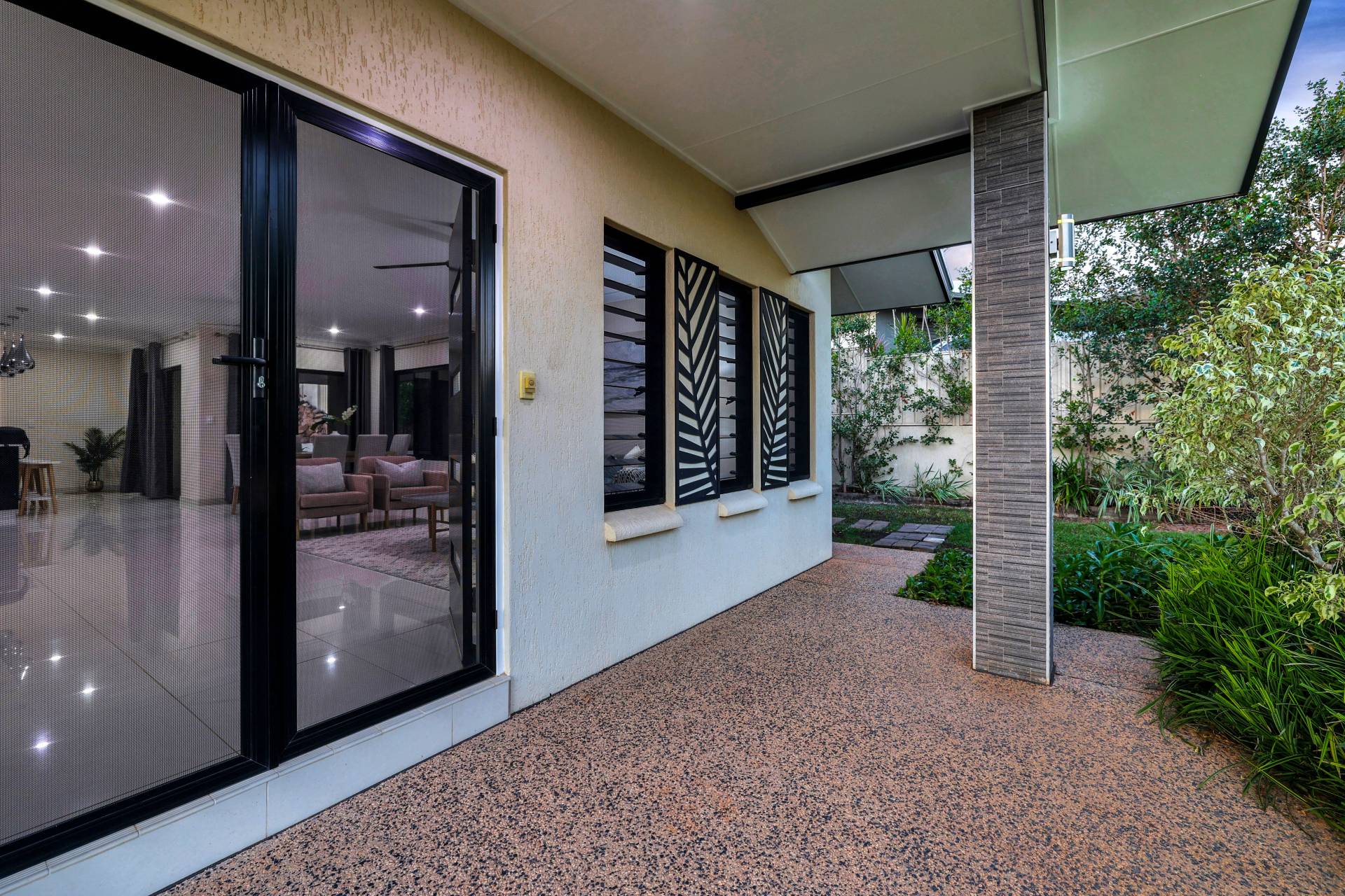 The kitchen offers an island bench with low strung pendant lighting over the stone topped breakfast bar. There is a pantry and plenty of built in storage in modern warm tones. From here there are sliding doors through to the verandah which is shaded and cool with ample space for effortless entertaining. Wrapping around to the back of the home, the concreted area offers space for the kids on bikes, storage, an outdoor kitchen or a spa to be put in – choose what works best for your lifestyle. The home backs onto a nature strip so there are currently no neighbours and a huge grassy area to enjoy that you don’t have to mow!.