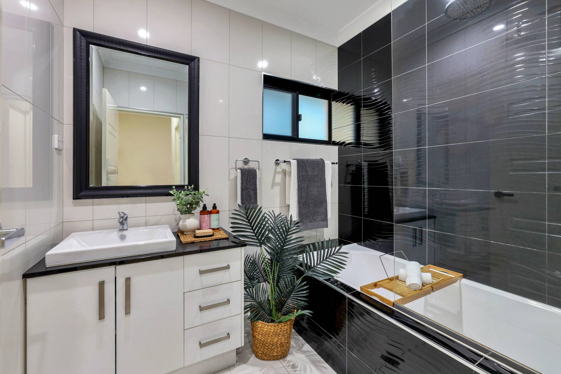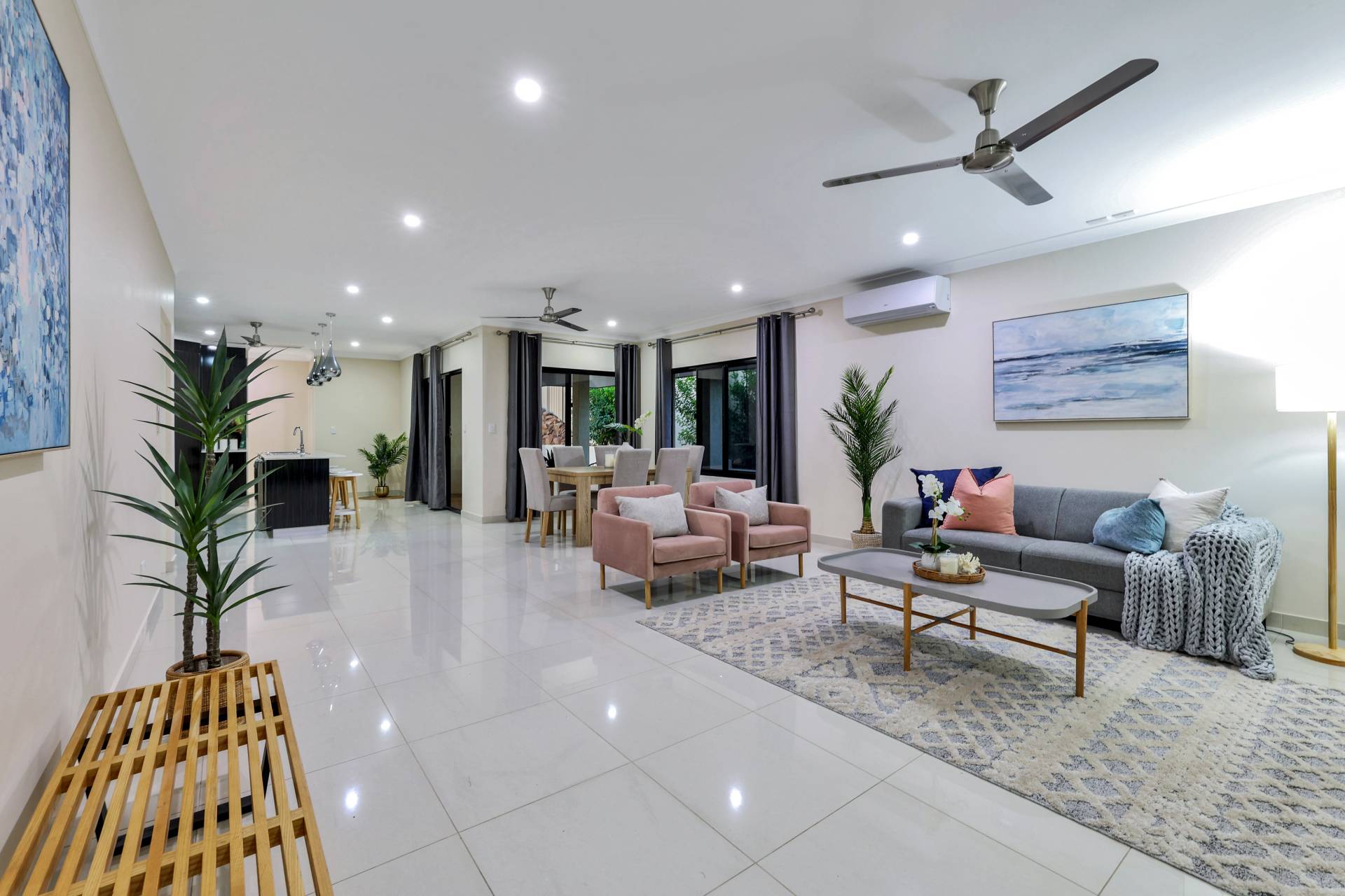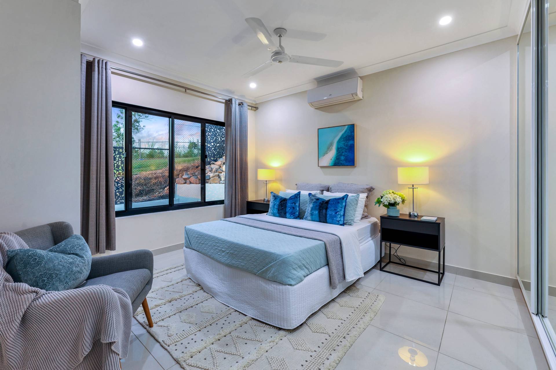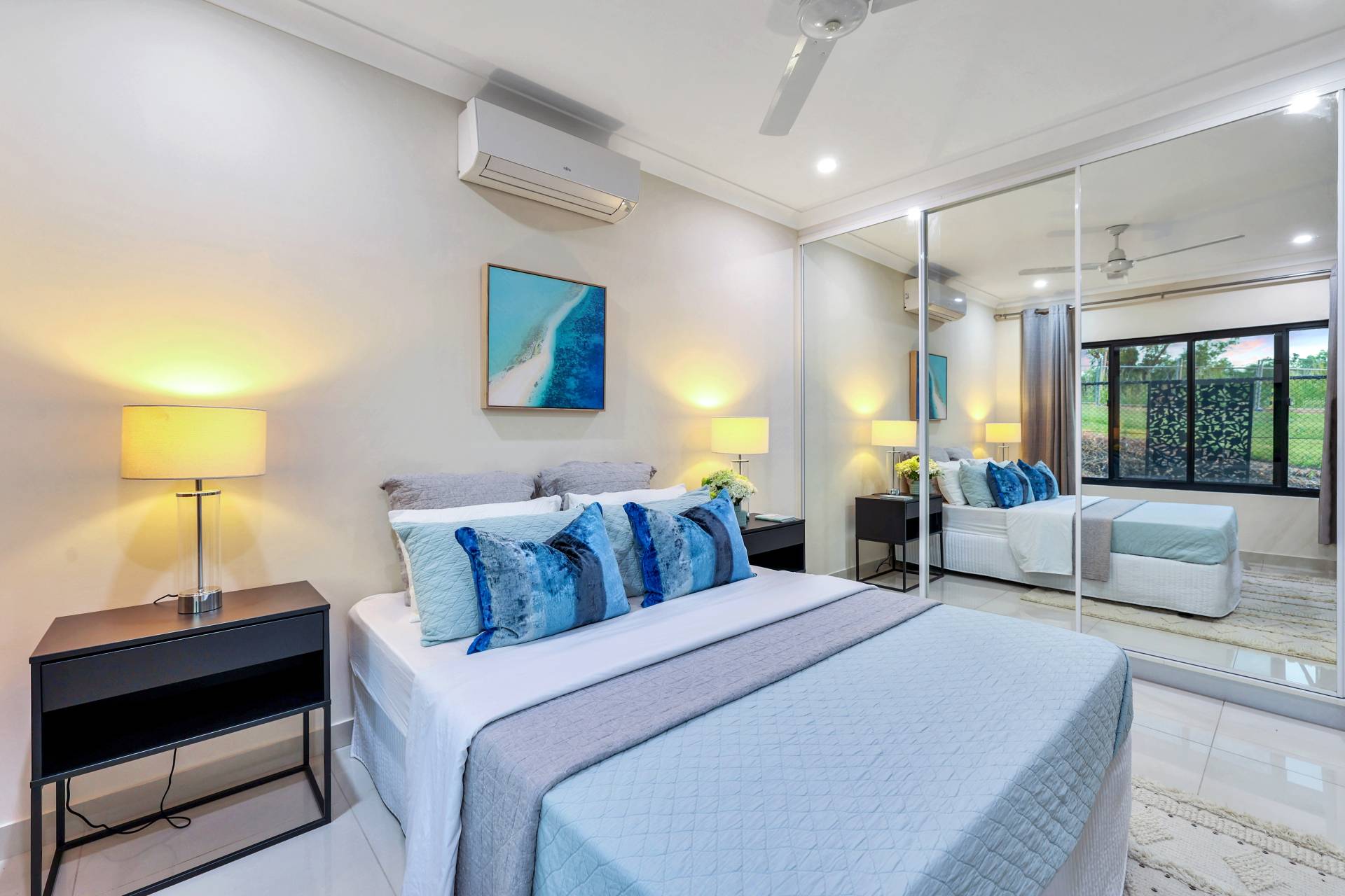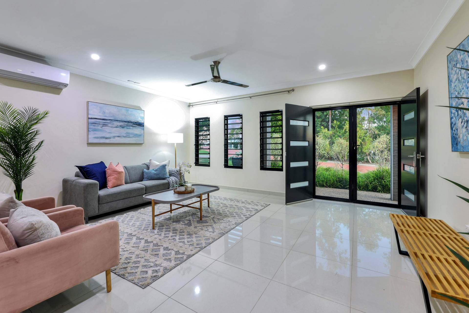 The master bedroom is elegantly appointed with an ensuite bathroom and built in robes while all 4 bedrooms include a built in robe, tiled flooring and A/C as standard. The mina bathroom is sleek and gorgeous with a relaxing bath tub / shower combo, vanity with storage and a full sep W/C.