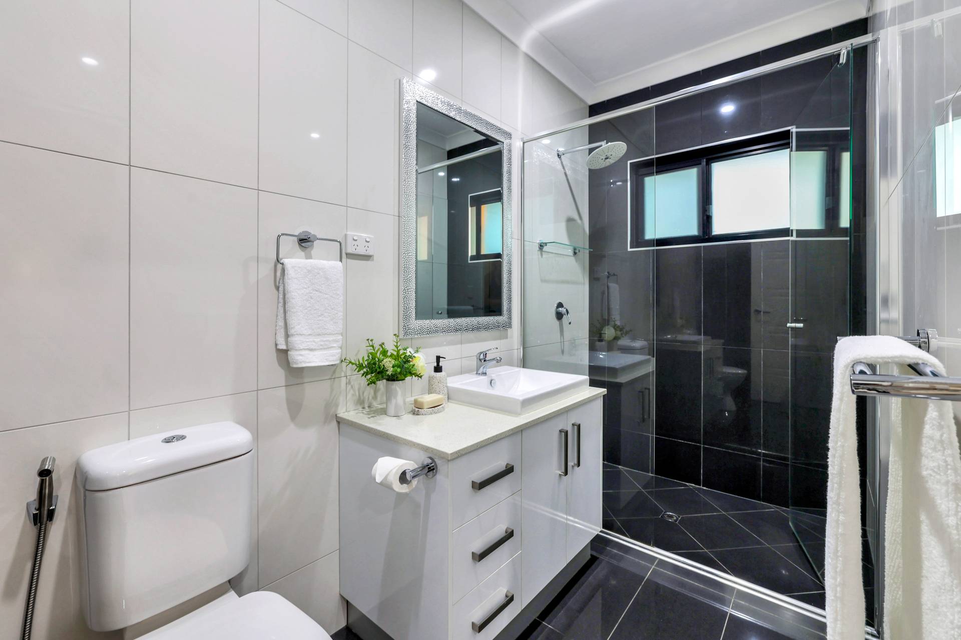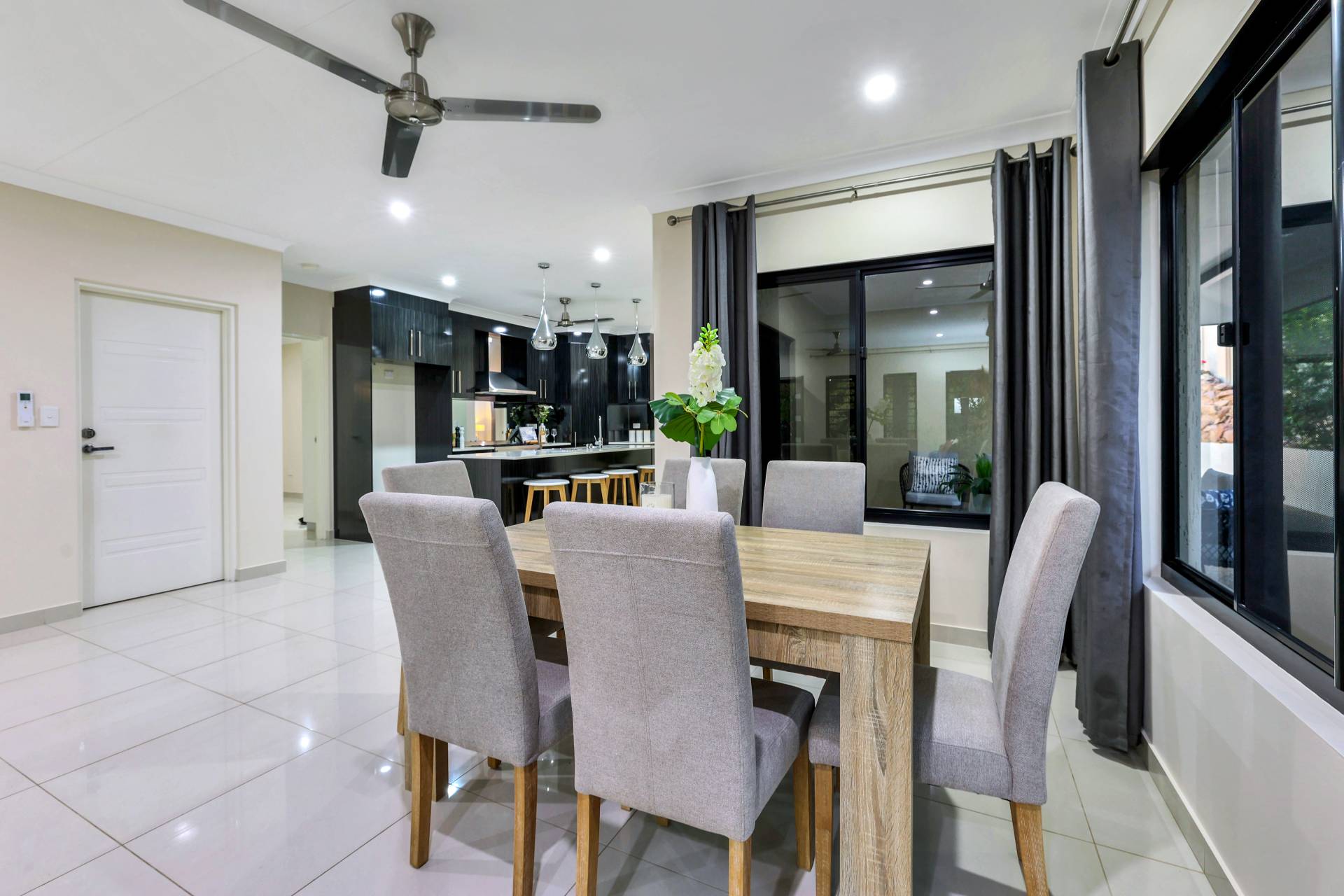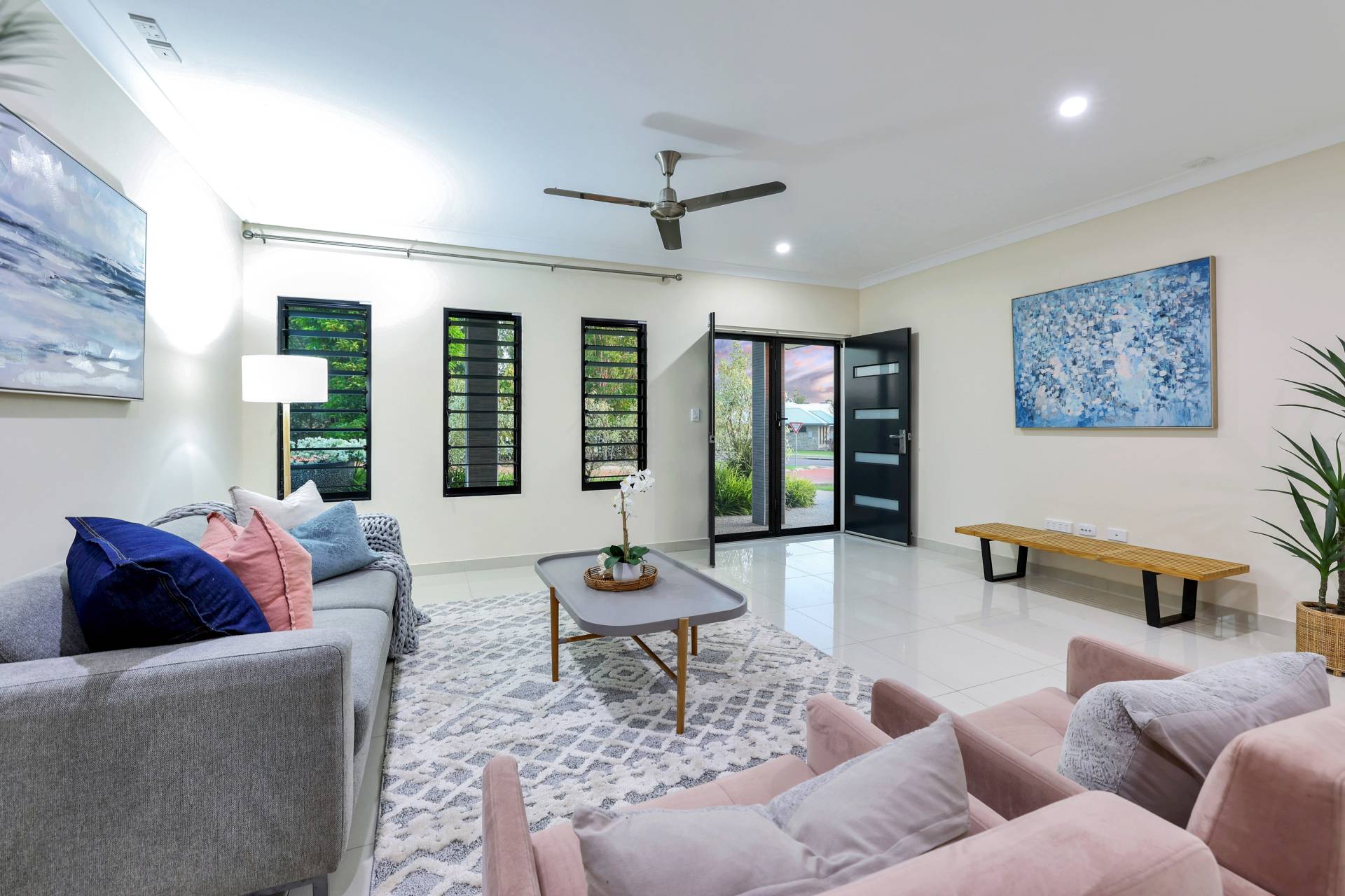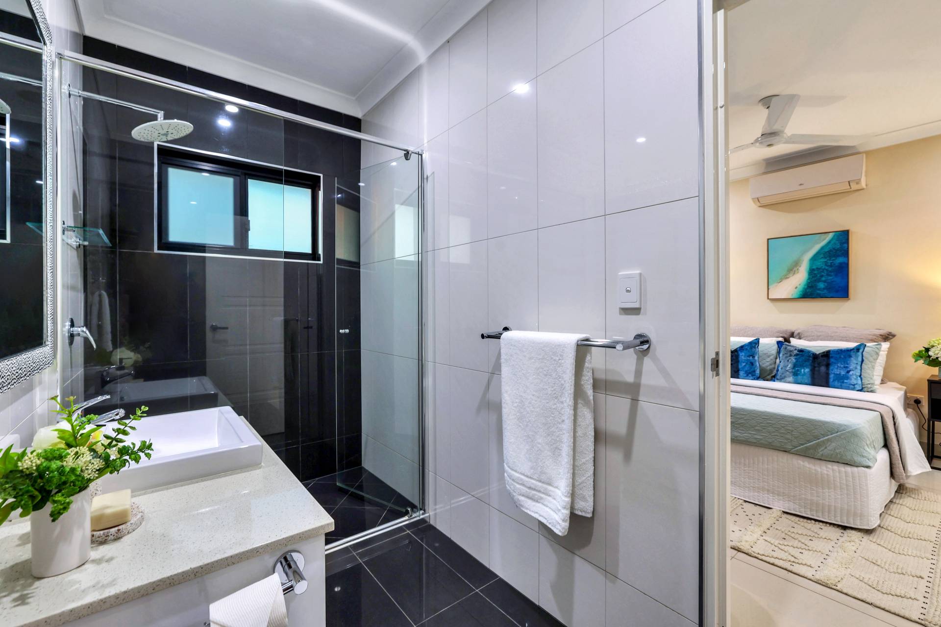 The master bedroom is elegantly appointed with an ensuite bathroom and built in robes while all 4 bedrooms include a built in robe, tiled flooring and A/C as standard. The mina bathroom is sleek and gorgeous with a relaxing bath tub / shower combo, vanity with storage and a full sep W/C.