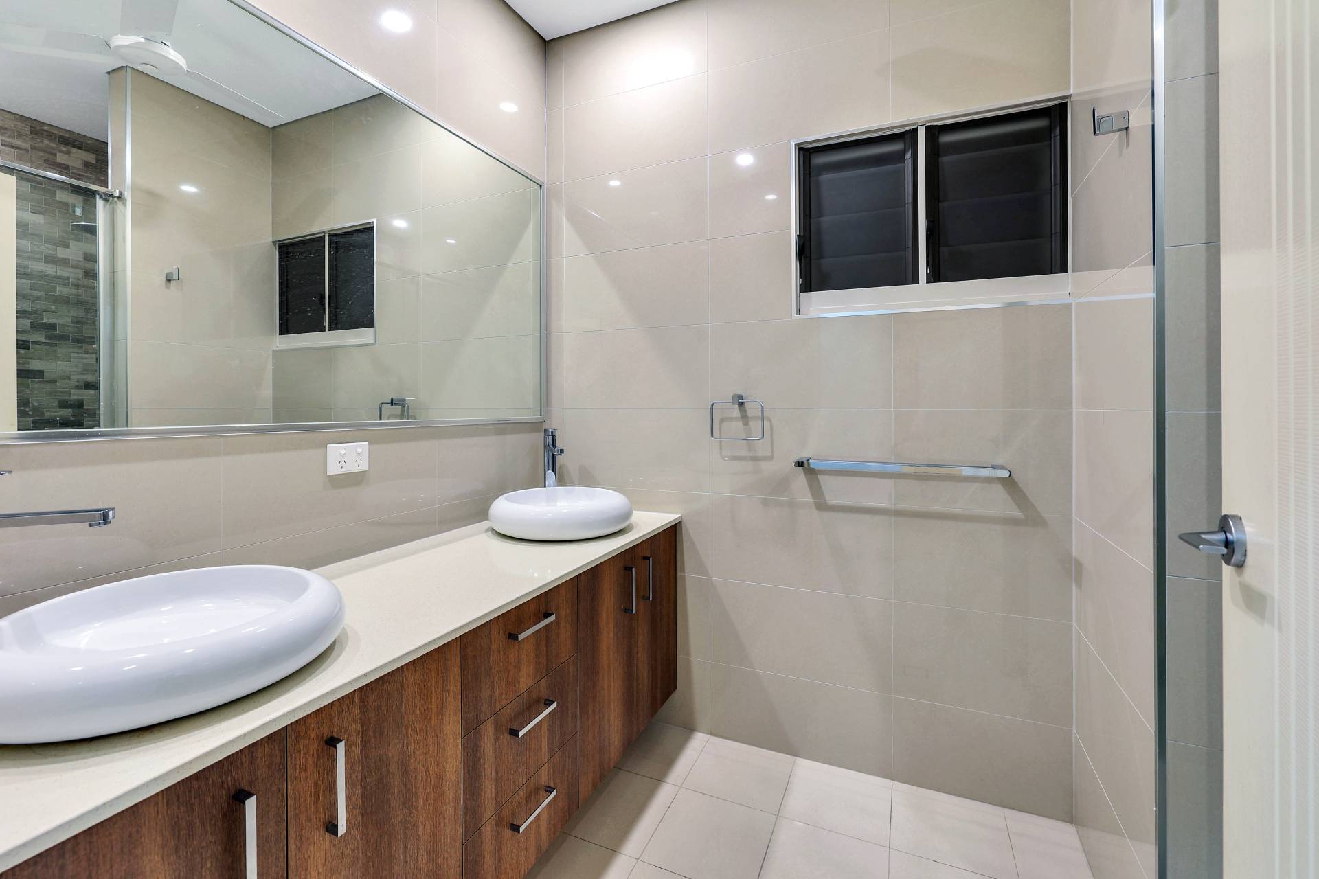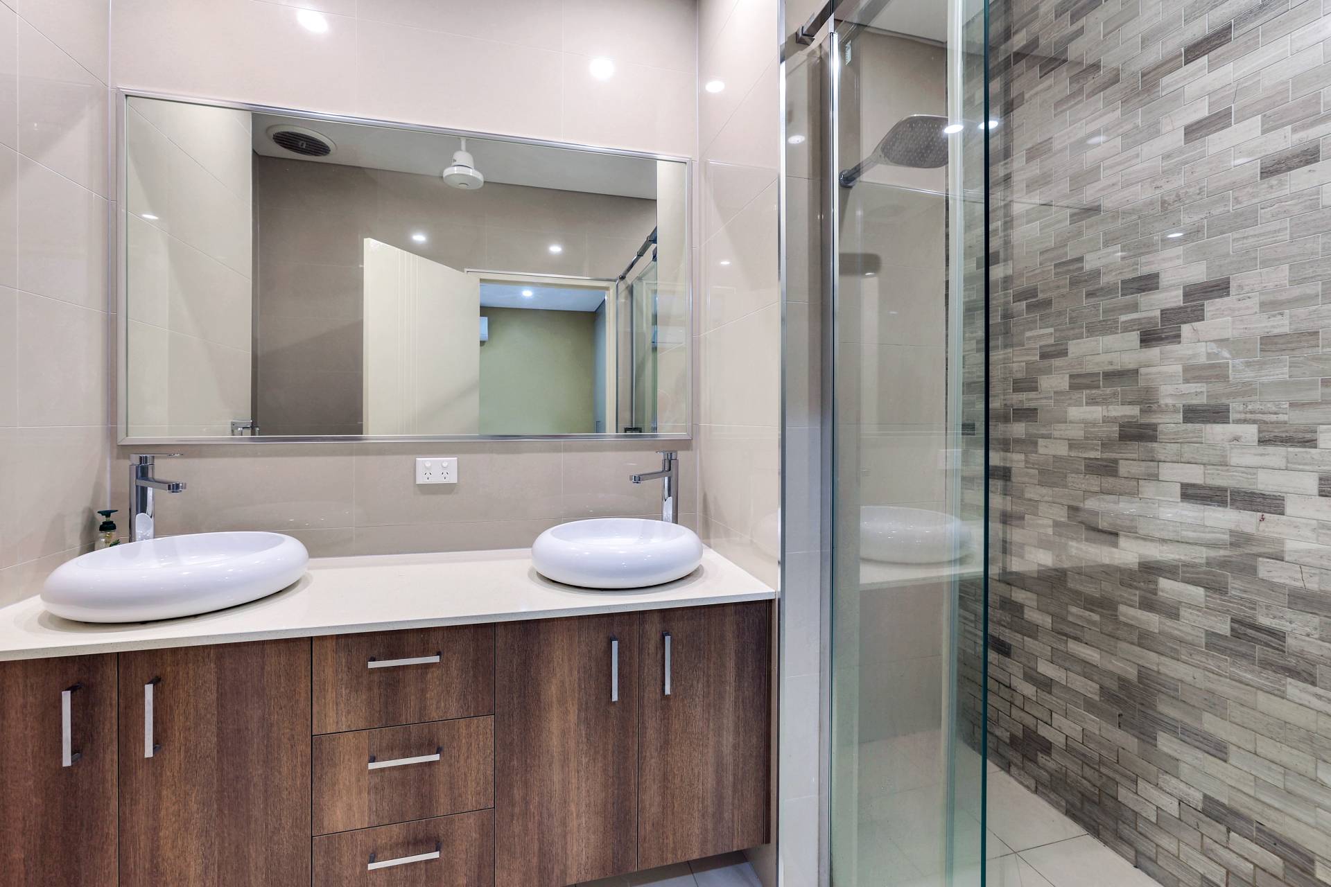 ·Main bathroom has twin vanity, warm timber tones and large shower