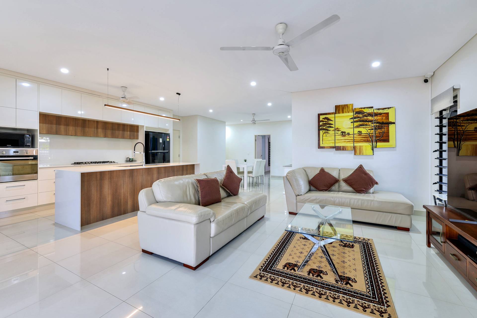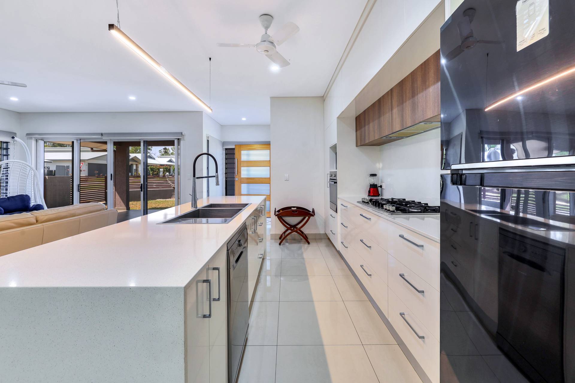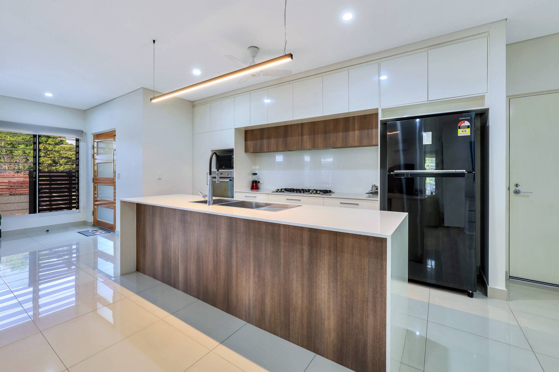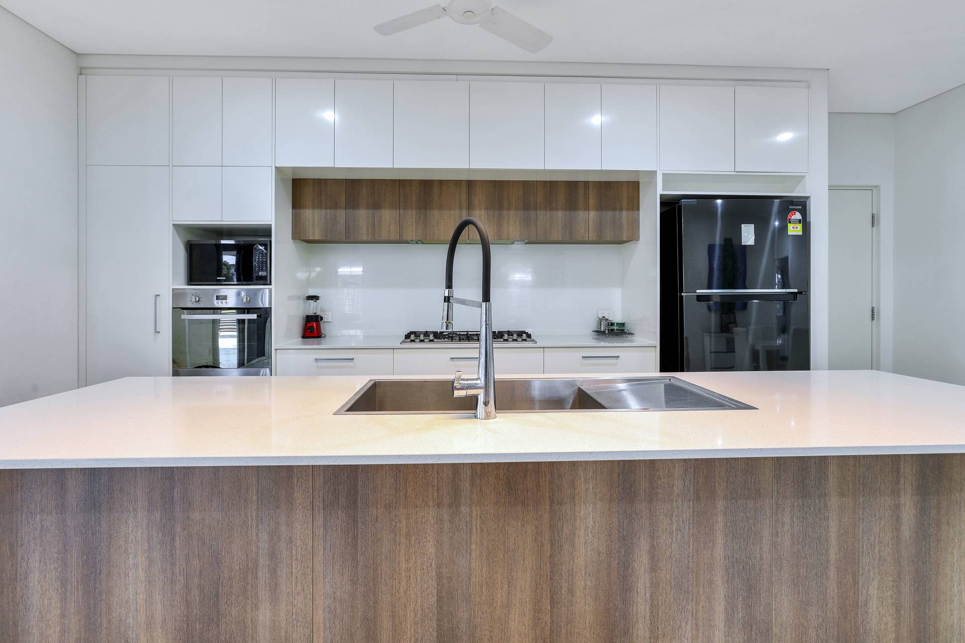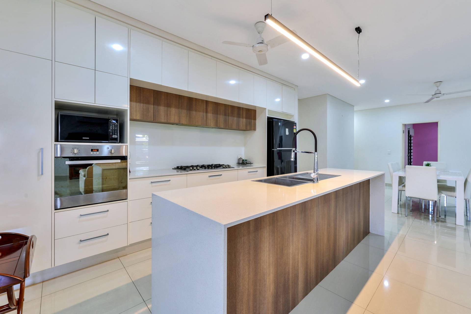 ·Kitchen is sleek and modern with warm timber and contrasting white cabinetry